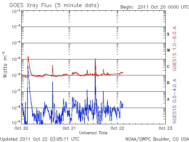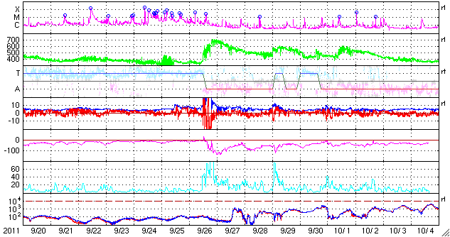 2011/10/21 09:32 3週間ぶりにMクラスのフレアが発生しました。太陽風と磁気圏は穏やかです。