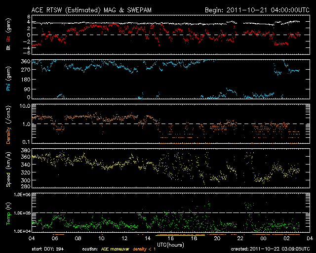 2011/10/18 11:20 太陽風はやや低速になり、オーロラ活動も穏やかです。フレアの発生は弱まっています。