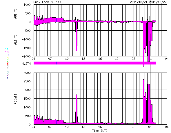 下段のAEグラフの値が高くなると、オーロラ活動が活発化しています。
