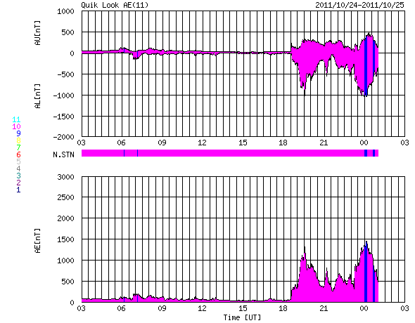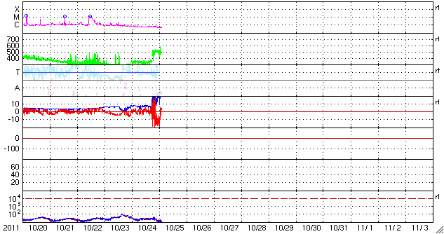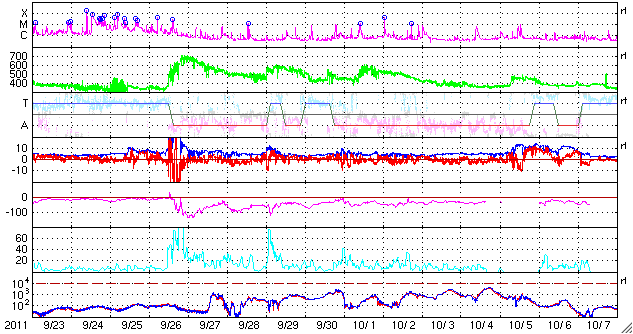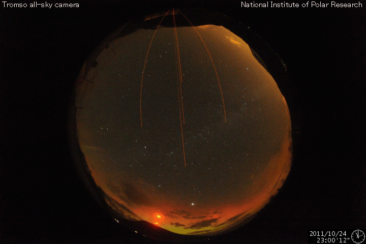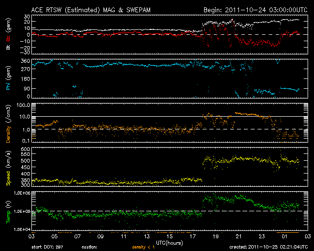 2011/10/25 11:21 更新 CMEによる太陽風の乱れが到来しました。大きな磁気嵐が発生しています。 担当 篠原 22日に発生したCMEによる太陽風の乱れが、 今日の未明、25日3時(世界時24日18時)にACE衛星で観測されました。 太陽風の速度は500km/秒と高速状態に変わり、 磁場強度は20nTに達する強まりとなっています。 注目の磁場の南北成分は、初めの3時間ほどは北寄りの傾向でしたが、 その後、-10〜-15nTと大きく南向きになりました。 4時間ほど続いて、現在は0nT付近に戻っています。 この強い南向き磁場と、高めになった速度が重なって、 強い磁気圏活動が発生しています。 京都大学WDCのDst指数は速報値で-151nTに達する変化を記録し、 大きな磁気嵐が発生しています。 (この値は速報値なので、後に修正される可能性があります) オーロラの活動を表すAE指数は、 700〜1400nTに達する大きな変動を記録しました。 その頃のオーロラの様子を、ノルウェーのトロムソに設置された、 極地研究所の全天カメラの動画で紹介します。 大きな磁気嵐が発生しているため、赤いオーロラがとても目立っています。 ファイルサイズが大きくなって申し訳ありませんが、たっぷりとご覧ください。 太陽風の乱れは、今日から明日にかけて続きそうです。 そして、明日には乱れも弱まっていき、穏やかな状態に戻るでしょう。 その後は、低速の太陽風が続くと思われます。 一方、太陽のフレア活動は穏やかです。 ノルウェーのトロムソで全天カメラにより撮影された、激しいオーロラの様子。 (c) 国立極地研究所、(動画加工 : 宇宙天気ニュース) ![]() Dst指数(速報値)は、-151nTに達しています。 (c) 京都大学 ![]() SDO衛星のAIA193カメラによる太陽コロナの様子 (c) SDO (NASA) ![]() SDO衛星による太陽の可視光写真。マウスの矢印を写真に重ねると、黒点番号付きの写真に切り替わります。 (c) SDO (NASA) ![]() ACEが観測した太陽風の磁場(1番上の枠、白線は全体の強度、赤線は南北成分) および、太陽風の密度(3番目の橙線)、速度(4番目の黄線) (c) NOAA/SWPC ![]() リアルタイムAE指数 下段のAEグラフの値が高くなると、オーロラ活動が活発化しています。 (c) 京都大学, NICT ![]() 27日の太陽周期に合わせたデータプロット 太陽が同じ面を地球に向けていた27日前の変化から、今後を予想することができます。 (c) 作図:宇宙天気ニュース