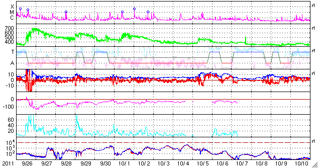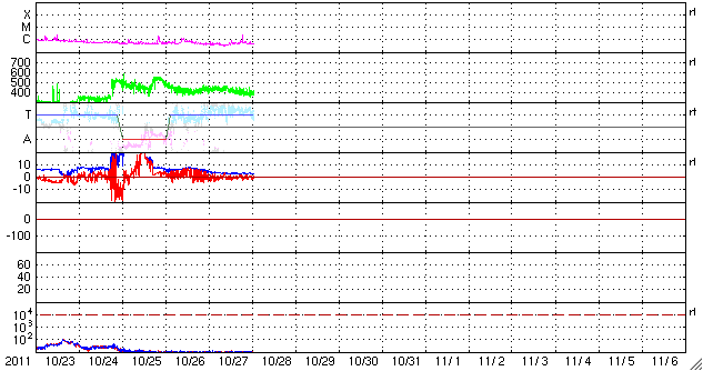 2011/10/26 12:27 CMEによる太陽風の乱れは続きましたが、磁場が北向きになって、磁気圏の乱れは小さくなっています。