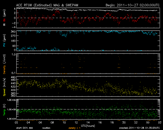 2011/10/25 11:21 CMEによる太陽風の乱れが到来しました。大きな磁気嵐が発生しています。
