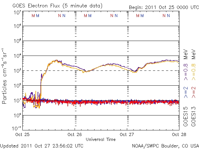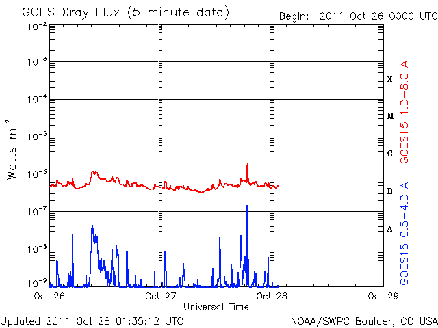 2011/10/27 12:18 太陽で弱いCMEが発生しました。太陽風は平均的な速度で、磁気圏は静かです。