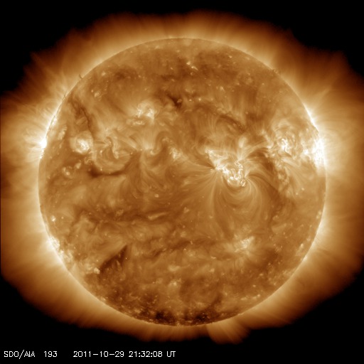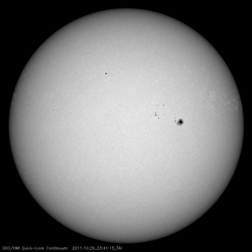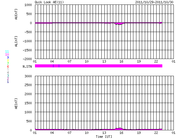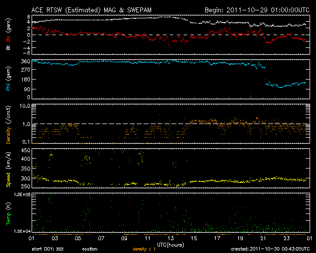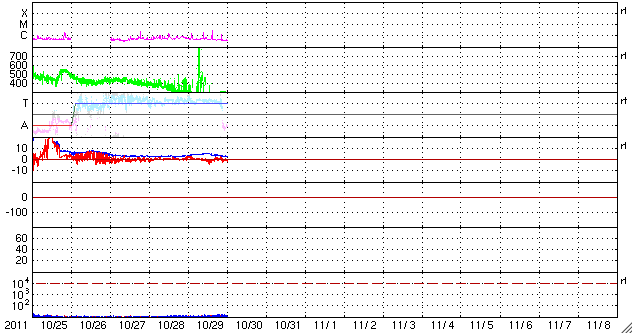 2011/10/30 09:44 更新 太陽風は300km/秒と遅く、磁気圏も静穏です。これからCMEによる乱れが到来しそうです。 担当 篠原 太陽風の速度は、300km/秒とかなり遅い状態が続いています。 磁場強度も、昨夜は5nTに上がったものの、 その後下がって、現在は3nTと弱くなっています。 予想していたコロナホールの影響はまだ見られません。 遅れてやって来るのか、このまま来ないのか注目しています。 また、26日に発生した弱いCMEの影響もそろそろ到来する可能性があります。 太陽風の速度が遅いので、地球まで4日以上かかるとすると、 到来は今夜から明日くらいと見積もられます。 速度の変化は小さいと思いますが、 磁場の強まりが運ばれてくる可能性があります。 これによって太陽風の磁場が大きく南を向いた場合は、 オーロラの活動が強まったり、弱い磁気嵐が発生することが考えられます。 現在の磁気圏は、太陽風が遅いため静穏です。 AE指数は全く変化していません。 太陽では、C1〜3の小規模フレアが5回発生しています。 西の端の1324、1325黒点群で3回、 残りの2回は東の端の活動とのことです。 STEREO Behindによると、 東端の向こう側の南北にそれぞれ活動領域が見られます。 どの様な領域なのか、今後に注目してください。 SDO衛星のAIA193カメラによる太陽コロナの様子 (c) SDO (NASA) ![]() SDO衛星による太陽の可視光写真。マウスの矢印を写真に重ねると、黒点番号付きの写真に切り替わります。 (c) SDO (NASA) ![]() ACEが観測した太陽風の磁場(1番上の枠、白線は全体の強度、赤線は南北成分) および、太陽風の密度(3番目の橙線)、速度(4番目の黄線) (c) NOAA/SWPC ![]() リアルタイムAE指数 下段のAEグラフの値が高くなると、オーロラ活動が活発化しています。 (c) 京都大学, NICT ![]() 27日の太陽周期に合わせたデータプロット 太陽が同じ面を地球に向けていた27日前の変化から、今後を予想することができます。 (c) 作図:宇宙天気ニュース