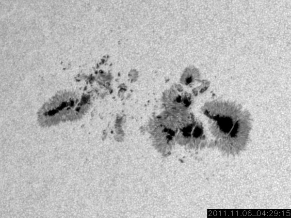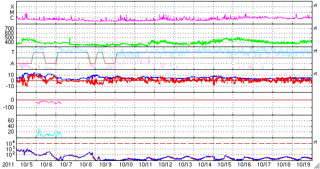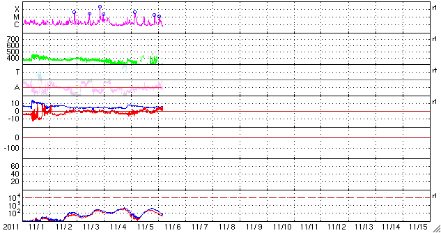 2011/11/ 6 14:10 更新 1339黒点群では、Mクラスのフレアが繰り返し発生しています。磁気圏は静穏です。 担当 篠原 昨日のニュース以降、1339黒点群で、 Mクラスの中規模フレアが繰り返し発生しています。 5日12時(世界時5日3時)にM3.7、 5日20時(世界時5日11時)にM1.1、 6日5時半(世界時5日20時半)にM1.8、 6日10時(世界時6日1時)にM1.2の4つです。 1339黒点群は、大きくて複雑な形を保っています(1枚目に掲載)。 今後もMクラスや、Xクラスなどの大きなフレアが発生する可能性があります。 また、南半球側の1338黒点群や、 東端の活動領域でもフレア活動が見られ、 太陽は様々な場所で活動が発生しています。 また、太陽から北寄りにCME(太陽ガスの放出現象)が噴き上がっています。 フィラメント噴出によるものの様です。 SOHO LASCO C3の動画(青)では、太陽の上側を囲む様に広がっています。 STEREO Aheadの動画(赤)では、ガスは左上に向かって噴き上がっています。 STEREO Aheadの写真では、地球は左の横方向にあるので、 CMEの濃い部分は地球とはやや外れた方向に向かっています。 噴出の速度も遅いので、4日後の9日くらいの太陽風に、 多少影響が見られるかもしれません。 太陽風は、速度は300km/秒を割り、かなり遅くなっています。 磁場強度は6nTと平均的な強さで安定しています。 コロナホールの影響は特になく、静かな太陽風が続いています。 磁気圏活動も静穏だと思われますが、AE指数のグラフは真っ白です。 データ処理過程のどこかが止まっている様です。 太陽風は、今後も穏やかな状態が続き、 磁気圏も静かでしょう。 また、太陽放射線は、ゆっくりと低下しています。 SDO衛星による1339黒点群の拡大写真。 (c) SDO (NASA) ![]() 太陽の北寄りに噴出するCME。STEREO Aheadからは左方向に地球がある。 (c) SOHO (ESA & NASA)、STEREO (NASA)、(動画加工 : 宇宙天気ニュース) ![]() SDO衛星のAIA193カメラによる太陽コロナの様子 (c) SDO (NASA) ![]() SDO衛星による太陽の可視光写真。マウスの矢印を写真に重ねると、黒点番号付きの写真に切り替わります。 (c) SDO (NASA) ![]() GOES衛星の太陽X線データ (c) NOAA/SWPC ![]() ACEが観測した太陽風の磁場(1番上の枠、白線は全体の強度、赤線は南北成分) および、太陽風の密度(3番目の橙線)、速度(4番目の黄線) (c) NOAA/SWPC ![]() リアルタイムAE指数 下段のAEグラフの値が高くなると、オーロラ活動が活発化しています。 (c) 京都大学, NICT ![]() 27日の太陽周期に合わせたデータプロット 太陽が同じ面を地球に向けていた27日前の変化から、今後を予想することができます。 (c) 作図:宇宙天気ニュース