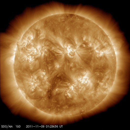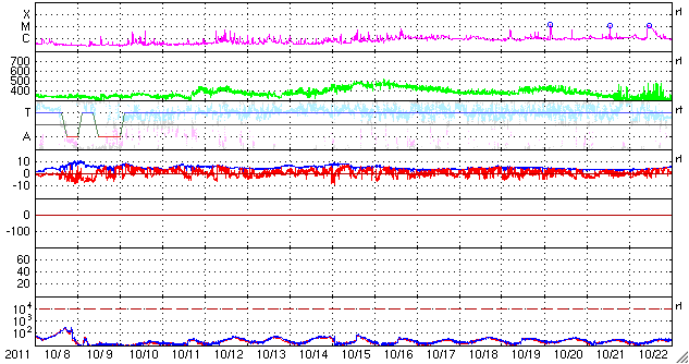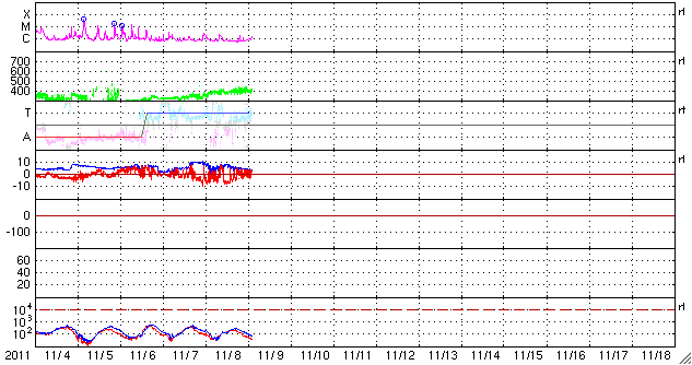 2011/11/ 9 11:32 更新 太陽は比較的穏やかな状態です。太陽風も平均的な速度で、磁気圏も穏やかです。 担当 篠原 太陽には今日も黒点がたくさん見えていますが、 フレアの活動は落ち着いています。 昨日のニュースの直前、8日8時(世界時7日23時)に、 C3.2の小規模フレアが発生しましたが、 その後は、C2.6、C1.8とより小さなフレアが発生した程度です。 (X線グラフで見ると、ちょうど今C2のフレアが発生している様です) 1339黒点群と1338黒点群は、どちらも規模が縮小しているそうで、 太陽は、このまま静かな状態が続きそうです。 太陽風は、速度がゆっくりと上がって、 400km/秒と平均的な速さになっています。 磁場強度は、昨日発生していた強まりは終わって、 現在は5nTと平均的な強さです。 この後も、太陽風は穏やかな状態が続くと思われます。 オーロラの活動度を表すAE指数は、 2回ほど500nT近い変化を記録しています。 これは、太陽風磁場の南北成分が、 一時的に-5nTとまとまった南向きになった影響です。 基本的には、磁気圏も穏やかです。 SDO衛星のAIA193カメラによる太陽コロナの様子 (c) SDO (NASA) ![]() SDO衛星による太陽の可視光写真。マウスの矢印を写真に重ねると、黒点番号付きの写真に切り替わります。 (c) SDO (NASA) ![]() GOES衛星の太陽X線データ (c) NOAA/SWPC ![]() ACEが観測した太陽風の磁場(1番上の枠、白線は全体の強度、赤線は南北成分) および、太陽風の密度(3番目の橙線)、速度(4番目の黄線) (c) NOAA/SWPC ![]() リアルタイムAE指数 下段のAEグラフの値が高くなると、オーロラ活動が活発化しています。 (c) 京都大学, NICT ![]() 27日の太陽周期に合わせたデータプロット 太陽が同じ面を地球に向けていた27日前の変化から、今後を予想することができます。 (c) 作図:宇宙天気ニュース