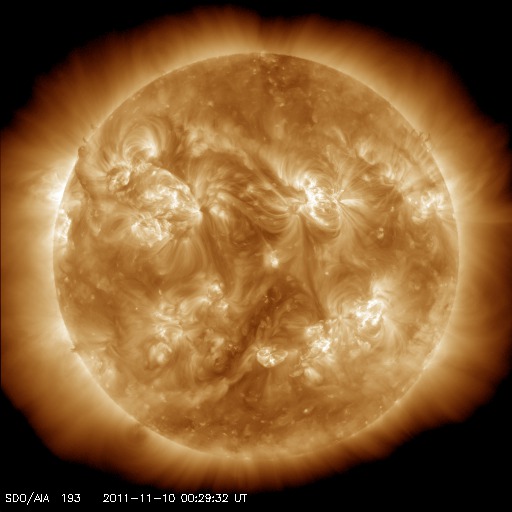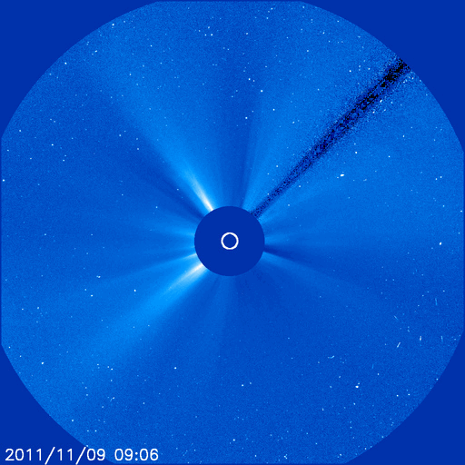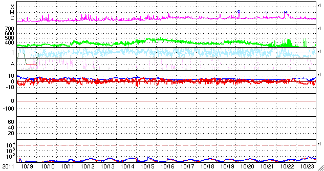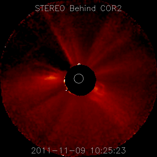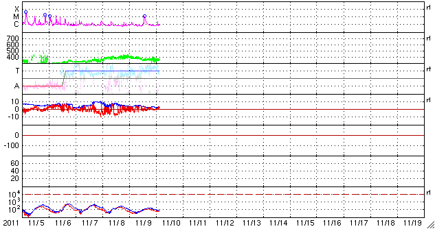 2011/11/10 12:24 更新 太陽でM1のフレアが発生し、CMEが噴出しています。太陽風、磁気圏は静穏です。 担当 篠原 太陽面は今日も黒点群がいっぱいです。 今日は、一番南(下)に、1345黒点群が出現しています。 しかし、フレアの活動はあまり活発ではなく、 昨夜、9日22時(世界時9日13時)にM1.1の中規模フレアが発生した程度です。 場所は、太陽の北東(左上)にある1342黒点群と1343黒点群の間です。 このフレアに伴って、CME(太陽ガスの放出現象)も発生しています。 この日は、その数時間前にも太陽の南東(左下)でフィラメントの噴出が発生して、 それによるCMEも起きています。 GOES衛星のX線カメラと、 SOHO衛星LASCO C3、STEREO Behind衛星のCOR1による動画を掲載します。 X線カメラの動画では、初めに左下で淡い光の帯が発生し、 続いて左上でフレアの明るい輝きが発生します。 この変化に対応して、SOHO LASCO C3では、 左下、続いて右上にと2つのCMEの噴出が撮影されています。 特に2つめのCMEは、太陽全体を広く包む様に広がるFull Halo型のCMEになっていて、 その影響は地球へもやって来ると思われます。 3〜4日後と考えると、 12日の夜から13日にかけて太陽風の乱れが到来する可能性があります。 STEREO Behindは、太陽を左横から見ています。 従って、STEREO Behindの写真では、地球は右方向にあります。 2つのCMEは、どちらも地球のある右方向に噴き出しています。 それぞれ下寄り、上寄りに噴き出していて、方向の違いもよく分かります。 現在の様に、黒点群が多数あるということは、 今後もこの様なフレアやCMEの発生が考えられるということです。 一方、太陽風、磁気圏はとても穏やかです。 太陽風は、速度は360km/秒とより低速になり、 磁場強度も3nT前後に弱まっています。 磁気圏のオーロラ活動もほとんど見られず、 AE指数のグラフは全く変化していません。 SDO AIA193では、コロナホールもなく、 明日くらいまでは、穏やかな太陽風が続きそうです。 その後、CMEの影響がやって来る可能性があります。 GOES-15衛星のX線カメラによる、フィラメント噴出とM1.1フレア。 (c) NOAA/SWPC 、(動画加工 : 宇宙天気ニュース) ![]() SOHO LASCO C3による、2つのCMEの噴出。 (c) SOHO (ESA & NASA)、 (動画加工 : 宇宙天気ニュース) ![]() STEREO Behindから見たCME。地球のある右側に噴き出しています。 (c) STEREO (NASA)、 (動画加工 : 宇宙天気ニュース) ![]() SDO衛星のAIA193カメラによる太陽コロナの様子 (c) SDO (NASA) ![]() SDO衛星による太陽の可視光写真。マウスの矢印を写真に重ねると、黒点番号付きの写真に切り替わります。 (c) SDO (NASA) ![]() GOES衛星の太陽X線データ (c) NOAA/SWPC ![]() ACEが観測した太陽風の磁場(1番上の枠、白線は全体の強度、赤線は南北成分) および、太陽風の密度(3番目の橙線)、速度(4番目の黄線) (c) NOAA/SWPC ![]() リアルタイムAE指数 下段のAEグラフの値が高くなると、オーロラ活動が活発化しています。 (c) 京都大学, NICT ![]() 27日の太陽周期に合わせたデータプロット 太陽が同じ面を地球に向けていた27日前の変化から、今後を予想することができます。 (c) 作図:宇宙天気ニュース