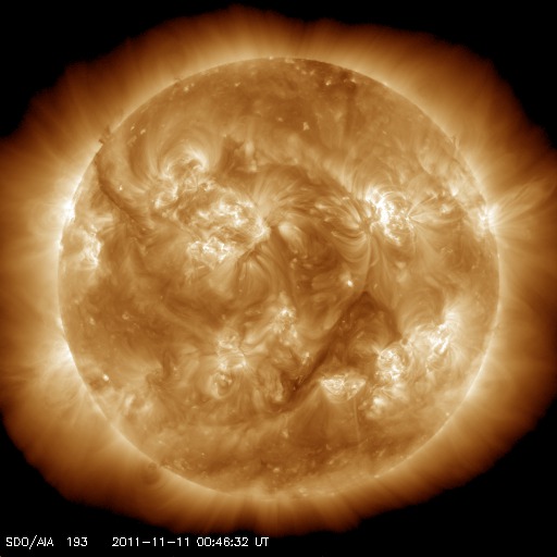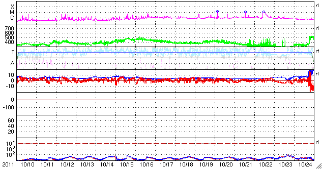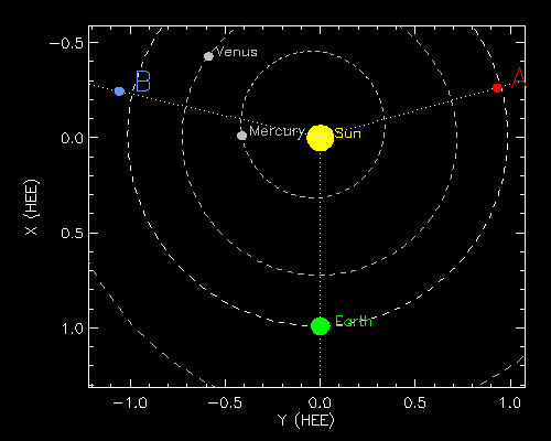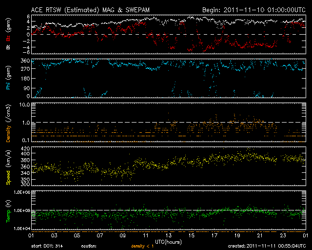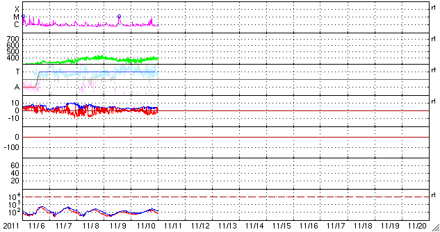 2011/11/11 09:55 更新 太陽でCクラスのフレアが発生しています。太陽風、磁気圏は静穏です。 担当 篠原 このニュースでよく参照しているSTEREO衛星の、 現在の位置を確認しましょう。 左のリンクで紹介している STEREOのデータページに入ると、 ページの左側に " where is stereo? " というリンクがあります。 ここで、2機のSTEREO衛星の現在の位置を知ることができます。 今日の衛星の位置を下に掲載します。 中心の黄色い丸は太陽です。 下に地球(緑色の丸)があります。 そして、地球の公転軌道(破線)に沿って目を向けると、 右手(地球の公転よりも先行して)にAhead衛星(赤色の丸)があり、 左手(地球の公転よりも遅れて)にBehind衛星(青色の丸)があります。 Ahead衛星から太陽を見ると、地球は太陽よりも左側にあり、 Behind衛星から太陽を見ると、地球は太陽よりも右側にあることが この図から分かります。 (図の中で上下を決めて話しています) 現在のSTEREO衛星は、 地球から見ると太陽に対して90度を通り過ぎた位置にあります。 STEREOのデータを参照するときは、「太陽を横から見て」と書いていますが、 今後は、次第に「太陽を向こう側から見ると」 という書き方に変わって行くことになるのです。 現在の宇宙天気についてですが、 太陽では、C2.1、C2.2、C6.0などの小規模フレアが発生しています。 特に大きなものはありませんが、 X線の動画を見ると、 あちこちにある黒点群で、 小さなフレア活動が頻繁に起きていることが分かります。 規模は小さなものばかりですが、黒点が多くあると、 この様な活動も活発に起きているのです。 太陽風は、速度が350km/秒から380km/秒に上がり、 低速の状態ですが、少し変化しています。 磁場強度は4〜5nTと、平均的な強さに戻っています。 磁場の南北成分は、図の中ほどで-4nTほどの南向きになっていますが、 AE指数の変化はとても小さく、 目立ったオーロラ活動は観測されていません。 太陽風は今日も穏やかな状態が続きそうですが、 明日以降、小規模のCMEの影響で、 ある程度の擾乱がやって来る可能性があります。 2機のSTEREO衛星、Ahead(赤丸)とBehind(青丸)の現在の位置。黄色は太陽、緑は地球を示す。 (c) STEREO (NASA) ![]() SDO衛星のAIA193カメラによる太陽コロナの様子 (c) SDO (NASA) ![]() SDO衛星による太陽の可視光写真。マウスの矢印を写真に重ねると、黒点番号付きの写真に切り替わります。 (c) SDO (NASA) ![]() GOES衛星の太陽X線データ (c) NOAA/SWPC ![]() ACEが観測した太陽風の磁場(1番上の枠、白線は全体の強度、赤線は南北成分) および、太陽風の密度(3番目の橙線)、速度(4番目の黄線) (c) NOAA/SWPC ![]() リアルタイムAE指数 下段のAEグラフの値が高くなると、オーロラ活動が活発化しています。 (c) 京都大学, NICT ![]() 27日の太陽周期に合わせたデータプロット 太陽が同じ面を地球に向けていた27日前の変化から、今後を予想することができます。 (c) 作図:宇宙天気ニュース