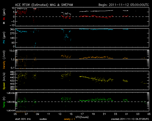 2011/11/12 13:17 太陽風はやや低速で、磁気圏も穏やかです。今後、CMEの乱れが到来しそうです。