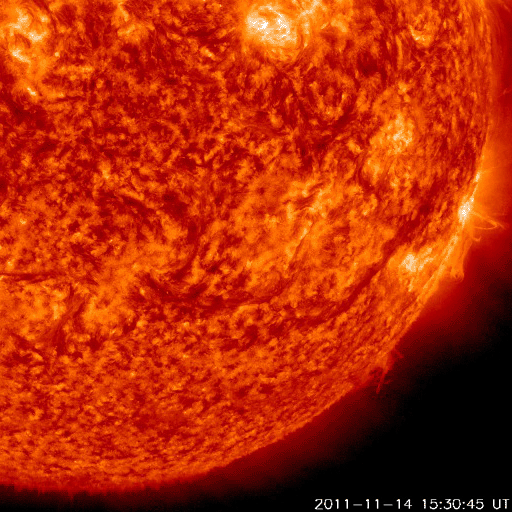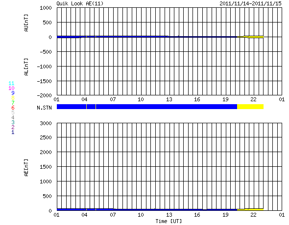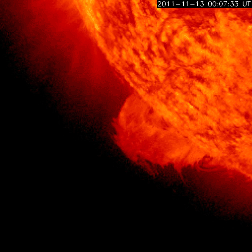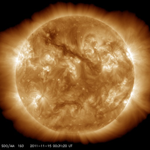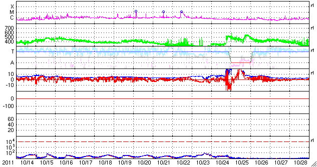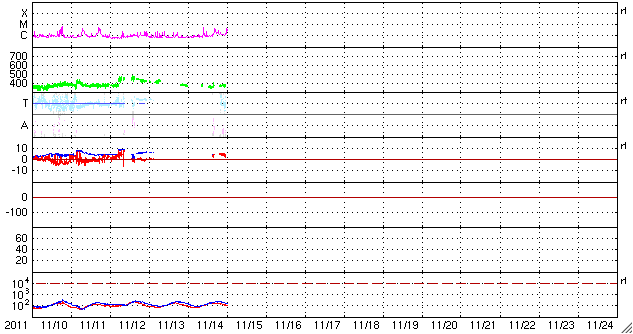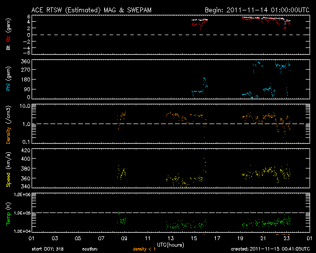 2011/11/15 09:41 更新 太陽ではCクラスのフレア活動が続いています。太陽風は低速で、磁気圏も穏やかです。 担当 篠原 3日ほど前から、南東(左下)の端に大きなプロミネンスが見えています。 SDO衛星AIA304による、13〜14日の2日間の様子を動画にして掲載します。 とても巨大なプラズマのかたまりです。 最後に噴き上がるような動きをしていますが、この後どうなるでしょうか。 太陽では、北西(右上)に新しく現われた1348黒点群でC5.2の小規模フレアが発生し、 その後、すぐ隣の1342黒点群でC4.2の長時間型の小規模フレアが発生しています。 また、南西(右下)側でフィラメントの噴出が発生しています。 SDO衛星AIA304カメラで噴き上がる様子が見えています(2枚目の動画)。 これに続いてCME(太陽ガスの放出現象)も発生しました。 STEREO Ahead衛星のCOR2カメラによる動画を続けています。 この写真では地球は左側にあります。 噴出は斜め下の方向ですが、いくらか影響がやって来るかもしれません。 太陽風は、ようやくACE衛星のデータが戻ってきました。 速度は370km/秒とやや低速で、磁場強度は5nTと平均的な強さです。 磁場の南北成分は北向きで推移していて、磁気圏への影響は小さそうです。 AE指数も全く変化は見えず、磁気圏はとても静かです。 今後も低速の穏やかな太陽風が続き、磁気圏も静穏でしょう。 SDO衛星AIA193カメラによる、太陽南東端の巨大なプロミネンス。 (c) SDO (NASA)、 (動画加工 : 宇宙天気ニュース) ![]() SDO AIA304によるフィラメント噴出の様子と、STEREO Ahead COR2による地球のある左方向へのCMEの噴出。 (c) SDO (NASA)、STEREO (NASA)、 (動画加工 : 宇宙天気ニュース) ![]() SDO衛星のAIA193カメラによる太陽コロナの様子 (c) SDO (NASA) ![]() SDO衛星による太陽の可視光写真。マウスの矢印を写真に重ねると、黒点番号付きの写真に切り替わります。 (c) SDO (NASA) ![]() GOES衛星の太陽X線データ (c) NOAA/SWPC ![]() ACEが観測した太陽風の磁場(1番上の枠、白線は全体の強度、赤線は南北成分) および、太陽風の密度(3番目の橙線)、速度(4番目の黄線) (c) NOAA/SWPC ![]() リアルタイムAE指数 下段のAEグラフの値が高くなると、オーロラ活動が活発化しています。 (c) 京都大学, NICT ![]() 27日の太陽周期に合わせたデータプロット 太陽が同じ面を地球に向けていた27日前の変化から、今後を予想することができます。 (c) 作図:宇宙天気ニュース