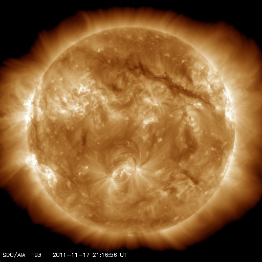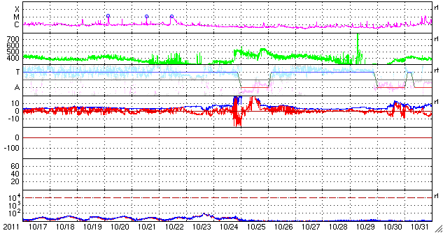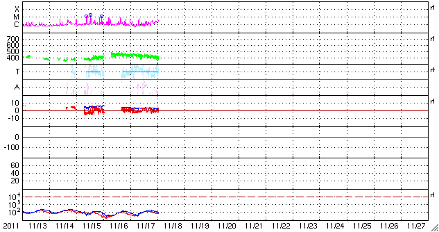 2011/11/18 10:24 更新 Cクラスのフレアの発生は続いています。太陽風は穏やかです。 担当 篠原 太陽では、Cクラスの小規模フレアの発生が続いています。 昨日に比べると規模は少し小さくなり、 C6.0が1回と、その他はC1〜3の小さなものばかりです。 太陽の中心から南寄りの1346黒点群と、南東端近くの1352群が活発で、 これに加えて、東の端の向こう側にある活動領域も X線のカメラでは明るく輝いています。 18日5時(世界時17日20時)には、ここでフレアが発生し、 続いてCMEの噴出も起きています。 GOES衛星のX線カメラと、SOHO衛星のLASCO C2カメラの画像でその様子をご覧ください。 地球からは横方向に噴き出しているため、影響が来ることはありませんが、 今後、この領域がこちら側に顔を出したときに、 どのような活動を起こすのか注目して下さい。 昨日の太陽風は、450km/秒とやや高速でしたが、 その後ゆっくりと低下して、現在は400km/秒と平均的な速度に落ち着いています。 磁場強度は4nTから3nTヘ下がり、弱まっています。 穏やかな太陽風のため、磁気圏も静穏で、 AE指数はほとんど変化していません。 磁気圏の活動については、静かな期間が続いています。 11月1日頃に活発なオーロラが発生した後は、ずっと穏やかです。 太陽の東端でフレアが発生し、続いてCMEが噴出しています。GOES SXIとSOHO LASCO C2による動画。 (c) NOAA/SWPC 、SOHO (ESA & NASA)、(動画加工 : 宇宙天気ニュース) ![]() SDO衛星のAIA193カメラによる太陽コロナの様子 (c) SDO (NASA) ![]() SDO衛星による太陽の可視光写真。マウスの矢印を写真に重ねると、黒点番号付きの写真に切り替わります。 (c) SDO (NASA) ![]() GOES衛星の太陽X線データ (c) NOAA/SWPC ![]() ACEが観測した太陽風の磁場(1番上の枠、白線は全体の強度、赤線は南北成分) および、太陽風の密度(3番目の橙線)、速度(4番目の黄線) (c) NOAA/SWPC ![]() リアルタイムAE指数 下段のAEグラフの値が高くなると、オーロラ活動が活発化しています。 (c) 京都大学, NICT ![]() 27日の太陽周期に合わせたデータプロット 太陽が同じ面を地球に向けていた27日前の変化から、今後を予想することができます。 (c) 作図:宇宙天気ニュース