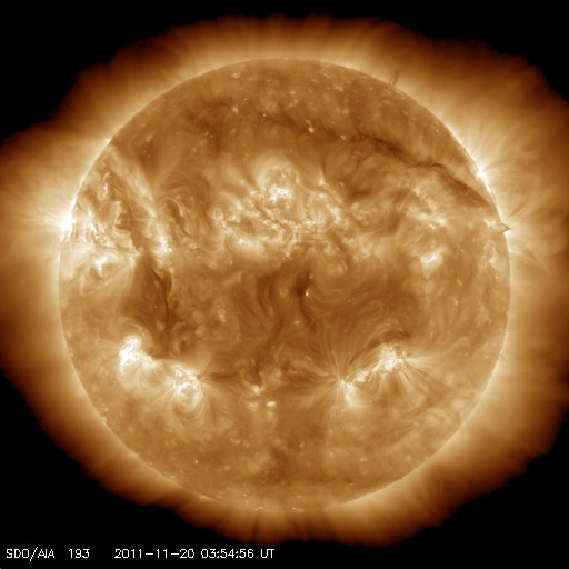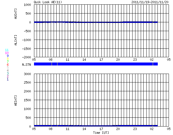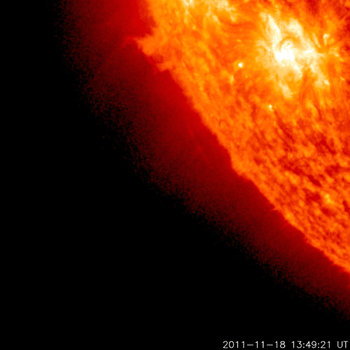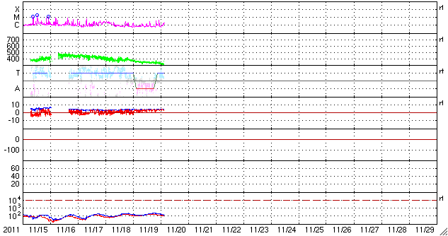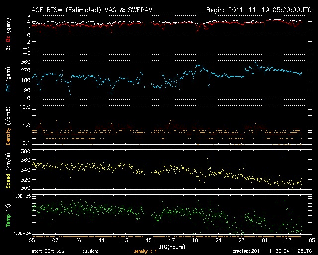 2011/11/20 13:11 更新 太陽のCクラスフレアは続いています。太陽風、磁気圏は静穏です。 担当 篠原 2日前の現象ですが、太陽の南東(左下)の端に、 大きなプロミネンスが発生していました。 きれいなループが浮かび上がる様子を、SDO衛星のAIA304の動画で紹介します。 この写真では、地球の大きさは右下の時刻の数字より一回り大きいくらいです。 太陽で起きている現象は非常に巨大です。 太陽では、Cクラスの小規模フレアが続いています。 大きいものでは、C3.9、C4.5のフレアがあり、その他はC1〜2程度です。 活動を起こしているのは、南東の1354群と、東端の新しい活動領域などです。 活動の規模は大きくありませんが、引き続き注目してください。 太陽風と磁気圏はとても穏やかです。 太陽風の速度(ACEの黄色線)は350km/秒から310km/秒に低下して、 かなり遅くなっています。 磁場強度(白線)は4nT付近で安定しています。 磁場はずっと北向きに振れていて(赤線がずっとプラス側)、 このため、オーロラの活動度を示すAE指数は全く変化していません。 穏やかな太陽風は今後も続きそうで、 オーロラの観望には厳しい期間が続きます。 SDO衛星のAIA304カメラによる、太陽南東のプロミネンス。 (c) SDO (NASA)、 (動画加工 : 宇宙天気ニュース) ![]() SDO衛星のAIA193カメラによる太陽コロナの様子 (c) SDO (NASA) ![]() SDO衛星による太陽の可視光写真。マウスの矢印を写真に重ねると、黒点番号付きの写真に切り替わります。 (c) SDO (NASA) ![]() GOES衛星の太陽X線データ (c) NOAA/SWPC ![]() ACEが観測した太陽風の磁場(1番上の枠、白線は全体の強度、赤線は南北成分) および、太陽風の密度(3番目の橙線)、速度(4番目の黄線) (c) NOAA/SWPC ![]() リアルタイムAE指数 下段のAEグラフの値が高くなると、オーロラ活動が活発化しています。 (c) 京都大学, NICT ![]() 27日の太陽周期に合わせたデータプロット 太陽が同じ面を地球に向けていた27日前の変化から、今後を予想することができます。 (c) 作図:宇宙天気ニュース
