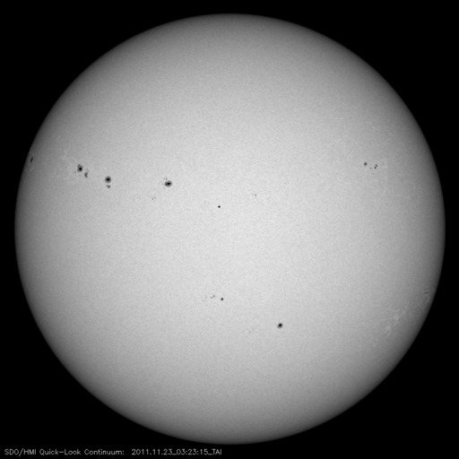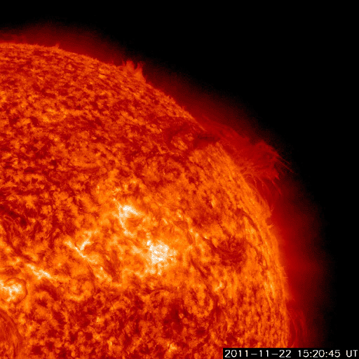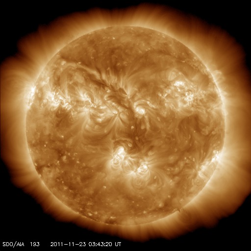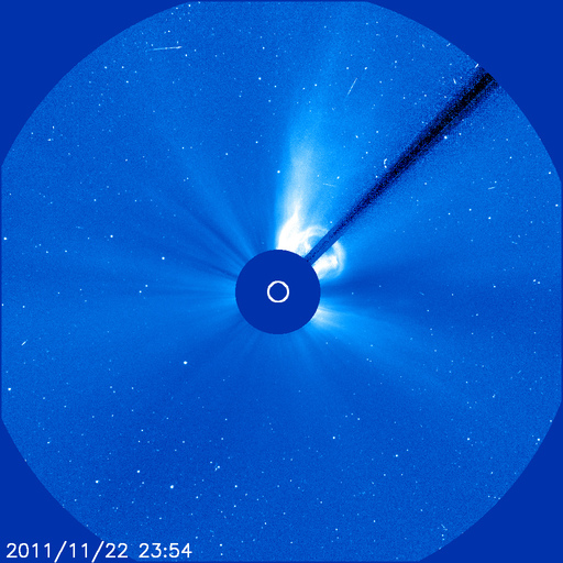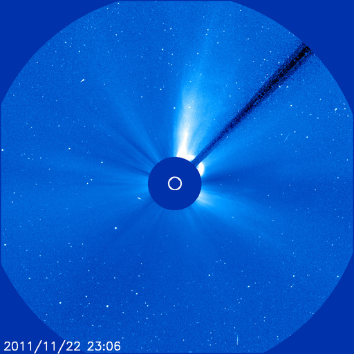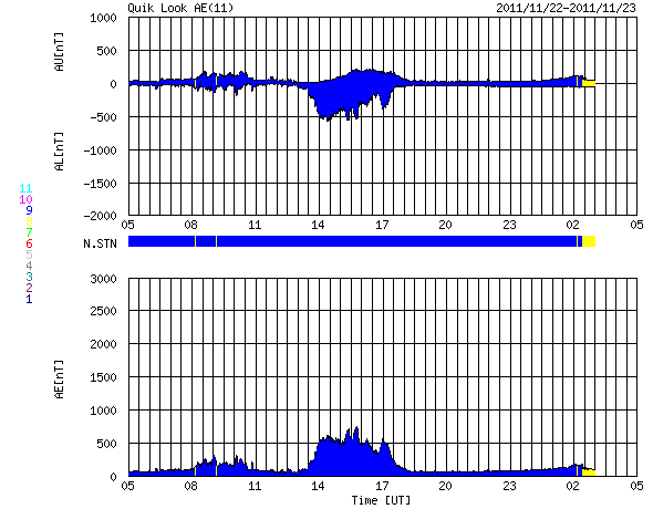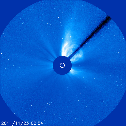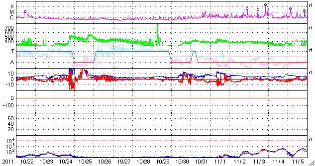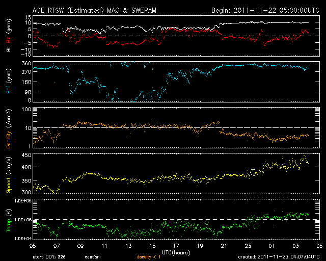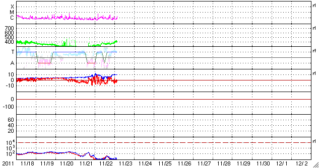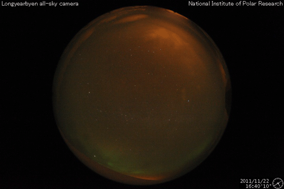 2011/11/23 13:07 更新 南向き磁場の影響でオーロラの活動が発生しました。太陽風の速度が少し上がっています。 担当 篠原 昨日の記事も聞こえたのか(そんなことはありませんが)、 今度はAE指数500nTに達するオーロラの活動が久しぶりに発生しました。 太陽風の速度は、350km/秒と遅かったのですが、 磁場が-5nTを超えるくらいの南向きになり、 その影響で、22日23時〜23日3時(世界時22日14〜18時)にかけて 中規模のオーロラ活動が発生しました。 その様子の一部を、ノルウェーから更に北極に近づいた スバールバル島Longyearbyenの全天カメラ画像で紹介します。 時間を長めにしたかったので、写真の大きさを少し縮めています。 フルサイズの動画は、こちらのページからどうぞ。 太陽風は、今日の未明から磁場強度が10nTに強まり、 速度も430km/秒ほどにやや高まっています。 この後どの様に変化するのか、注目して下さい。 太陽では、再びCクラスの小規模フレアの発生が増えています。 発生のほとんどは北半球東側の1356黒点群で、 C4.9、C3.2を初めとして、C1〜2の小さなものも多数起こしています。 引き続き小中規模のフレア活動が見られそうです。 また、太陽の北西(右上)側では、巨大なプロミネンスの噴出も発生しています。 SDO衛星AIA304による動画を掲載します。 CMEの噴出も発生していますが、地球からは横方向なので、 影響はありません。 ノルウェーのスバールバル島Longyearbyenで全天カメラにより撮影された、オーロラの様子。 (c) 国立極地研究所、(動画加工 : 宇宙天気ニュース) ![]() SDO衛星AIA304によるフィラメント噴出の様子。 (c) SDO (NASA)、 (動画加工 : 宇宙天気ニュース) ![]() SOHO衛星 LASCO C3カメラの映像 (c) SOHO (ESA & NASA)