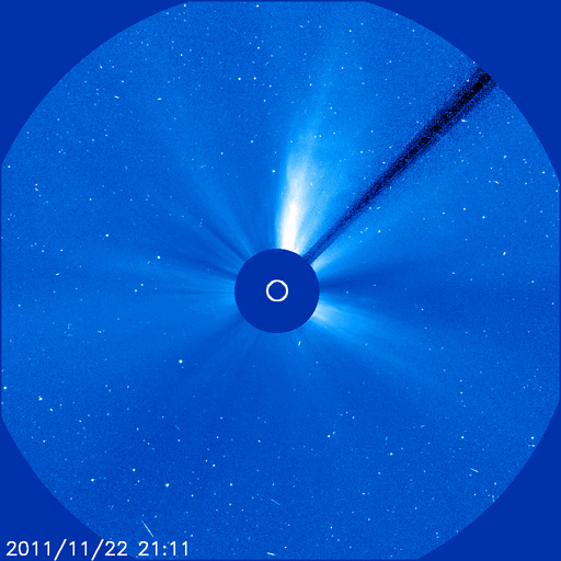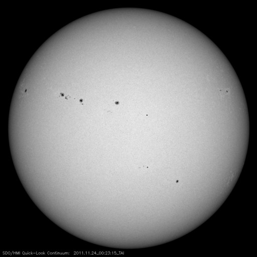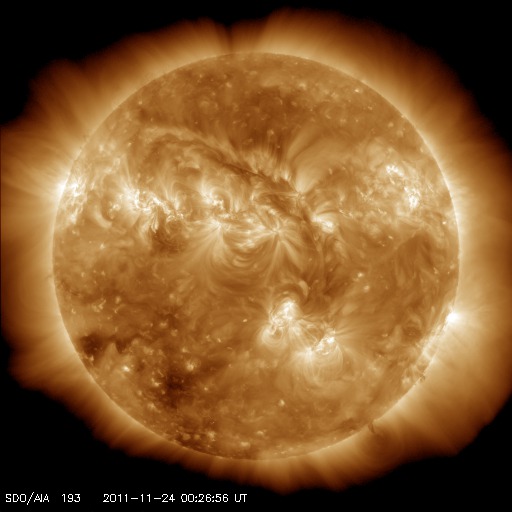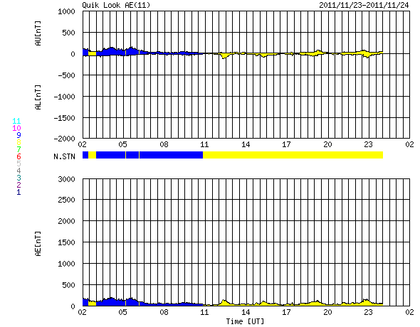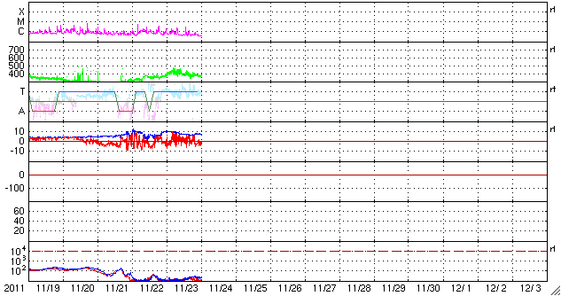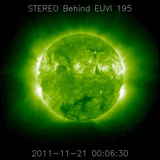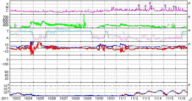 2011/11/24 10:06 更新 太陽のフレア活動は弱まっています。太陽風、磁気圏は穏やかです。 担当 篠原 昨日お知らせしたCMEの動画を掲載します。 太陽から北西(右上)方向に向かって噴き上がっています。 地球からは横方向なので、影響はありません。 太陽のフレア活動は、昨日は弱まって、 最大でC2.6と、小さめのCクラスの小規模フレアが4回起きた程度でした。 ただ、発生した場所はいろいろで、 東端の1358黒点群と、となりの1356黒点群、 西の端の1357黒点群と1346黒点群、などとなっています。 この後も小さな活動が見られる程度でしょうか。 太陽風の速度は、昨日の午後に400〜450km/秒に上がった程度で、 その後はゆっくりと下がり、現在は370km/秒とやや低速です。 磁場強度も、10nTから8nTに下がったくらいで安定していたのですが、 今朝になって5nT近くに下がっています。 特に目立った変動にはなりませんでした。 磁場強度は高まっていたのですが、南北成分は北寄りになっていたため、 磁気圏の活動は穏やかでした。 AE指数はほとんど変化していません。 この後も、太陽風と磁気圏は静穏な状態が続きそうです。 SDO衛星AIA193を見ると、 南東(左下)に、コロナホールの薄暗い領域が見えてきました。 数日前からSTEREO Behind衛星で見えていて(21日の写真を掲載します)、 地球側へ回ってくるのを待っていました。 STEREO Behindは8日ほど先の太陽を見ています。 29日頃に掲載の写真の様な太陽を地球から見ることができるでしょう。 すると、12月2日頃にある程度高速の太陽風がやって来るかもしれません。 SOHO衛星LASCO C3による、北西方向へのCMEの噴出。 (c) SOHO (ESA & NASA)、 (動画加工 : 宇宙天気ニュース) ![]() STEREO Behindによる、東側の太陽コロナ。地球よりも8日程度先回りをしています。 (c) STEREO (NASA) ![]() SDO衛星のAIA193カメラによる太陽コロナの様子 (c) SDO (NASA) ![]() SDO衛星による太陽の可視光写真。マウスの矢印を写真に重ねると、黒点番号付きの写真に切り替わります。 (c) SDO (NASA) ![]() GOES衛星の太陽X線データ (c) NOAA/SWPC ![]() ACEが観測した太陽風の磁場(1番上の枠、白線は全体の強度、赤線は南北成分) および、太陽風の密度(3番目の橙線)、速度(4番目の黄線) (c) NOAA/SWPC ![]() リアルタイムAE指数 下段のAEグラフの値が高くなると、オーロラ活動が活発化しています。 (c) 京都大学, NICT ![]() 27日の太陽周期に合わせたデータプロット 太陽が同じ面を地球に向けていた27日前の変化から、今後を予想することができます。 (c) 作図:宇宙天気ニュース