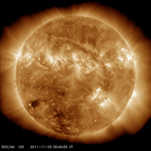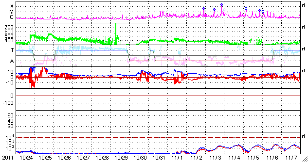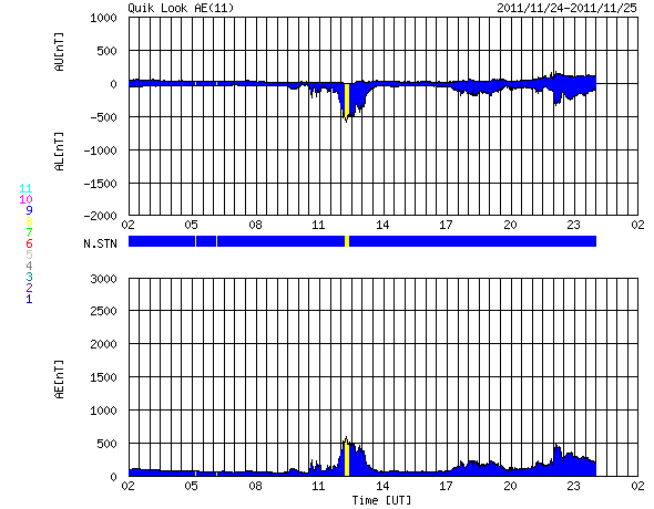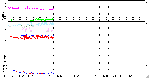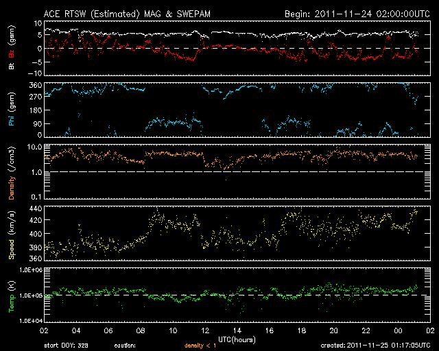 2011/11/25 10:18 更新 太陽風は400km/秒台になり、オーロラも発生しています。 担当 篠原 太陽風の速度は再び400km/秒台に上がり、 400〜430km/秒と平均的な速さで安定しています。 磁場強度も6nTと平均的な強さで安定しています。 特に高まっている訳ではありませんが、 このところ穏やかな太陽風が続いているので、 この程度の変化でも目立ちます。 AE指数では、500nTに達する程度の中規模の変化が発生しています。 ACEの図と比較すると、太陽風磁場が南を向いたところで起きていて、 対応が分かりやすい変化です。 太陽風はこの後も穏やかな状態が続きそうです。 SDO衛星AIA193の太陽コロナ写真では、 南半球の高緯度付近にコロナホールが見えてきました。 やや濃い色を示していますが、緯度がかなり高いため、 地球への影響はほとんど見られないか、弱いものになりそうです。 29日以降の太陽風と考えられます。 太陽のフレア活動は、昨日のニュースの後は更に静かになり、 Cクラスのフレアも発生しない状況でしたが、 今朝くらいからC1くらいのフレアが3、4回起きているようです。 GOESのX線写真を見ると、西側の1357群、1354群で発生しています。 この後も、現状程度の活動が見られるくらいでしょう。 SDO衛星のAIA193カメラによる太陽コロナの様子 (c) SDO (NASA) ![]() SDO衛星による太陽の可視光写真。マウスの矢印を写真に重ねると、黒点番号付きの写真に切り替わります。 (c) SDO (NASA) ![]() ACEが観測した太陽風の磁場(1番上の枠、白線は全体の強度、赤線は南北成分) および、太陽風の密度(3番目の橙線)、速度(4番目の黄線) (c) NOAA/SWPC ![]() リアルタイムAE指数 下段のAEグラフの値が高くなると、オーロラ活動が活発化しています。 (c) 京都大学, NICT ![]() 27日の太陽周期に合わせたデータプロット 太陽が同じ面を地球に向けていた27日前の変化から、今後を予想することができます。 (c) 作図:宇宙天気ニュース