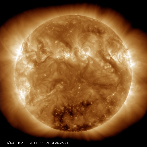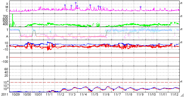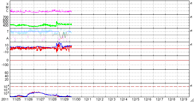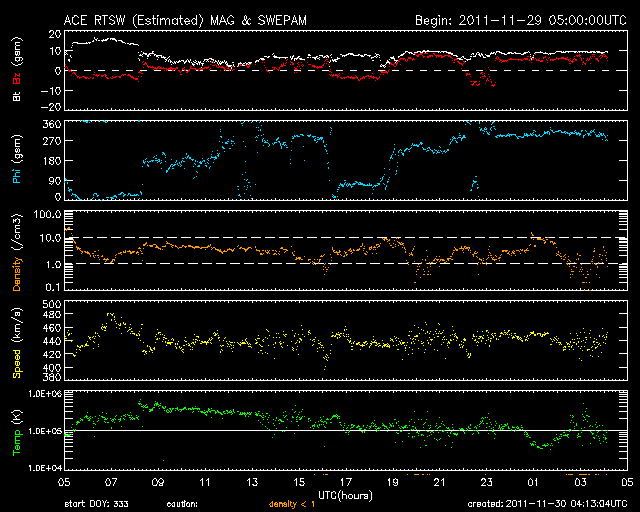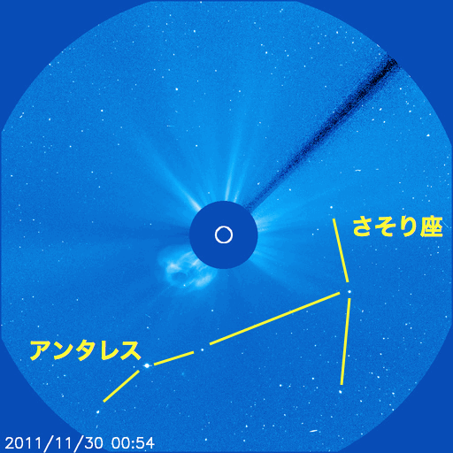 2011/11/30 13:14 更新 太陽風はやや高めの状態で、オーロラも時々発生しています。 担当 篠原 SOHO衛星のLASCO C3カメラの視野にさそり座が見えています。 1枚目の写真で紹介します。 今後も数日にわたって見えていますので、最新写真で探してみてください。 太陽風は、440km/秒とやや高めの速度で安定しています。 磁場強度も、10nT近い高めの値になっています。 CMEの影響が残っているのか、コロナホールの影響に切り替わったのか、 興味深いところです。 磁場の南北成分は、比較的北寄りに推移しています。 ところどころで南向きになっていて、そこでオーロラの活動が発生しています。 しかし、AE指数のグラフはデータエラーが続いていて、 詳しい変化の様子は分かりません。 太陽風の高まりは、まだしばらくは続きそうで、 引き続きオーロラの活動も期待できます。 太陽は、C1からC2の小規模フレアが数回発生しています。 1361、1362、1363黒点群と、発生箇所が順番に東に動いています。 黒点は小さなものばかりですが、 現状程度のフレア活動はこの後も見られそうです。 SOHO衛星のLASCO C3カメラの下寄りにさそり座が見えています。 (c) SOHO (ESA & NASA)、 (画像加工 : 宇宙天気ニュース) ![]() SDO衛星のAIA193カメラによる太陽コロナの様子 (c) SDO (NASA) ![]() SDO衛星による太陽の可視光写真。マウスの矢印を写真に重ねると、黒点番号付きの写真に切り替わります。 (c) SDO (NASA) ![]() ACEが観測した太陽風の磁場(1番上の枠、白線は全体の強度、赤線は南北成分) および、太陽風の密度(3番目の橙線)、速度(4番目の黄線) (c) NOAA/SWPC ![]() リアルタイムAE指数 下段のAEグラフの値が高くなると、オーロラ活動が活発化しています。 (c) 京都大学, NICT ![]() 27日の太陽周期に合わせたデータプロット 太陽が同じ面を地球に向けていた27日前の変化から、今後を予想することができます。 (c) 作図:宇宙天気ニュース