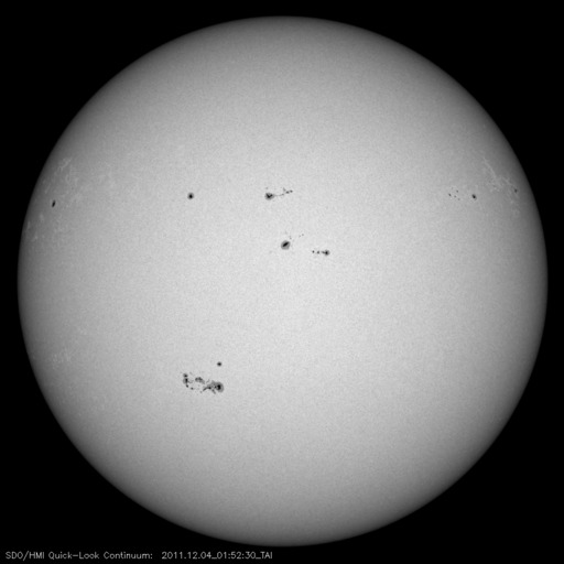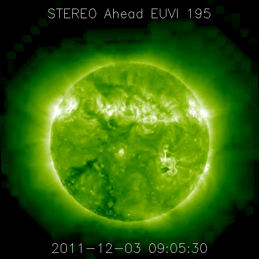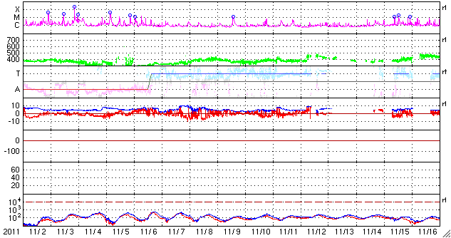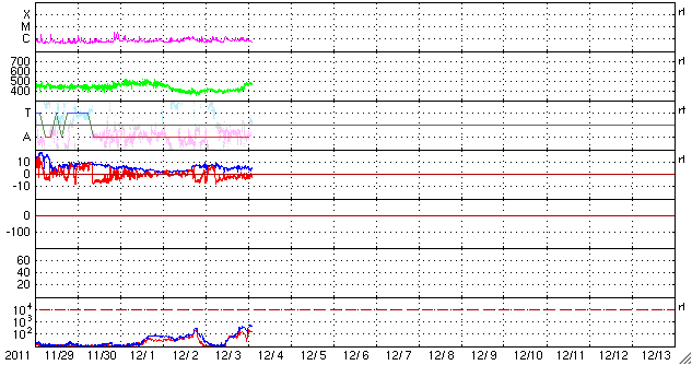 2011/12/ 4 11:36 更新 太陽のフレア活動は穏やかです。小規模のオーロラ活動が続いています。 担当 篠原 太陽の活動は、比較的穏やかな状態が続いています。 太陽の可視光写真を見ると、 中央から少し南東(左下)の1363黒点群の発達が目立ちます。 しかし、フレアの活動はあまり見られず、 C1の小さな小規模フレアが数回発生した程度です。 黒点としての広がりに続いて、 1363黒点群はフレアの発生も増えるでしょうか。 太陽としては、西端の少し向こう側でフレアが発生して、 CMEが噴出しています。 その様子を3つの衛星の画像を繋げて紹介します。 STEREO Ahead衛星は、太陽を右横から見ています。 そのため、このフレアはほぼ正面で起きています。 1枚目の動画の緑色の写真で、太陽の中心やや上側で爆発現象が発生します。 これを地球側から見ると、太陽の右端になります。 SDO衛星AIA304の写真では、 太陽の右上端にコロナの激しい噴き上がりが見えています。 これによってCMEが太陽の右上方向に噴出しています。 最後はSOHO衛星のコロナグラフ、LASCO C2カメラの写真です。 SDOの写真からそのままつながる様に、激しく太陽のガスが噴き上がっています。 このCMEは、地球からは横方向に飛び出しているため影響はありません。 3つの衛星できれいに見ることができたので紹介しました。 太陽風は、コロナホールの影響が続いています。 速度は400km/秒が続きましたが、今朝から460km/秒とやや高速に戻っています。 磁場強度も、5〜7nTとやや強めの状態で、 特に南北成分がずっと弱い南向きになっています。 この影響で磁気圏も弱い活動状態が続き、 AE指数は200nTの弱い変化に、500nTの中規模の変化が度々発生して ややにぎやかです。 極域ではある程度きれいなオーロラが見られたのではないでしょうか。 コロナホールの影響は、そろそろ終わりそうです。 明後日くらいから後は、穏やかな太陽風に戻るのではないかと思います。 太陽の西端で発生したフレアとそれに伴うCME噴出の様子を、3つの衛星画像より。 (c) STEREO (NASA)、SDO (NASA)、SOHO (ESA & NASA)、(動画加工 : 宇宙天気ニュース ) ![]() SDO衛星のAIA193カメラによる太陽コロナの様子 (c) SDO (NASA) ![]() SDO衛星による太陽の可視光写真。マウスの矢印を写真に重ねると、黒点番号付きの写真に切り替わります。 (c) SDO (NASA) ![]() GOES衛星の太陽X線データ (c) NOAA/SWPC ![]() ACEが観測した太陽風の磁場(1番上の枠、白線は全体の強度、赤線は南北成分) および、太陽風の密度(3番目の橙線)、速度(4番目の黄線) (c) NOAA/SWPC ![]() リアルタイムAE指数 下段のAEグラフの値が高くなると、オーロラ活動が活発化しています。 (c) 京都大学, NICT ![]() 27日の太陽周期に合わせたデータプロット 太陽が同じ面を地球に向けていた27日前の変化から、今後を予想することができます。 (c) 作図:宇宙天気ニュース