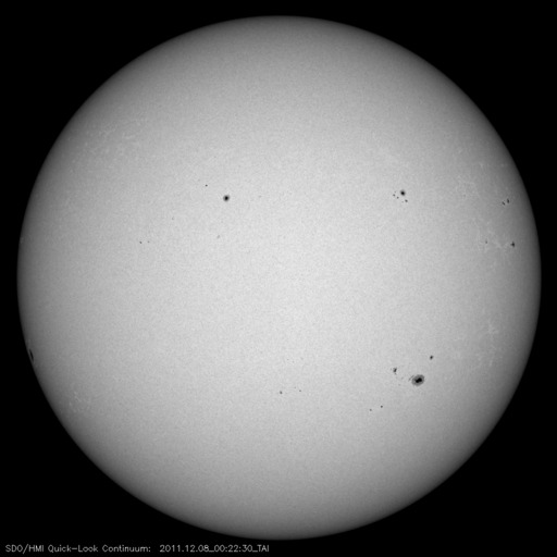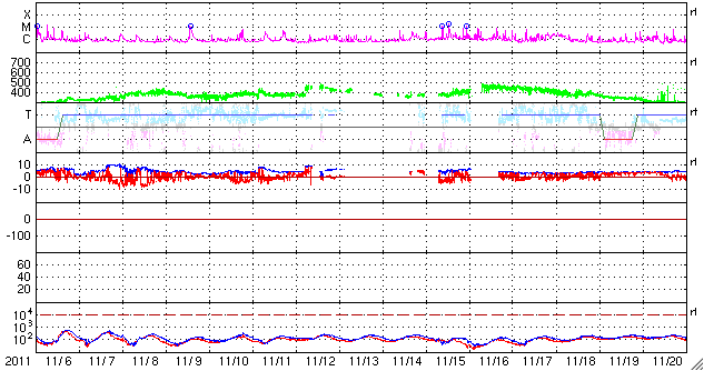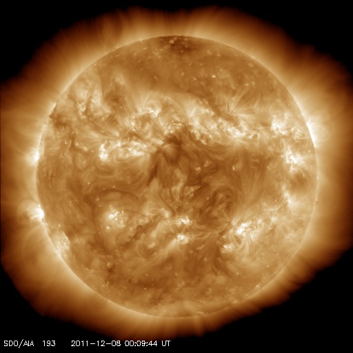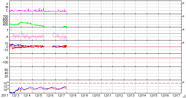 2011/12/ 8 09:51 更新 太陽のフレア活動は穏やかです。太陽風もかなり低速で、磁気圏も静かです。 担当 篠原 太陽では、C1〜2の小さな小規模フレアが3回ほど発生しています。 活動状況としては穏やかです。 しかし、X線のグラフだけを見ても実感が湧かないので、 今日は、GOES-15衛星のX線写真による動画を掲載しましょう。 動画の内容は、昨日から今朝にかけての1日分の太陽です。 北半球側と南半球側に、東西(横方向)に帯状に明るい活動的な領域が広がっています。 可視光写真と比較すると、黒点のある部分はより明るく光っています。 この動画を見ると、C1が3回だけという言葉以上に、 太陽のあちこちで活動が発生しているのが分かります。 もちろん、規模は小さいものばかりですが、 最近の太陽の活発な雰囲気がより伝わるのではないかと思います。 GOES衛星のX線動画は、このページで見ることができます。 SOHO衛星LASCO C3カメラを見ると、 太陽を包むようにハロー型のCME(太陽ガスの放出現象)が発生しています。 しかし、太陽の裏側の現象ですので、地球への影響はありません。 太陽風は、かなり遅い風が続いています。 速度は、290km/秒から少し上がって、310km/秒になっています。 ACEのグラフを見るとよく上がっている様に見えますが、変化の幅はとても小さく、 27日周期の図の速度のグラフを見ると、ほとんど上がっていないことが分かります。 磁場強度も3〜4nTとやや弱めの状態です。 磁気圏も静穏で、AE指数はほとんど変化していません。 この穏やかな状態は、この後も当分続きそうです。 GOES-15のX線カメラによる太陽の様子。 (c) NOAA/SWPC 、(動画加工 : 宇宙天気ニュース) ![]() SDO衛星による太陽の可視光写真。マウスの矢印を写真に重ねると、黒点番号付きの写真に切り替わります。 (c) SDO (NASA) ![]() SDO衛星のAIA193カメラによる太陽コロナの様子 (c) SDO (NASA) ![]() GOES衛星の太陽X線データ (c) NOAA/SWPC ![]() ACEが観測した太陽風の磁場(1番上の枠、白線は全体の強度、赤線は南北成分) および、太陽風の密度(3番目の橙線)、速度(4番目の黄線) (c) NOAA/SWPC ![]() リアルタイムAE指数 下段のAEグラフの値が高くなると、オーロラ活動が活発化しています。 (c) 京都大学, NICT ![]() 27日の太陽周期に合わせたデータプロット 太陽が同じ面を地球に向けていた27日前の変化から、今後を予想することができます。 (c) 作図:宇宙天気ニュース