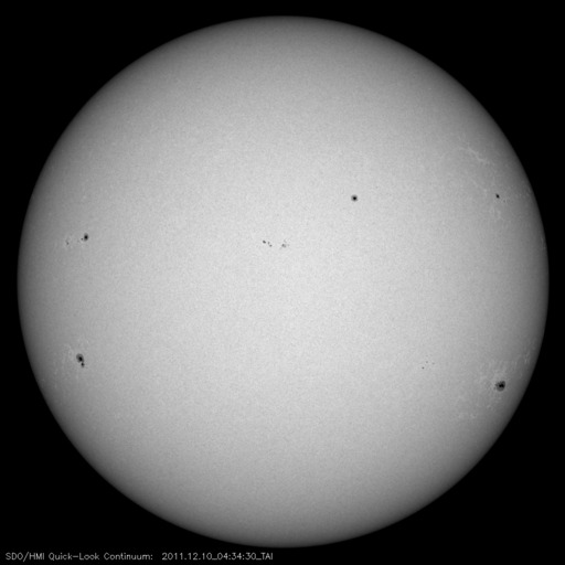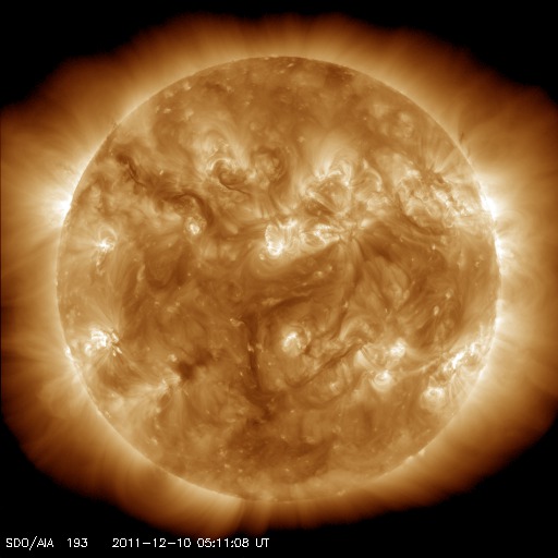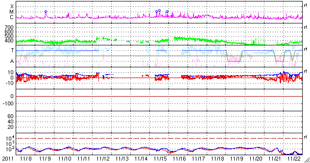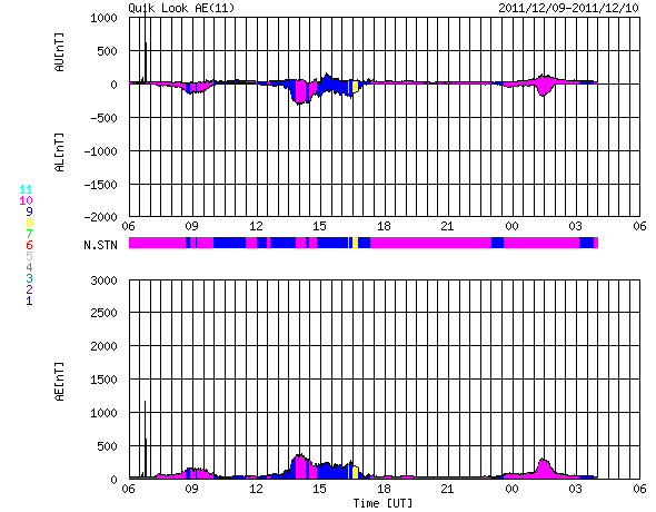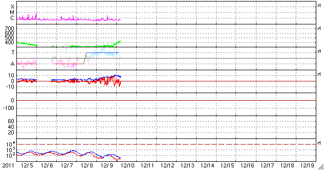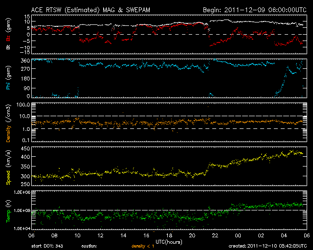2011/12/10 14:32 更新 太陽風の速度が400km/秒に上がり、もう一段上昇するかもしれません。 担当 篠原 今日の早朝より、太陽風の速度が上昇を始め、 それまでの300km/秒から、現在は400km/秒を超えるくらいに高まっています。 速さとしては平均レベルの値ですが、目立った上昇の変化になっています。 NOAA/SWPCのレポートによると、コロナホールの影響と考えているようです。 数日前のSDO衛星AIA193の写真では、 はっきりとしたコロナホールは見えなかったのですが、 太陽の中央付近がぼんやりと暗くなっていたので、 その影響なのかもしれません。 速度が上がり始める頃には、磁場強度も10nTに強まっていました。 現在も7nTほどとやや強めの状態です。 このため、速度の上昇はもうしばらく続くかもしれません。 磁気圏のオーロラ活動は、小規模の変化が見られる程度です。 しかし、速度が高まってきたことから、ここ2〜3日は期待できるかもしれません。 太陽では、南東(左下)の1374黒点群でC3.1の小規模フレアが発生しました。 しかし、目立ったフレア活動はこれだけで、全体的には穏やかな状態です。 今夜は皆既月食です。 鹿児島は北風が強く、雲の多い空です。 雲の間からでも皆既の赤い月を見られるといいのですが。 寒さにお気をつけてご覧ください。 SDO衛星のAIA193カメラによる太陽コロナの様子 (c) SDO (NASA) ![]() SDO衛星による太陽の可視光写真。マウスの矢印を写真に重ねると、黒点番号付きの写真に切り替わります。 (c) SDO (NASA) ![]() ACEが観測した太陽風の磁場(1番上の枠、白線は全体の強度、赤線は南北成分) および、太陽風の密度(3番目の橙線)、速度(4番目の黄線) (c) NOAA/SWPC ![]() リアルタイムAE指数 下段のAEグラフの値が高くなると、オーロラ活動が活発化しています。 (c) 京都大学, NICT ![]() 27日の太陽周期に合わせたデータプロット 太陽が同じ面を地球に向けていた27日前の変化から、今後を予想することができます。 (c) 作図:宇宙天気ニュース