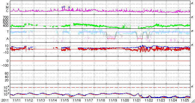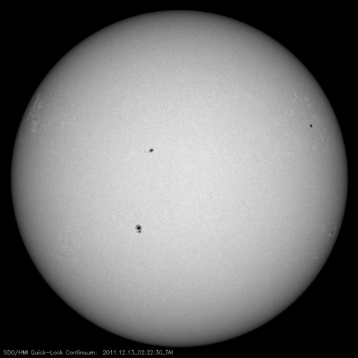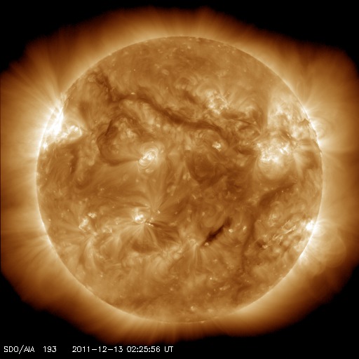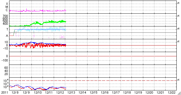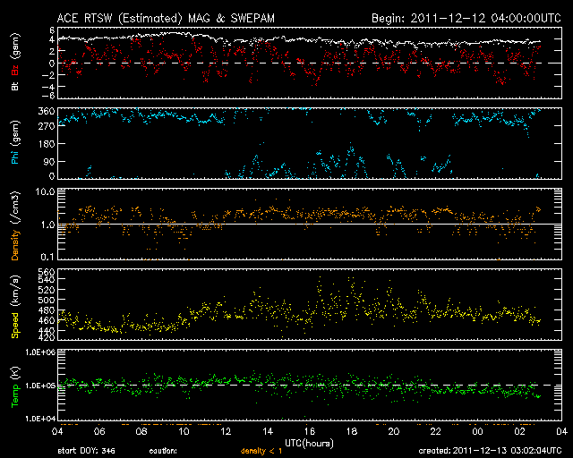2011/12/13 12:03 更新 太陽風は470km/秒とやや高速です。太陽フレアは穏やかです。 担当 篠原 太陽風の速度は、470km/秒とやや高めの状態が続いています。 昨日よりも若干高くなっている様です。 太陽風は、12月10日に400km/秒台の速度に上がって以来、 3日間にわたってやや高速の風が続いています。 特に高い状態ではありませんが、 SDO衛星AIA193の太陽写真ではコロナホールは見当たらなかったので、 この状態がどこまで続くのか興味深いです。 太陽風の磁場強度は、4nTを少し切るくらいに下がっています。 また、昨日の記事のCMEによる太陽風の変化が、明日以降、 14日から15日くらいに地球にやって来く可能性があります。 その場合、小規模の変化だと思いますが、磁場が南寄りに推移すると、 オーロラの活動は大きくなることがあります。 太陽のフレア活動は、C1の小規模フレアが起きている程度で、 概ね穏やかです。 黒点の見え方も、だいぶ少なくなっています。 東の端から新しい黒点群が上がってきましたが、 今のところ活動は特に見られません。 SDO衛星のAIA193カメラによる太陽コロナの様子 (c) SDO (NASA) ![]() SDO衛星による太陽の可視光写真。マウスの矢印を写真に重ねると、黒点番号付きの写真に切り替わります。 (c) SDO (NASA) ![]() ACEが観測した太陽風の磁場(1番上の枠、白線は全体の強度、赤線は南北成分) および、太陽風の密度(3番目の橙線)、速度(4番目の黄線) (c) NOAA/SWPC ![]() リアルタイムAE指数 下段のAEグラフの値が高くなると、オーロラ活動が活発化しています。 (c) 京都大学, NICT ![]() 27日の太陽周期に合わせたデータプロット 太陽が同じ面を地球に向けていた27日前の変化から、今後を予想することができます。 (c) 作図:宇宙天気ニュース