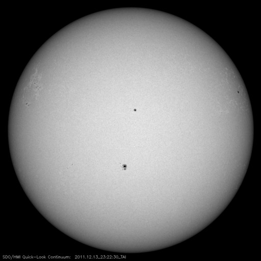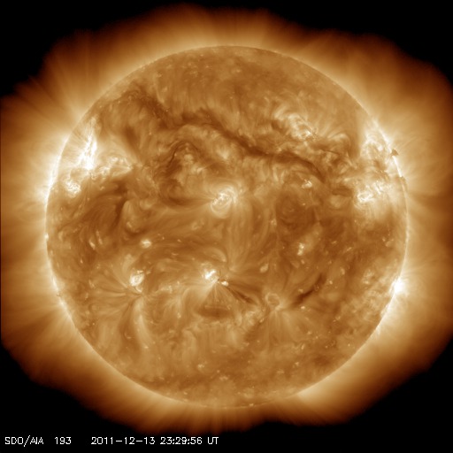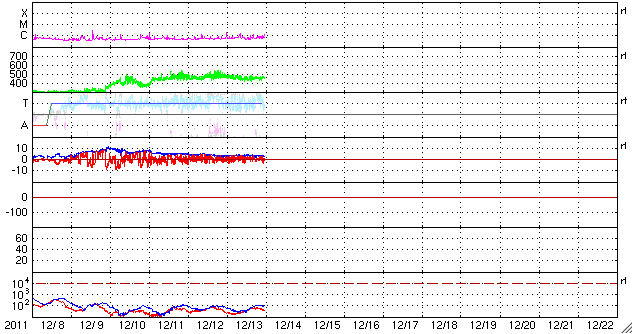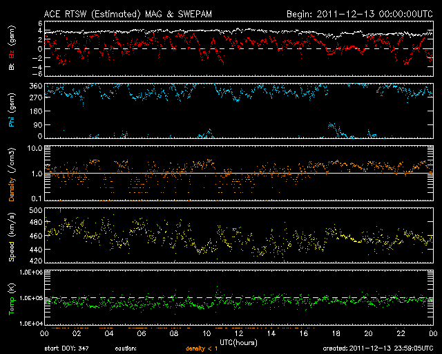 2011/12/14 08:59 更新 460km/秒のやや高速の太陽風が続いています。C4.8の小規模フレアが発生しました。 担当 篠原 太陽風は、460km/秒とやや速い速度が安定して続いています。 磁場強度は、4nTから3nTに少し下がり、 現在の太陽風速度の高まりも終わりが近づいているのかもしれません。 磁場の南北成分は北寄りに推移しています。 このため、磁気圏への影響は弱く、 オーロラ活動は小さなものが見られる程度です。 27日周期の図を見ると、 10日頃から始まった太陽風速度の高まりは、4日を経過しています。 このままどこまで続くのか、興味深く眺めています。 太陽のフレア活動は、昨日以降も穏やかに推移していましたが、 つい先ほど、14日8時(世界時13日23時)に、 太陽の南西(右下)の端でC4.8程度のフレアが発生しました。 発生場所は、昨日までは見えていた1367黒点群の様です。 撮りたてのGOES衛星X線カメラの動画をご覧ください。 太陽面は、この他は黒点も少なく、 フレア活動は穏やかに推移しそうです。 GOES-15のX線カメラによるフレアの様子。 (c) NOAA/SWPC 、(動画加工 : 宇宙天気ニュース) ![]() SDO衛星のAIA193カメラによる太陽コロナの様子 (c) SDO (NASA) ![]() SDO衛星による太陽の可視光写真。マウスの矢印を写真に重ねると、黒点番号付きの写真に切り替わります。 (c) SDO (NASA) ![]() ACEが観測した太陽風の磁場(1番上の枠、白線は全体の強度、赤線は南北成分) および、太陽風の密度(3番目の橙線)、速度(4番目の黄線) (c) NOAA/SWPC ![]() リアルタイムAE指数 下段のAEグラフの値が高くなると、オーロラ活動が活発化しています。 (c) 京都大学, NICT ![]() 27日の太陽周期に合わせたデータプロット 太陽が同じ面を地球に向けていた27日前の変化から、今後を予想することができます。 (c) 作図:宇宙天気ニュース