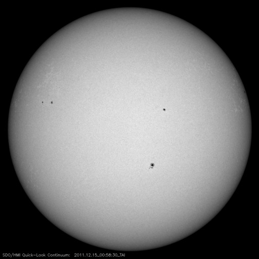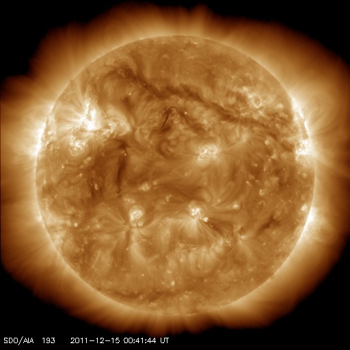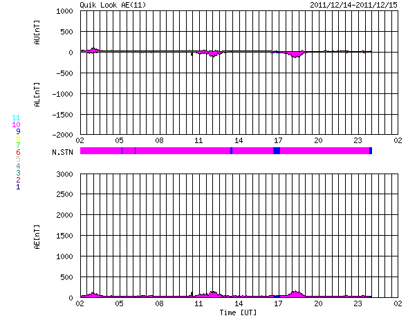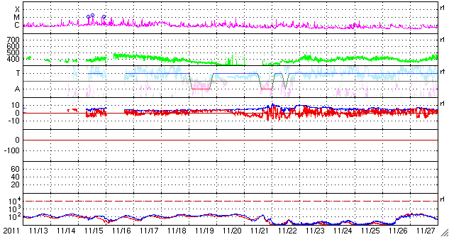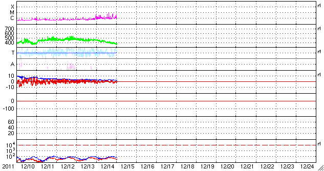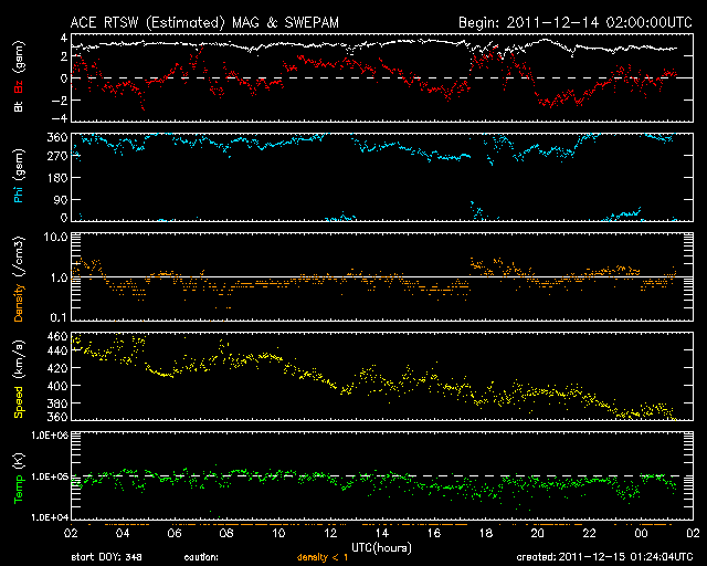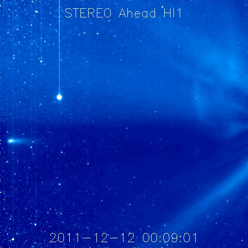 2011/12/15 10:25 更新 太陽に明るい彗星が近づいています。西に没した1367黒点群が活発にフレアを起こしました。 担当 篠原 SOHO衛星LASCO C3カメラの下側から、長い尾を引いて明るい彗星が顔を出しました。 Spaceweather.comの情報によると、Lovejoy彗星という名前だそうです。 STEREO Ahead衛星のHI1カメラにも、12日から写っていました。 下の方から太陽に向かって斜めに近づいています。 SOHO衛星の写真と組み合わせると、立体的な動きがイメージできます。 この後、太陽に接近する様子が楽しみです。 SOHOの最新写真のページで確認して下さい。 太陽風は、昨日のニュース以降、ゆっくりと速度が下がって、 現在は370km/秒と低速の風に変わっています。 太陽風速度の高まりは終わったようです。 オーロラの活動も静かで、AE指数のグラフはほとんど変化していません。 12日のニュースでお知らせしたCMEの影響はまだ来ていません。 今日、明日くらいまでは注目して下さい。 速度の変化は小さいですが、磁場がある程度強まる可能性があります。 南向きに強まると、オーロラも活発化するでしょう。 この変化を除くと、太陽風は低速の穏やかな状態が続くでしょう。 太陽は、昨日のC4.8以降、1367黒点群の活動が強まり、 C3.1、C3.5、C3.3、C3.9、C5.8、C7.5、C7.0と かなり活発にフレアが発生しています。 ほぼ西に没していることを考えると、 実際にはMクラスの中規模フレアだったものもあるのではないでしょうか。 SOHO衛星LASCO C3カメラの下側から彗星が現われました。 (c) SOHO (ESA & NASA)、 (動画加工 : 宇宙天気ニュース) ![]() STEREO Ahead衛星のHI1カメラの右下に、この彗星が写っています。 (c) STEREO (NASA)、 (動画加工 : 宇宙天気ニュース) ![]() SDO衛星のAIA193カメラによる太陽コロナの様子 (c) SDO (NASA) ![]() SDO衛星による太陽の可視光写真。マウスの矢印を写真に重ねると、黒点番号付きの写真に切り替わります。 (c) SDO (NASA) ![]() ACEが観測した太陽風の磁場(1番上の枠、白線は全体の強度、赤線は南北成分) および、太陽風の密度(3番目の橙線)、速度(4番目の黄線) (c) NOAA/SWPC ![]() リアルタイムAE指数 下段のAEグラフの値が高くなると、オーロラ活動が活発化しています。 (c) 京都大学, NICT ![]() 27日の太陽周期に合わせたデータプロット 太陽が同じ面を地球に向けていた27日前の変化から、今後を予想することができます。 (c) 作図:宇宙天気ニュース