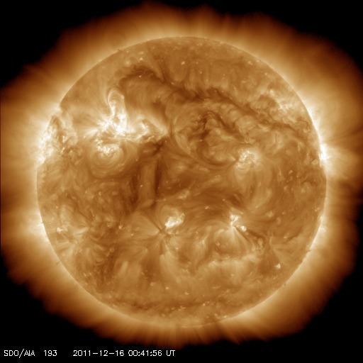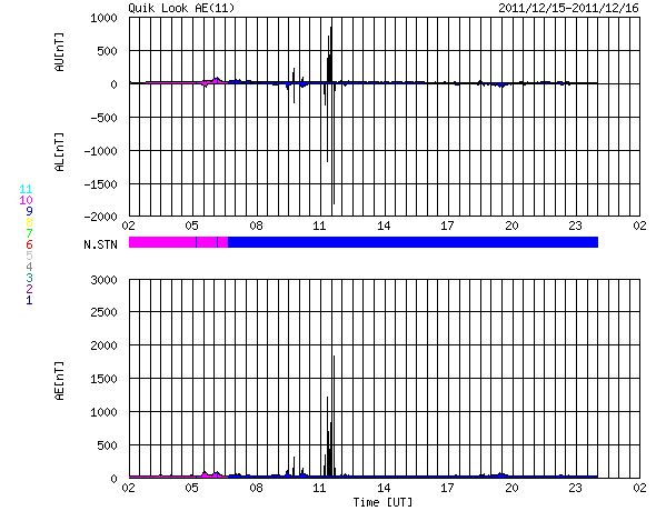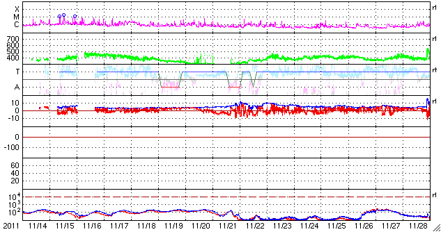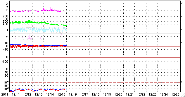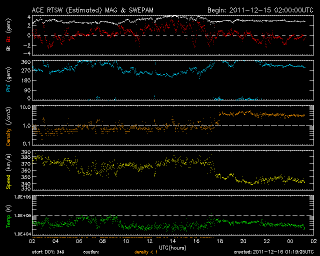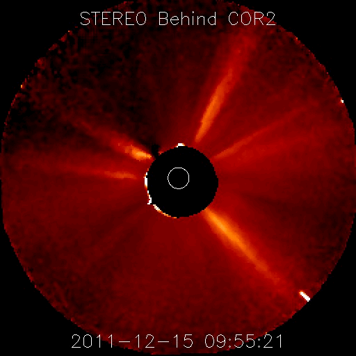 2011/12/16 10:19 更新 Lovejoy彗星が太陽に大接近しています。フレア、太陽風は穏やかです。 担当 篠原 昨日紹介したLovejoy彗星は、ちょうど今、太陽に大接近中です。 SOHO衛星LASCO C3、C2カメラによる動画をご覧ください。 LASCO C2による最後の写真では、尾がかすれていく様に写っていますが、 この後、彗星はどうなったのでしょうか。 SOHO衛星の最新写真ページで確認して下さい。 また、2つめに、STEREO Behind衛星COR2カメラによる動画を掲載します。 昨日とは反対のSTEREO衛星なので、彗星は右下から太陽に近付いています。 彗星の盛り上がりと反対に、宇宙天気はとても穏やかです。 太陽風は、速度が340km/秒に下がり、低速の状態です。 磁場強度も3nTに弱ったまま安定しています。 磁気圏も静穏で、AE指数は全く変化していません。 太陽は、1367黒点群によるフレア活動が目立っていましたが、 1367群が西の端の向こう側に完全に見えなくなると、 X線の強度も含めて下がってしまい、 すっかり穏やかになっています。 見えている黒点群も、寂しいものばかりです。 SOHO衛星LASCO C3、C2カメラによる、Lovejoy彗星の太陽大接近。 (c) SOHO (ESA & NASA)、 (動画加工 : 宇宙天気ニュース) ![]() STEREO Behind衛星COR2カメラによる、Lovejoy彗星の太陽大接近。 (c) STEREO (NASA)、 (動画加工 : 宇宙天気ニュース) ![]() SDO衛星のAIA193カメラによる太陽コロナの様子 (c) SDO (NASA) ![]() SDO衛星による太陽の可視光写真。マウスの矢印を写真に重ねると、黒点番号付きの写真に切り替わります。 (c) SDO (NASA) ![]() ACEが観測した太陽風の磁場(1番上の枠、白線は全体の強度、赤線は南北成分) および、太陽風の密度(3番目の橙線)、速度(4番目の黄線) (c) NOAA/SWPC ![]() リアルタイムAE指数 下段のAEグラフの値が高くなると、オーロラ活動が活発化しています。 (c) 京都大学, NICT ![]() 27日の太陽周期に合わせたデータプロット 太陽が同じ面を地球に向けていた27日前の変化から、今後を予想することができます。 (c) 作図:宇宙天気ニュース