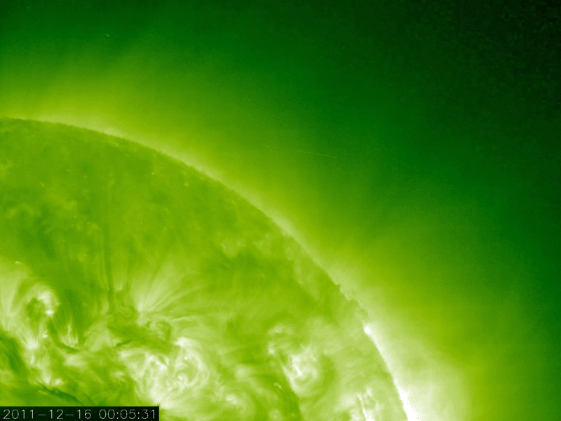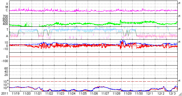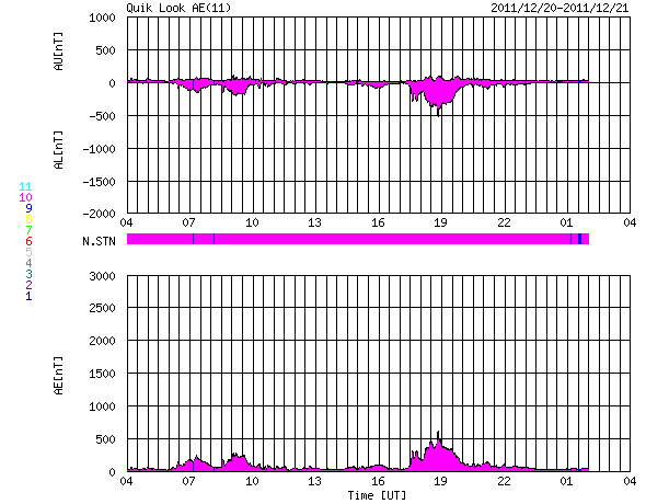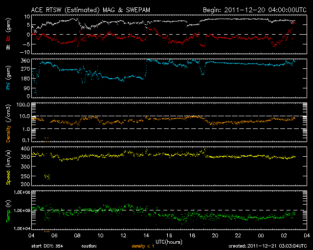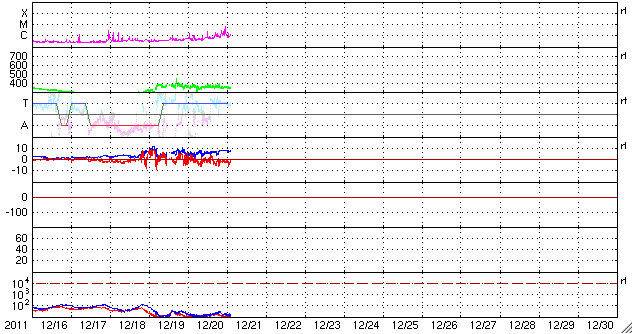 2011/12/21 12:04 更新 太陽風は低速の状態が続いています(350km/秒)。今朝、C6の小規模フレアが発生しました。 担当 篠原 Twitterのコメントで、 STEREO衛星のEUVIカメラにLovejoy彗星は写っていないのか? という指摘を頂きました。 STEREOのサイトで高画質の写真が公開されているので、 大きいサイズの写真をダウンロードしてじっくり探したところ、発見しました。 写真を切り取って動画にしましたので、ご覧ください。 もちろん、新発見でもなんでもなく、専門の方たちは既に分析済みの写真ですが、 自分の目で見つけるのは一味違います。 この写真だけでは、実際にどのくらい近いのかは分かりませんが、 彗星の尾が波打つ様子は感動させられます。 太陽風の速度は、昨日から特に変化はなく、 350km/秒と低速で安定しています。 磁場強度も、7〜8nTとやや強まった状態が続いています。 磁場の南北成分が、少し南寄りになっているようで、 AE指数には小規模の変化が見られています。 太陽では、北西(右上)の1376黒点群の活動度が上がり、 Cクラスの小規模フレアが数回発生しています。 最大は、今朝、21日7時半(世界時20日22時半)のC6.2です。 STEREO Ahead衛星EUVI195カメラによる、太陽に最接近したLovejoy彗星。 (c) STEREO (NASA)、 (動画加工 : 宇宙天気ニュース) ![]() SDO衛星のAIA193カメラによる太陽コロナの様子 (c) SDO (NASA) ![]() SDO衛星による太陽の可視光写真。マウスの矢印を写真に重ねると、黒点番号付きの写真に切り替わります。 (c) SDO (NASA) ![]() ACEが観測した太陽風の磁場(1番上の枠、白線は全体の強度、赤線は南北成分) および、太陽風の密度(3番目の橙線)、速度(4番目の黄線) (c) NOAA/SWPC ![]() リアルタイムAE指数 下段のAEグラフの値が高くなると、オーロラ活動が活発化しています。 (c) 京都大学, NICT ![]() 27日の太陽周期に合わせたデータプロット 太陽が同じ面を地球に向けていた27日前の変化から、今後を予想することができます。 (c) 作図:宇宙天気ニュース