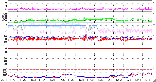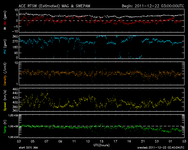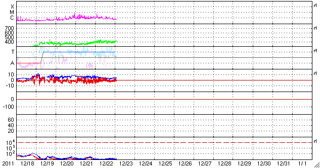 2011/12/23 11:41 更新 長大な尾を伸ばしたLovejoy彗星の写真をどうぞ。太陽風は平均的な速度で、磁気圏は穏やかです。 担当 篠原 ニュージーランド南島クィーンズタウンの米戸実氏より、 今日の早朝に撮影されたばかりの、 ものすごい尾を伸ばしたLovejoy彗星の写真をいただきました。 3枚連続でお楽しみ下さい。 もう言葉を失うというか、ご覧頂くしかないすごい情景です。 このまま南半球に見に行きたいです。 日本とは季節が反対のニュージーランドは、現在は夏ですが、 現地は晴れた朝は10度を切る寒さになるそうです。 しかし、この彗星が上がってくれば、観測の疲れも忘れられそうですね。 素晴らしい写真をありがとうございます。 太陽風は、400km/秒と平均的な速さで安定した状態が続いています。 磁場強度は4〜5nTにやや下がり、こちらも平均的な値になっています。 磁気圏の活動は穏やかで、AE指数は目立った変化はありません。 太陽風は、盛り上がりというほどの変化ではありませんでしたが、 弱いコロナホールからの影響は終わりつつあるのでしょう。 そうなると、今後は速度が下がって、低速風に変わって行きそうです。 太陽は、昨日のニュースの直後、22日11時(世界時22日2時)に、 1381黒点群でC5.4の大きめの小規模フレアが発生しました。 しかし、以降はフレアの発生は減少しています。 ニュージーランド南島クィーンズタウンで、米戸氏により撮影された長大な尾を伸ばしたLovejoy彗星。 (c) 米戸 実 ![]() ニュージーランド南島クィーンズタウンで、米戸氏により撮影された長大な尾を伸ばしたLovejoy彗星。 (c) 米戸 実 ![]() ニュージーランド南島クィーンズタウンで、米戸氏により撮影された長大な尾を伸ばしたLovejoy彗星。 (c) 米戸 実 ![]() SDO衛星のAIA193カメラによる太陽コロナの様子 (c) SDO (NASA) ![]() SDO衛星による太陽の可視光写真。マウスの矢印を写真に重ねると、黒点番号付きの写真に切り替わります。 (c) SDO (NASA) ![]() ACEが観測した太陽風の磁場(1番上の枠、白線は全体の強度、赤線は南北成分) および、太陽風の密度(3番目の橙線)、速度(4番目の黄線) (c) NOAA/SWPC ![]() リアルタイムAE指数 下段のAEグラフの値が高くなると、オーロラ活動が活発化しています。 (c) 京都大学, NICT ![]() 27日の太陽周期に合わせたデータプロット 太陽が同じ面を地球に向けていた27日前の変化から、今後を予想することができます。 (c) 作図:宇宙天気ニュース