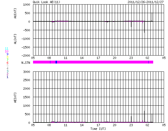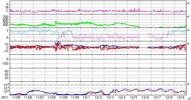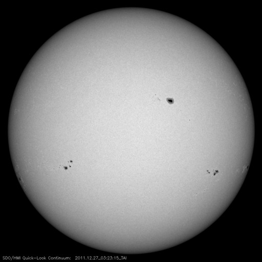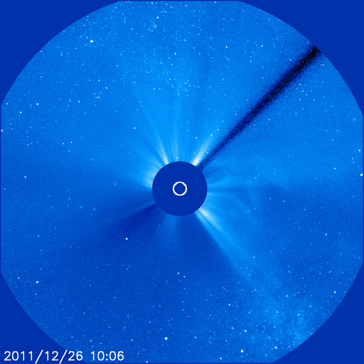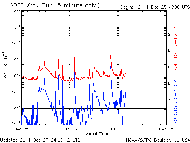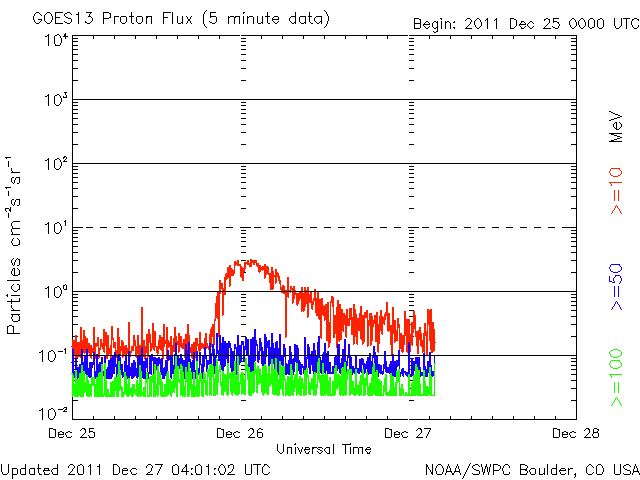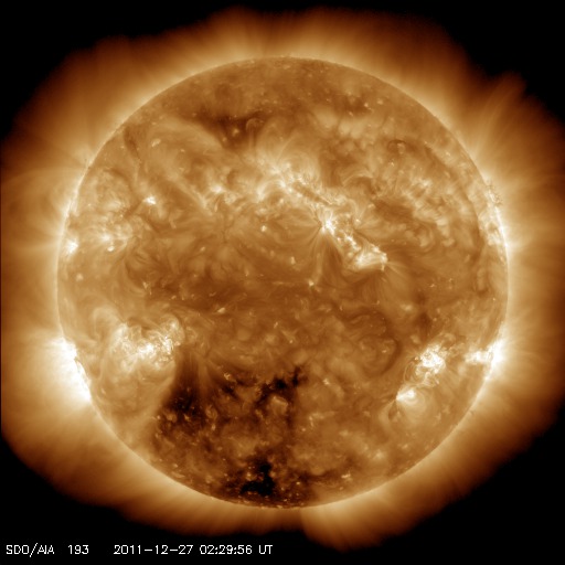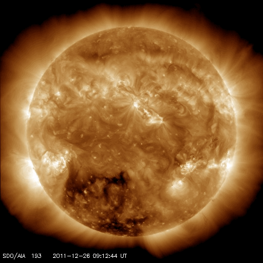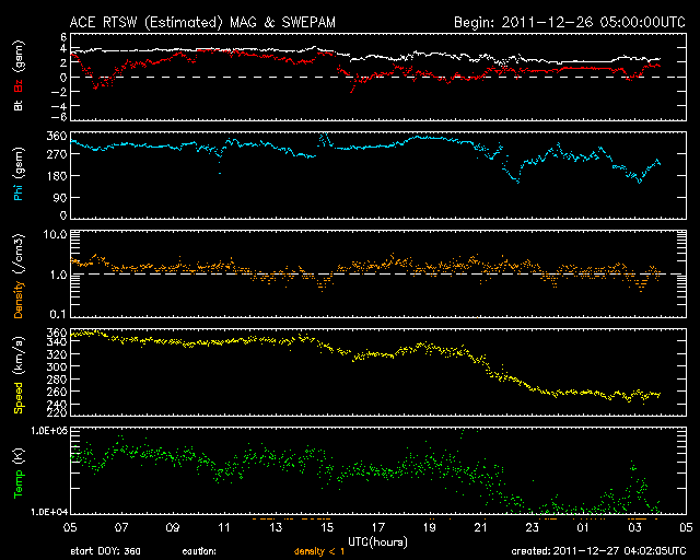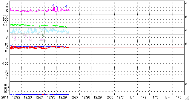 2011/12/27 13:03 更新 太陽ではフレアの発生が続き、地球に向かってCMEも噴出しています。現在の太陽風はかなり低速です。 担当 篠原 太陽の活動が活発に続いています。 昨日のニュースの頃に、1387黒点群で発生したM1.5の中規模フレアに続いて、 26日20時半(世界時26日11時半)には太陽中央部の1384黒点群で、 C5.7の長寿命型の小規模フレアが発生しました。 その様子をSDO衛星AIA193の動画で紹介します。 フレアの後に、きれいなループ状のプロミネンスが輝いています。 このフレアに伴って、CME(太陽ガスの放出現象)も起きています。 SOHO衛星LASCO C3の動画をご覧下さい。 昨日紹介したCMEと同じ様に、 太陽全体(特に上半分)を包む様にガスが広がっています。 これは、CMEが地球方向に噴き出している時の特徴です。 3〜4日後に地球に到達すると考えると、 29日の遅くから30日頃に到来が予想されます。 昨日お知らせしたCMEに続いて、 年末最後の活発なオーロラ活動をもたらすかもしれません。 太陽のフレア活動はその後も続き、 今日の早朝、27日5時(世界時26日20時)には、 再び1387黒点群でM2.3の中規模フレアが発生し、 27日10時(世界時27日1時)にも、C3.4の小規模フレアを起こしています。 この後も、中規模フレアを含めた太陽の活動に注意して下さい。 GOES衛星の観測によると、 昨日増加していた太陽放射線は、既に減少しています。 太陽がにぎやかな一方、太陽風は今朝、更に速度が減少して、 360km/秒の低速状態から更に下がり、260km/秒とかなり遅い風になっています。 磁場強度も3nTに弱まっています。 このため、磁気圏はとても静かで、 AE指数のグラフは全く変化していません。 この静かな太陽風は、明日までは続き、 29日以降は、連続的に発生しているCMEの影響や、 高緯度寄りですが太陽の南半球に現れているコロナホールの影響が 太陽風の乱れとして地球にやって来ると思われます。 太陽風の速度の高まりはそれほど大きくないと思いますが、 磁場が強まって、南向きに大きく振れることで、 活発なオーロラ活動を起こす可能性があります。 年末は、ライブカメラなどにぜひ注目して下さい。 SDO衛星AIA193による、太陽中心付近のCクラスフレアの様子。 (c) SDO (NASA)、(動画加工 : 宇宙天気ニュース ) ![]() SOHO衛星LASCO C3による、CMEの噴出。地球方向に向かっているので、太陽を包む様に広がっている。 (c) SOHO (ESA & NASA)、(動画加工 : 宇宙天気ニュース) ![]() SDO衛星のAIA193カメラによる太陽コロナの様子 (c) SDO (NASA) ![]() SDO衛星による太陽の可視光写真。マウスの矢印を写真に重ねると、黒点番号付きの写真に切り替わります。 (c) SDO (NASA) ![]() GOES衛星の太陽X線データ (c) NOAA/SWPC ![]() GOES衛星の太陽放射線データ (c) NOAA/SWPC ![]() ACEが観測した太陽風の磁場(1番上の枠、白線は全体の強度、赤線は南北成分) および、太陽風の密度(3番目の橙線)、速度(4番目の黄線) (c) NOAA/SWPC ![]() リアルタイムAE指数 下段のAEグラフの値が高くなると、オーロラ活動が活発化しています。 (c) 京都大学, NICT ![]() 27日の太陽周期に合わせたデータプロット 太陽が同じ面を地球に向けていた27日前の変化から、今後を予想することができます。 (c) 作図:宇宙天気ニュース