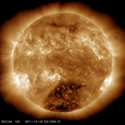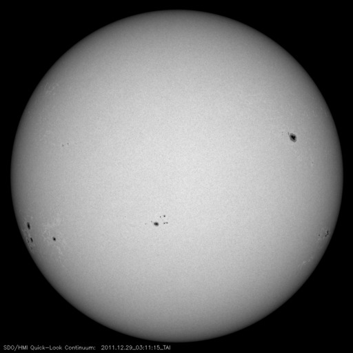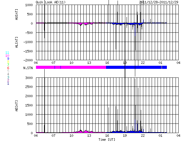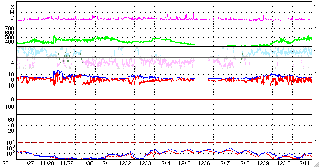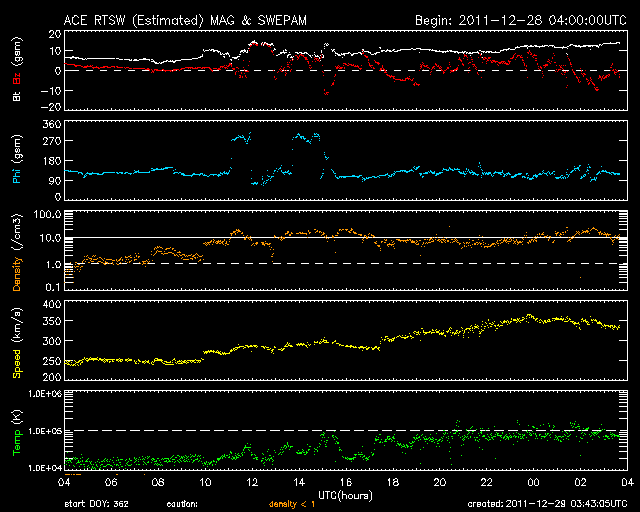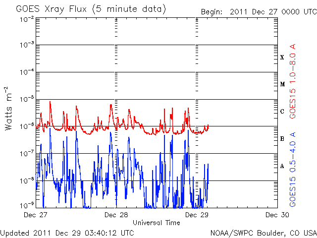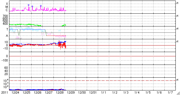 2011/12/29 12:43 更新 C4〜6のフレアが続いています。太陽風の速度はやや上がりましたが低速で、磁気圏も静かです。 担当 篠原 太陽では、Cクラスの中くらいのフレアの発生が続いています。 28日12時半(世界時28日3時半)に1389黒点群でC4.5、 28日23時(世界時28日14時)に再び1389黒点群でC7.2、 29日1時半(世界時28日16時半)は1387黒点群でC6.4、 29日5時半(世界時28日20時半)に1386黒点群でC4.0、 続いて、29日6時半(世界時28日21時半)に1389黒点群でC6.2 などです。 GOES衛星のX線の動画を見ていると、 太陽の南半球の左(1389群)、中央(1386群)、右(1387群)で 次々とフレアの輝きが発生しています。 最も活発な1389黒点群は、こちら側に顔を出したばかりです。 今後もこの群の活動に注意が必要でしょう。 太陽風は、昨夜からゆっくり速度が上がって、 250km/秒から350km/秒に上昇しています。 変化としては小幅ですし、上がっても依然低速の風です。 一方、磁場強度は更に強まって、12nTに上がっています。 いよいよコロナホールからの影響で、 高速の太陽風がやって来るのかもしれません。 これについては、26日のニュースでお知らせしたように、 25日に発生したCMEの影響もそろそろ到来すると思われます。 その後も、フレアに伴っていくつもCMEが発生しており、 これらが混じり合って、しばらくは複雑な太陽風の変化になる可能性があります。 速度がある程度高まって、磁場が強く南を向くと、 磁気圏の活動度は高まって、オーロラを活発に起こす可能性があります。 今後の太陽風のデータ、オーロラのライブカメラなどに注目してください。 年末に今年最後のにぎやかなオーロラが観望できるチャンスが来ました。 SDO衛星のAIA193カメラによる太陽コロナの様子 (c) SDO (NASA) ![]() SDO衛星による太陽の可視光写真。マウスの矢印を写真に重ねると、黒点番号付きの写真に切り替わります。 (c) SDO (NASA) ![]() GOES衛星の太陽X線データ (c) NOAA/SWPC ![]() ACEが観測した太陽風の磁場(1番上の枠、白線は全体の強度、赤線は南北成分) および、太陽風の密度(3番目の橙線)、速度(4番目の黄線) (c) NOAA/SWPC ![]() リアルタイムAE指数 下段のAEグラフの値が高くなると、オーロラ活動が活発化しています。 (c) 京都大学, NICT ![]() 27日の太陽周期に合わせたデータプロット 太陽が同じ面を地球に向けていた27日前の変化から、今後を予想することができます。 (c) 作図:宇宙天気ニュース