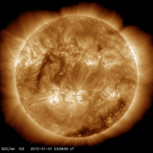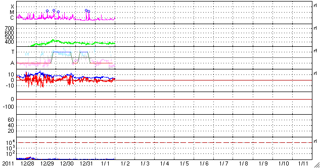 2012/ 1/ 2 09:29 更新 太陽風は低速で、磁気圏も穏やかです。太陽コロナの長期変化を紹介します。 担当 篠原 NASAの太陽活動予報の図で見られる様に、 現在、太陽活動は第24活動周期の極大に近づいていると考えられます。 最近の太陽は、黒点相対数が100を超える日も見られますが、 2008〜2009年頃は1年の半分以上が黒点数0の日でした。 この間の太陽活動の高まり方を、 SOHO衛星のEIT195による太陽コロナ写真の変化で見てみましょう。 掲載している動画は、2009年1月1日から2012年1月1日まで、 毎月1枚ずつ37枚をつなげたものです。 初めは全体が薄暗かった太陽に、ぽつぽつと明るい活動領域が発生し、 やがて北半球と南半球にそれぞれ明るい帯が作られている様子が分かります。 微妙に太陽が回転して見えるのは、太陽の自転周期27日に対して、 写真は1ヶ月毎と3〜4日ずれて進行しているためです。 今後は、活動領域の2本の帯がそれぞれ赤道側に寄って行き、 やがて次の極小期を迎えることになります。 現在の活発な時期がどれだけ続くのか、そして、次の極小はどんな様子になるのか、 10年スケールの長い話です。 のんびりと追いかけて下さい。 昨日は今年初めてのフレア、オーロラを紹介しましたが、 その後はどちらも静かです。 太陽風は、360〜370km/秒と低速で推移し、 磁場強度は5nTから4nTへやや弱まっています。 今後も、このまま低速の風が続くでしょう。 磁気圏も概ね静穏で、AE指数のグラフはデータエラーになっていますが、 一部に小規模の変化が発生しているくらいです。 この後は、SDO衛星AIA193の太陽東側に見える、 細長いコロナホールの様子に注目する程度です。 このコロナホールも規模は小さいので、地球への影響は弱いでしょう。 太陽のフレア活動も弱まったままです。 1日16時半(世界時1日7時半)に1389黒点群で C3.2の小規模フレアが発生したくらいです。 可視光写真の黒点の姿も、全体的に弱々しくなっています。 2009年1月から2012年1月まで、EIT195による太陽コロナの変化。 (c) SOHO (ESA & NASA)、(動画加工 : 宇宙天気ニュース ) ![]() SDO衛星のAIA193カメラによる太陽コロナの様子 (c) SDO (NASA) ![]() SDO衛星による太陽の可視光写真。マウスの矢印を写真に重ねると、黒点番号付きの写真に切り替わります。 (c) SDO (NASA) ![]() ACEが観測した太陽風の磁場(1番上の枠、白線は全体の強度、赤線は南北成分) および、太陽風の密度(3番目の橙線)、速度(4番目の黄線) (c) NOAA/SWPC ![]() リアルタイムAE指数 下段のAEグラフの値が高くなると、オーロラ活動が活発化しています。 (c) 京都大学, NICT ![]() 27日の太陽周期に合わせたデータプロット 太陽が同じ面を地球に向けていた27日前の変化から、今後を予想することができます。 (c) 作図:宇宙天気ニュース