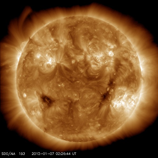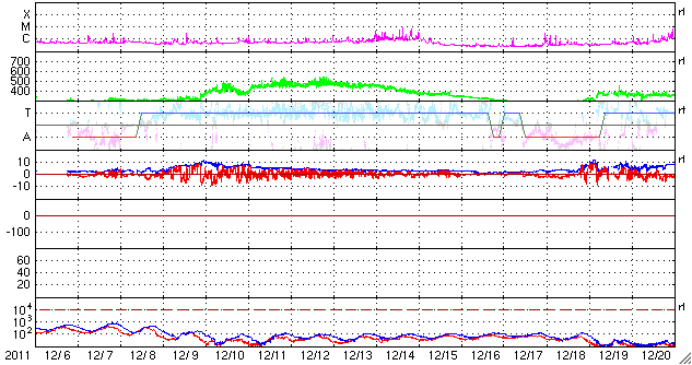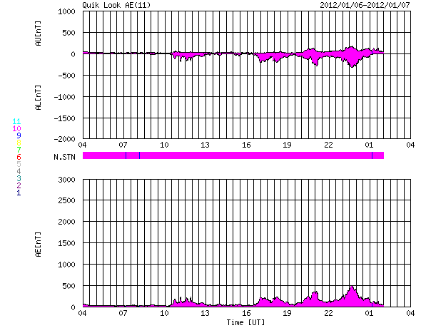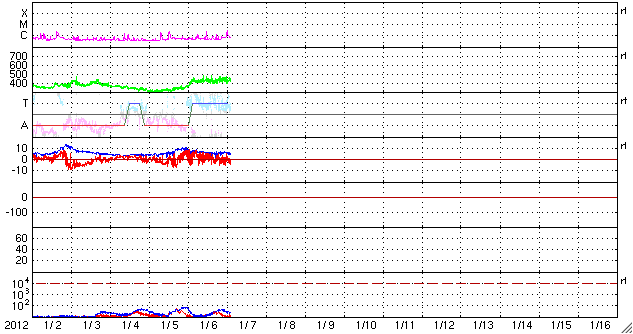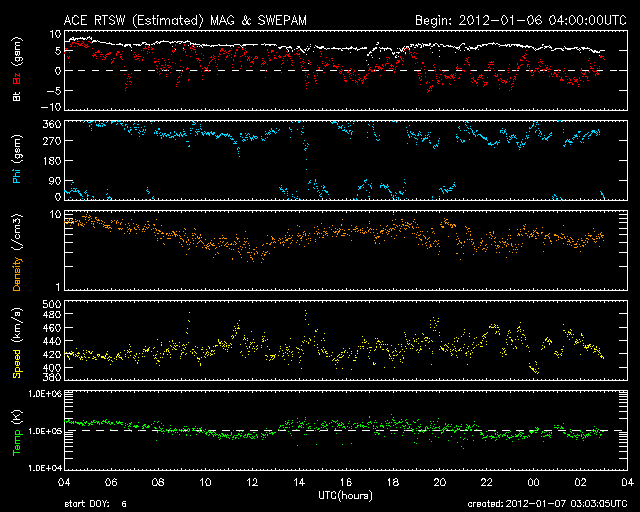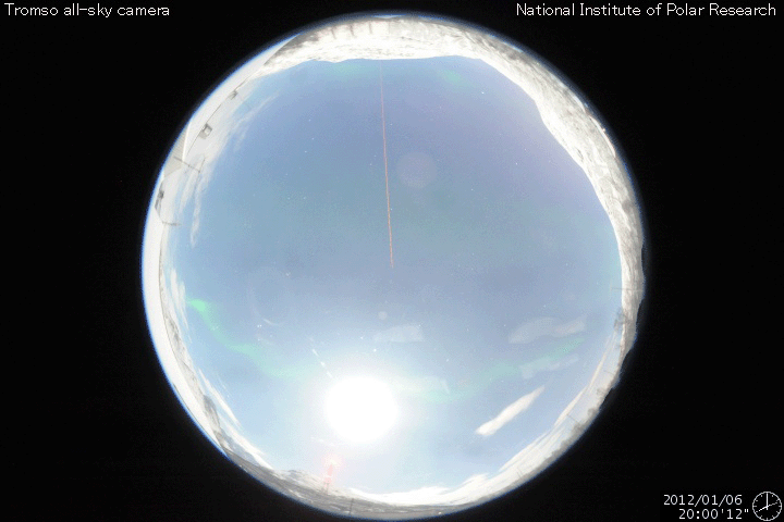 2012/ 1/ 7 12:03 更新 太陽風は440km/秒に少し上がり、小規模のオーロラが発生しています。 担当 篠原 太陽風の速度は、420km/秒から440km/秒に少し上がりましたが、 平均的な速度で安定しています。 一方、磁場強度は8nTから5nTにゆっくりと下がっています。 27日周期の図を見ると、 前周期は、今日以降に相当する12月11日に 速度の高まりの第二波がやって来ました。 そして、SDO衛星AIA193の太陽コロナ写真を見ると、 コロナホールは西側に半分ほど移動したところで、 影響が強まってくるタイミングです。 このため、太陽風の速度がこれからもう一段上がる可能性もありそうです。 磁気圏では、小規模のオーロラ活動が発生しています。 AE指数のグラフでは、200〜500nTの変動が断続的に発生しています。 この中の小さな変化ですが(200〜300nT)、 世界時6日20〜21時のノルウェー・トロムソのオーロラをご覧ください。 大きな月が南の空に明るく光っていて、オーロラ観望にはやや不利な条件です。 また、後半は雲がかかってしまいました。 太陽風速度の弱い高まりはもうしばらく続きそうで、 今日、明日はオーロラ観望もチャンスでしょう。 太陽は、比較的静かな状態が続いています。 6日20時(世界時6日11時)にC2.2、 今朝、7日9時(世界時7日0時)にC2.7を 1392黒点群が起こしている程度です。 ノルウェー・トロムソの全天カメラにより撮影された、オーロラの様子。 (c) 国立極地研究所、(動画加工 : 宇宙天気ニュース) ![]() SDO衛星のAIA193カメラによる太陽コロナの様子 (c) SDO (NASA) ![]() SDO衛星による太陽の可視光写真。マウスの矢印を写真に重ねると、黒点番号付きの写真に切り替わります。 (c) SDO (NASA) ![]() ACEが観測した太陽風の磁場(1番上の枠、白線は全体の強度、赤線は南北成分) および、太陽風の密度(3番目の橙線)、速度(4番目の黄線) (c) NOAA/SWPC ![]() リアルタイムAE指数 下段のAEグラフの値が高くなると、オーロラ活動が活発化しています。 (c) 京都大学, NICT ![]() 27日の太陽周期に合わせたデータプロット 太陽が同じ面を地球に向けていた27日前の変化から、今後を予想することができます。 (c) 作図:宇宙天気ニュース