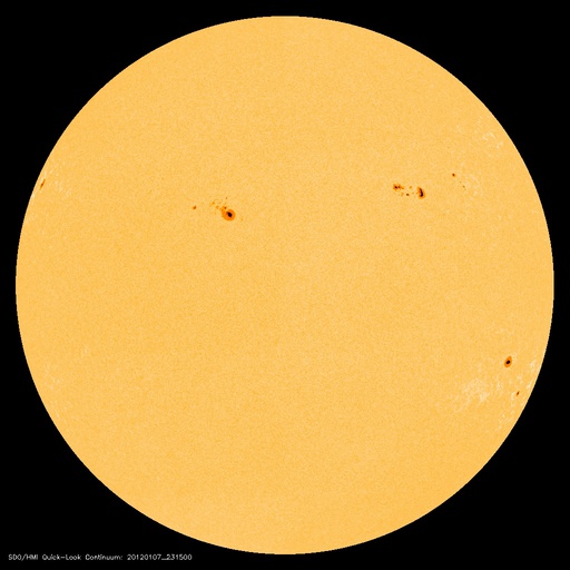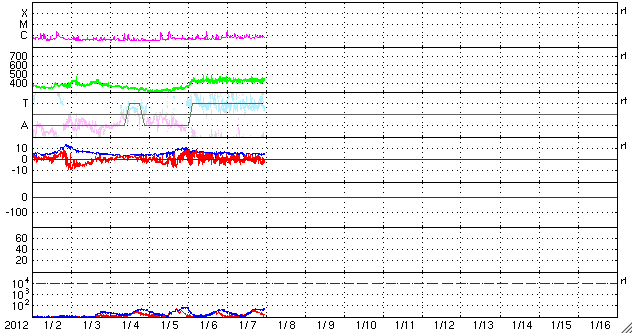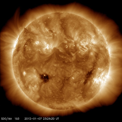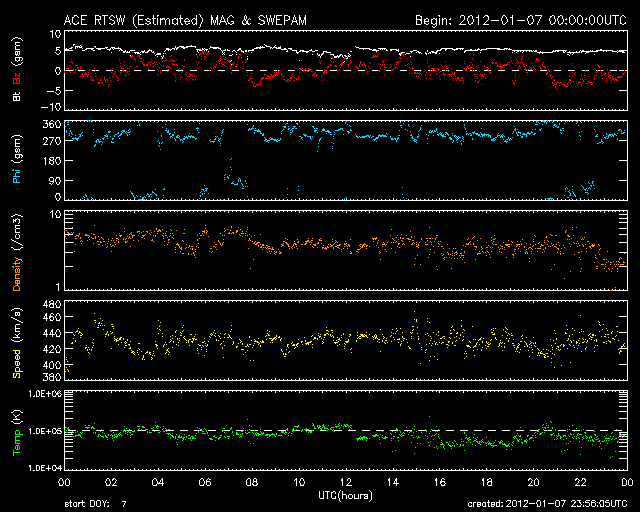 2012/ 1/ 8 08:57 更新 太陽風は平均的な状態で、磁気圏も比較的穏やかです。 担当 篠原 太陽風は、速度は420〜440km/秒、磁場強度は5nTと、 平均的な状態で安定しています。 コロナホールの影響は、 目立つほどにはならなかった様です。 磁場の南北成分は、 0nT付近を南北に小さく振れています このため、磁気圏のオーロラ活動は小規模に留まり、 AE指数は200〜300nT程度と小さく変化するくらいです。 27日周期の図を見ると、 前周期の太陽風速度の高まりは、 もう2日ほど続いています。 この後、磁場強度が下がってくると、 速度も下がり始めるでしょう。 SDO衛星AIA193では、 太陽の左下側に小さなコロナホールがあります。 5日後くらいに、ここの影響が多少やってくるかもしれません。 太陽は、C1の小さな小規模フレアが2回起きた程度で、 穏やかです。 東端から新しい黒点群が顔を出しています。 SDO衛星のAIA193カメラによる太陽コロナの様子 (c) SDO (NASA) ![]() SDO衛星による太陽の可視光写真。マウスの矢印を写真に重ねると、黒点番号付きの写真に切り替わります。 (c) SDO (NASA) ![]() ACEが観測した太陽風の磁場(1番上の枠、白線は全体の強度、赤線は南北成分) および、太陽風の密度(3番目の橙線)、速度(4番目の黄線) (c) NOAA/SWPC ![]() リアルタイムAE指数 下段のAEグラフの値が高くなると、オーロラ活動が活発化しています。 (c) 京都大学, NICT ![]() 27日の太陽周期に合わせたデータプロット 太陽が同じ面を地球に向けていた27日前の変化から、今後を予想することができます。 (c) 作図:宇宙天気ニュース