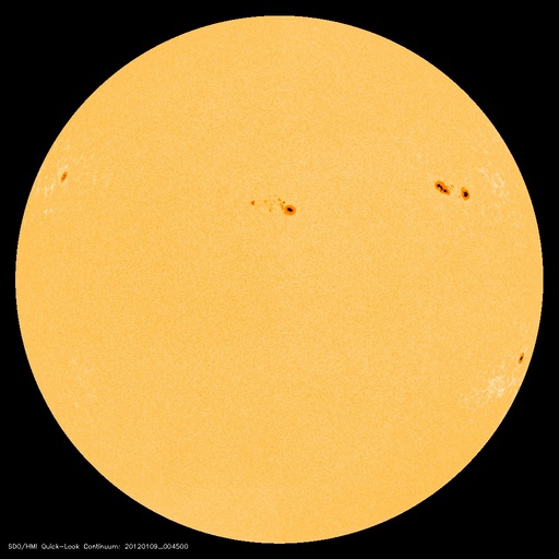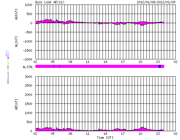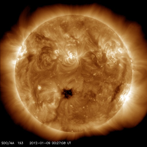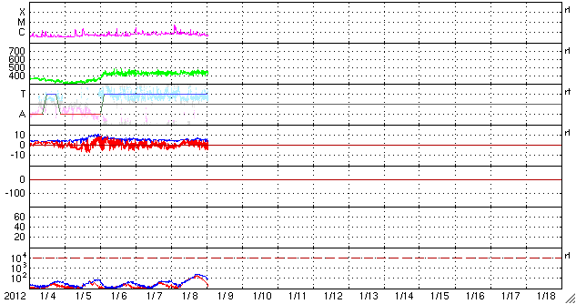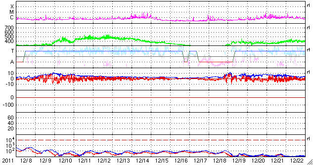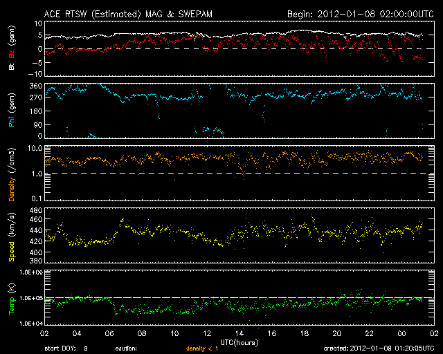 2012/ 1/ 9 10:21 更新 太陽風は400km/秒台前半で安定し、磁気圏も静穏です。C5のフレアが発生しています。 担当 篠原 太陽風の速度は、420〜440km/秒で安定した状態が続いています。 27日周期の図を見ると、 3日間に渡って一直線の様に安定しています。 磁場強度も、5nTで安定しています。 コロナホールの影響は、もうしばらく続きそうです。 磁気圏の活動は穏やかで、 AE指数は、連続的に変化していますが、 小さな変化しか見られません。 SDO衛星AIA193に見えている 小さなコロナホールは、 太陽の中心線に達しつつあります。 12〜13日くらいから、 太陽風に弱い乱れが発生するかもしれません。 太陽では、南西(右下)の端でC4.9の小規模フレアが起きました。 もう没した領域なので今後は影響ありません。 また、北西(右上)寄りの1393黒点群では、 C2.9、C1.9の小規模フレアが発生しています。 この群はやや発達している様ですが、 全体的には穏やかに推移しそうです。 SDO衛星のAIA193カメラによる太陽コロナの様子 (c) SDO (NASA) ![]() SDO衛星による太陽の可視光写真。マウスの矢印を写真に重ねると、黒点番号付きの写真に切り替わります。 (c) SDO (NASA) ![]() ACEが観測した太陽風の磁場(1番上の枠、白線は全体の強度、赤線は南北成分) および、太陽風の密度(3番目の橙線)、速度(4番目の黄線) (c) NOAA/SWPC ![]() リアルタイムAE指数 下段のAEグラフの値が高くなると、オーロラ活動が活発化しています。 (c) 京都大学, NICT ![]() 27日の太陽周期に合わせたデータプロット 太陽が同じ面を地球に向けていた27日前の変化から、今後を予想することができます。 (c) 作図:宇宙天気ニュース