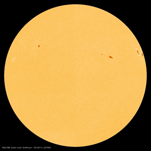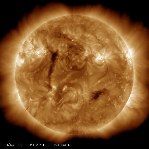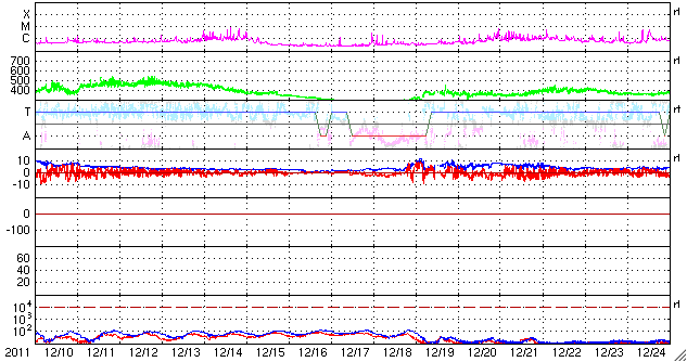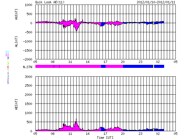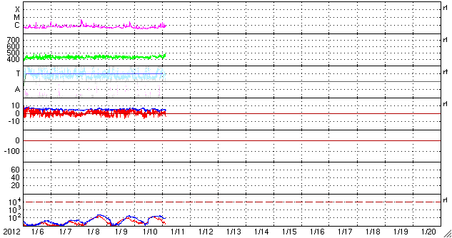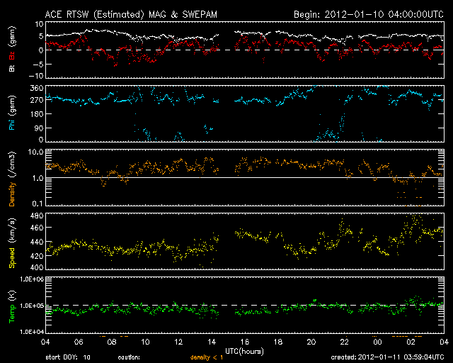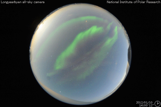 2012/ 1/11 13:00 更新 太陽風は460km/秒近くに少し上がっています。C1〜C2のフレアが発生しています。 担当 篠原 400km/秒台前半の太陽風が安定して続いています。 昨日から420〜440km/秒の速度を保っていますが、 今朝からは440〜460km/秒に若干上がっている様に見えます。 磁場強度も、5nTと平均的な強さで安定しています。 磁場の南北成分は、ふらふらと時々南を向き、 AE指数で200〜500nTの小規模のオーロラ活動を所々起こしています。 その中の世界時10日14〜15時頃、 ノルウェーの北、スバールバル島Longyearbyenで撮影されたオーロラの動画です。 スバールバル島はオーロラ帯よりも緯度が高い地域にあります。 このため、この時間帯のAE指数はあまり振れていませんでしたが、 オーロラの活動はある程度発生していた様です。 SDO衛星AIA193を見ると、 南半球のコロナホールは、次第に西に寄っています。 明日の後半か明後日くらいから、弱い影響がやって来る可能性があります。 太陽は、西の端の活動領域でC1〜C2の小さな小規模フレアが連続的に発生しています。 この領域の活動度がやや上がった様ですが、 すぐに西に没するので今後の影響はありません。 ノルウェーのスバールバル島Longyearbyenで全天カメラによって撮影されたオーロラ。 (c) 国立極地研究所、(動画加工 : 宇宙天気ニュース) ![]() SDO衛星のAIA193カメラによる太陽コロナの様子 (c) SDO (NASA) ![]() SDO衛星による太陽の可視光写真。マウスの矢印を写真に重ねると、黒点番号付きの写真に切り替わります。 (c) SDO (NASA) ![]() ACEが観測した太陽風の磁場(1番上の枠、白線は全体の強度、赤線は南北成分) および、太陽風の密度(3番目の橙線)、速度(4番目の黄線) (c) NOAA/SWPC ![]() リアルタイムAE指数 下段のAEグラフの値が高くなると、オーロラ活動が活発化しています。 (c) 京都大学, NICT ![]() 27日の太陽周期に合わせたデータプロット 太陽が同じ面を地球に向けていた27日前の変化から、今後を予想することができます。 (c) 作図:宇宙天気ニュース