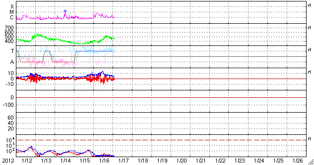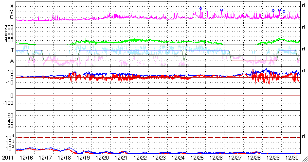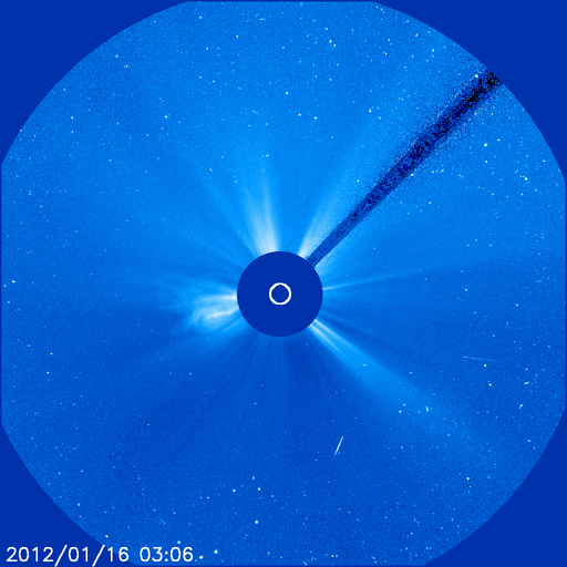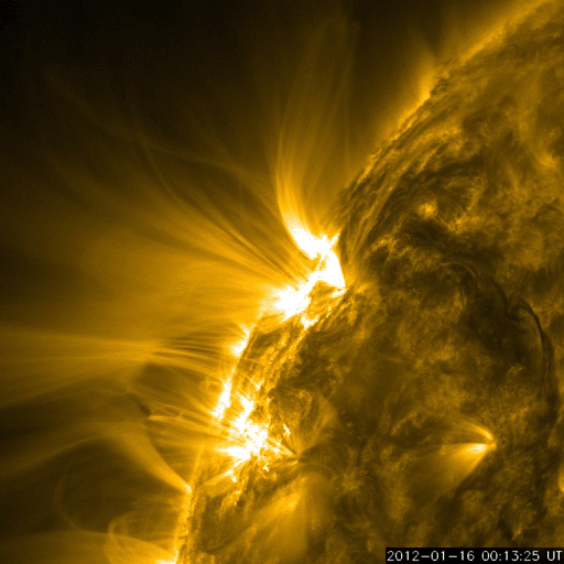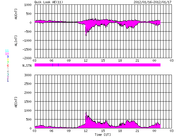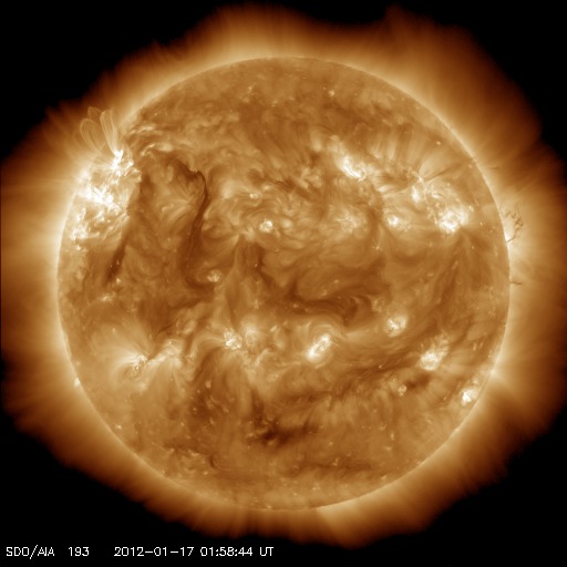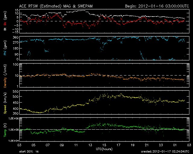 2012/ 1/17 11:25 更新 太陽でCクラスのフレアが続いています。太陽風はやや高速になり、オーロラの活動も高まっています。 担当 篠原 昨日の昼、16日12時(世界時16日3時)頃、 太陽の北東側(左上)の端に近い1402黒点群で、 C6.5の小規模フレアが発生しました。 X線の変化が長時間続くタイプのフレアです。 このフレアの後に見られたポストフレアループの様子を、 SDO衛星AIA171の動画で紹介します。 爆発の後、美しいループが次々に輝いています。 そして、CME(太陽ガスの放出現象)も発生しています。 こちらは、SOHO衛星LASCO C3の動画をご覧ください。 太陽の左側に向かって、派手に白いガスが噴き出しています。 地球からは横に向かっているので、影響はほとんどないでしょう。 (CMEの端がいくらか地球に向かっているかもしれません) 太陽では、この後もすぐ近くの1401黒点群でC3.9、C5.5、C3.0、C3.9と、 中くらいのCクラスフレアが続いています。 引き続き太陽の活動に注目してください。 太陽風は、昨夜、16日19時(世界時19日10時)頃から更に速度が上昇し、 500km/秒に達する高速風になりました。 現在は少し下がって、460km/秒とやや高速というくらいです。 速度の上昇に先立って、太陽風の磁場強度が10nTを超えるくらいに強まりました。 その辺りで、-5nTくらいの南向き磁場が到来して、 オーロラの活動を強めました。 ライブカメラによると、アラスカではきれいなオーロラの活動が見られたようです。 AE指数では、最大800nTに達する中規模の活動が発生し、 その後、400nTくらいの小規模の変動が続いています。 磁場の南向きはそれほど強まらなかったので、活動はこの程度で留まっています。 速度が上がり切るとともに、磁場強度は下がって、 現在は5nTと平均的なレベルに戻っています。 コロナホールの規模から考えて、 太陽風速度の高まりは、明日くらいまででしょう。 その後、太陽風は再び低速風に変わると思います。 SDO衛星のAIA171カメラによる、太陽東側のポストフレアループの様子。 (c) SDO (NASA)、 (写真加工 : 宇宙天気ニュース) ![]() SOHO LASCO C3による、太陽東側のCMEの噴出。 (c) SOHO (ESA & NASA)、 (動画加工 : 宇宙天気ニュース) ![]() SDO衛星のAIA193カメラによる太陽コロナの様子 (c) SDO (NASA) ![]() SDO衛星による太陽の可視光写真。マウスの矢印を写真に重ねると、黒点番号付きの写真に切り替わります。 (c) SDO (NASA) ![]() GOES衛星の太陽X線データ (c) NOAA/SWPC ![]() ACEが観測した太陽風の磁場(1番上の枠、白線は全体の強度、赤線は南北成分) および、太陽風の密度(3番目の橙線)、速度(4番目の黄線) (c) NOAA/SWPC ![]() リアルタイムAE指数 下段のAEグラフの値が高くなると、オーロラ活動が活発化しています。 (c) 京都大学, NICT ![]() 27日の太陽周期に合わせたデータプロット 太陽が同じ面を地球に向けていた27日前の変化から、今後を予想することができます。 (c) 作図:宇宙天気ニュース