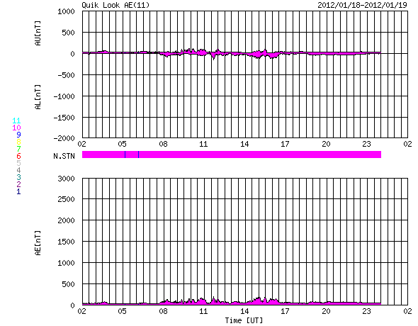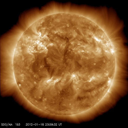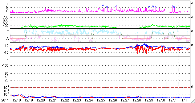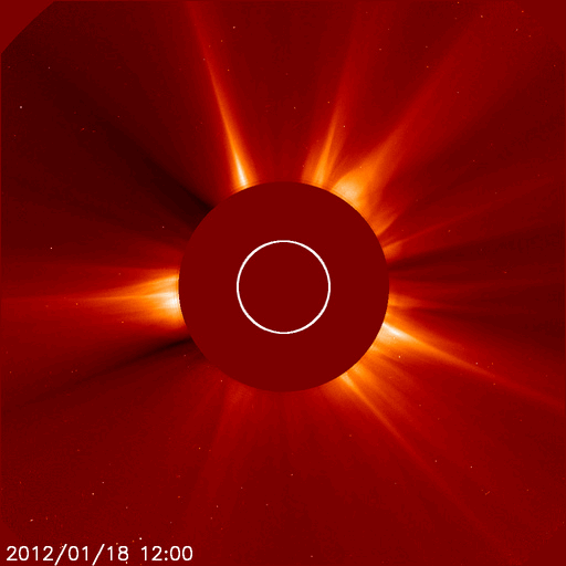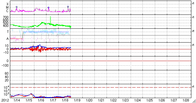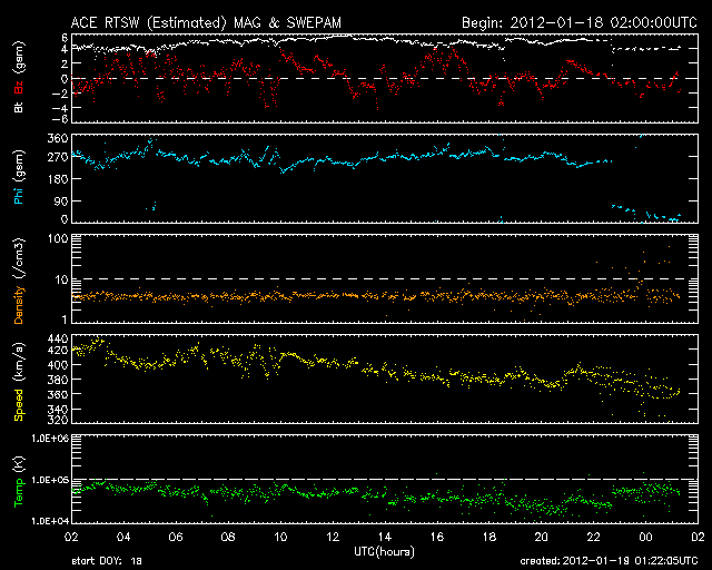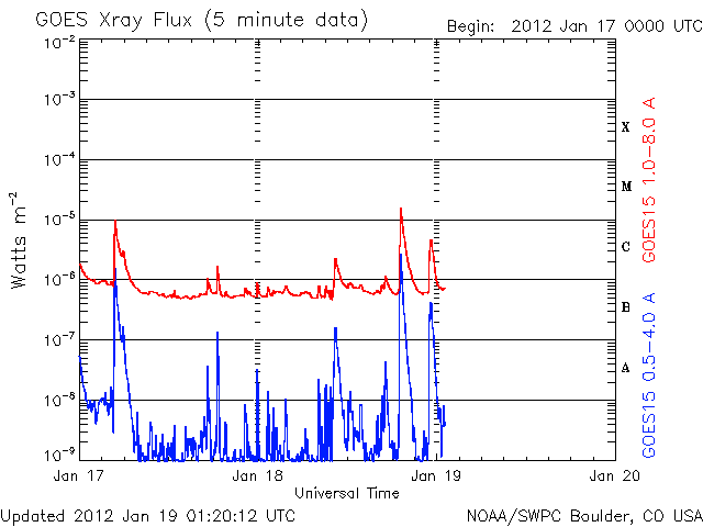 2012/ 1/19 10:22 更新 太陽でMクラスのフレアやCMEが発生しています。太陽風は低速になり、磁気圏も静かです。 担当 篠原 今日の早朝、19日4時(世界時18日19時)に、 太陽の東側の1401黒点群でM1.7の中規模フレアが発生しました。 続いて、19日8時(世界時18日23時)には、 西側の1396黒点群でC5.1の小規模フレアが発生しています。 2つの様子を、GOES15衛星のX線写真の動画でご覧ください。 また、これらに先立って、 18日22時(世界時18日13時)頃には、 太陽の南側へ弱いCME(太陽ガスの放出現象)が噴き出しています。 1399黒点群で発生した小さいフレアに関係しているようです。 CMEは太陽の中心付近で発生していますが、 STEREO BehindのCOR2によると、CMEは南斜めに向かって噴き出しています。 このため、地球への影響は弱いでしょう。 22日か23日くらいの太陽風に小さな変動が見られるかもしれません。 太陽風は、少しずつ速度を下げて、370km/秒と低速風に変わっています。 コロナホールの影響から抜けきった様です。 磁気圏も穏やかで、 AE指数は小さな変化は見られますが、全体としては静かです。 この後、16日に発生したCMEの影響がやって来るかもしれません。 太陽風の磁場や速度に小規模の変化が発生し、 オーロラの活動も高める可能性があります。 しかし、変化としては弱いものに留まりそうです。 それ以降は、低速の穏やかな太陽風が続き、磁気圏も静かでしょう。 GOES-15のX線カメラによる、太陽の東と西で発生したフレア。 (c) NOAA/SWPC 、(動画加工 : 宇宙天気ニュース) ![]() SOHO LASCO C2カメラと、STEREO Behind COR2カメラによる南方向の弱いCME。 (c) SOHO (ESA & NASA)、STEREO (NASA)、(動画加工 : 宇宙天気ニュース) ![]() SDO衛星のAIA193カメラによる太陽コロナの様子 (c) SDO (NASA) ![]() SDO衛星による太陽の可視光写真。マウスの矢印を写真に重ねると、黒点番号付きの写真に切り替わります。 (c) SDO (NASA) ![]() GOES衛星の太陽X線データ (c) NOAA/SWPC ![]() ACEが観測した太陽風の磁場(1番上の枠、白線は全体の強度、赤線は南北成分) および、太陽風の密度(3番目の橙線)、速度(4番目の黄線) (c) NOAA/SWPC ![]() リアルタイムAE指数 下段のAEグラフの値が高くなると、オーロラ活動が活発化しています。 (c) 京都大学, NICT ![]() 27日の太陽周期に合わせたデータプロット 太陽が同じ面を地球に向けていた27日前の変化から、今後を予想することができます。 (c) 作図:宇宙天気ニュース
