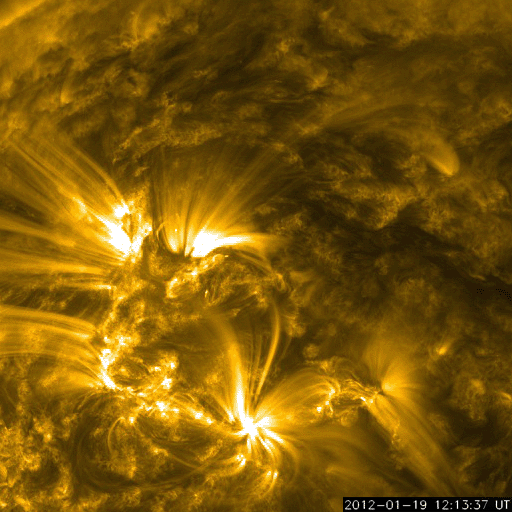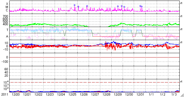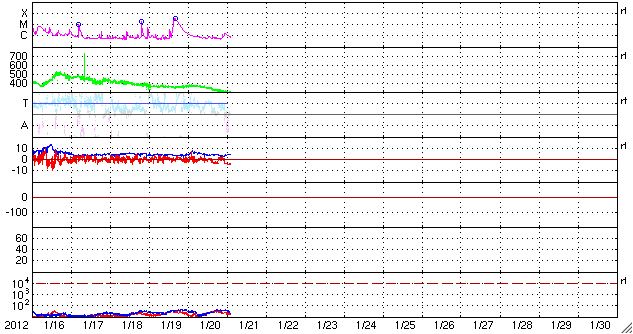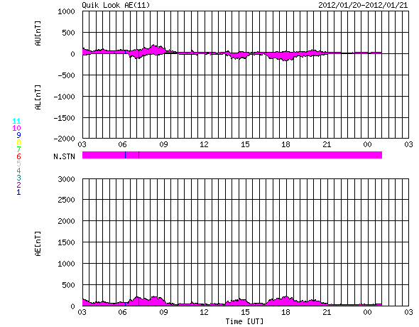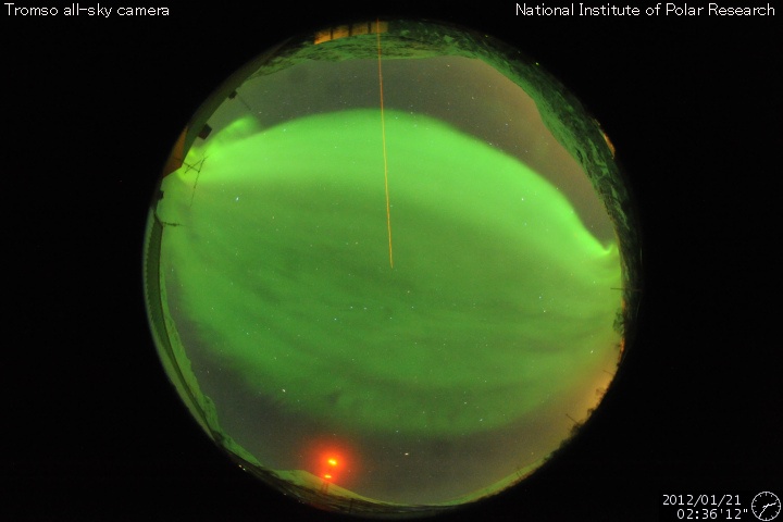 2012/ 1/21 11:48 更新 太陽は穏やかで、太陽風の速度はかなり遅くなっています。南向き磁場の影響でオーロラがやや強まっています。 担当 篠原 昨日お知らせしたM3.2のフレアの後、 1402黒点群付近で美しいポストフレアループが見えています。 SDO衛星AIA171による拡大写真の動画を掲載します。 世界時19日14時にフレアの爆発が始まって、 それ以降、コロナループが次々と輝いています。 光っているループの足下は、 黒点群の持つ磁場のN極、S極にそれぞれ繋がっています。 動画の最後に、SDO衛星の磁場写真と可視光写真を加えてみました。 磁場写真の白はN極、黒はS極に相当します。 ループの根元の位置や、黒点の見え方などを見比べてみて下さい。 ただし、3枚の写真の位置は私が適当に合わせただけですので、 だいたいの目安と考えて下さい。 太陽は、この1402黒点群を含めて、4つの黒点群が北半球のまん中に集まっています。 M3フレア以降は目立った活動はなく、先ほど、C1の小規模フレアが起きた程度です。 黒点群の規模は大きく、引き続き、フレアの発生には注意が必要でしょう。 太陽風は、速度が更に下がり、 300km/秒とかなり遅くなっています。 磁場強度は4〜5nTと平均的な強さで安定していますが、 図の後半で、南北成分が、まるでスイッチが切り替わるように南北に振れています。 この影響で、オーロラの活動がやや高まっていて、 ノルウェーのトロムソでは、ちょうど今、きれいなオーロラが空を飾っています。 その最新の1枚をどうぞ。 周囲の雪景色にもオーロラの光が映っています。 磁場が南向きに振れていますが、速度がだいぶ遅いので、 オーロラの活動としては小規模に留まるでしょう。 明日の22日の午後から23日にかけて、 昨日お知らせしたCMEが地球に到来する可能性があります。 太陽風の変化によって、オーロラの活動も活発化する可能性があります。 それまでは、現在の速度の遅い太陽風が続き、 磁気圏も基本的には穏やかでしょう。 SDO衛星のAIA171カメラによる、1402黒点群付近のポストフレアループ。 (c) SDO (NASA)、 (写真加工 : 宇宙天気ニュース) ![]() ノルウェー・トロムソの全天カメラにより撮影されたオーロラ。 (c) 国立極地研究所 ![]() SDO衛星のAIA193カメラによる太陽コロナの様子 (c) SDO (NASA) ![]() SDO衛星による太陽の可視光写真。マウスの矢印を写真に重ねると、黒点番号付きの写真に切り替わります。 (c) SDO (NASA) ![]() GOES衛星の太陽X線データ (c) NOAA/SWPC ![]() ACEが観測した太陽風の磁場(1番上の枠、白線は全体の強度、赤線は南北成分) および、太陽風の密度(3番目の橙線)、速度(4番目の黄線) (c) NOAA/SWPC ![]() リアルタイムAE指数 下段のAEグラフの値が高くなると、オーロラ活動が活発化しています。 (c) 京都大学, NICT ![]() 27日の太陽周期に合わせたデータプロット 太陽が同じ面を地球に向けていた27日前の変化から、今後を予想することができます。 (c) 作図:宇宙天気ニュース