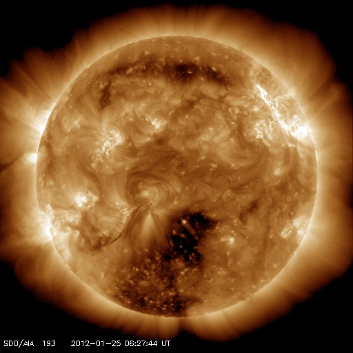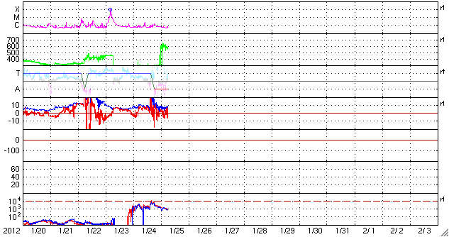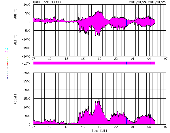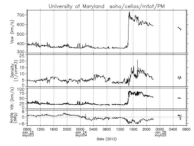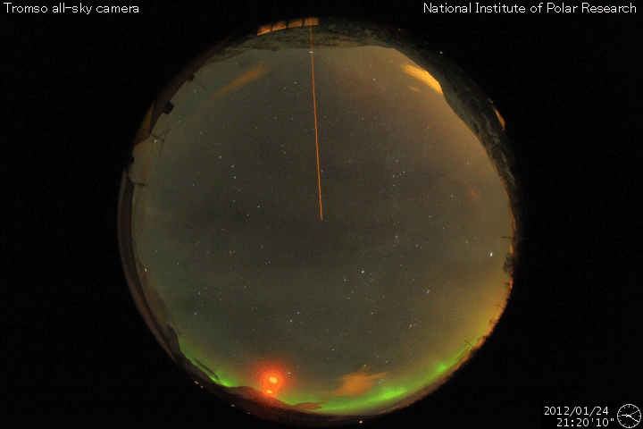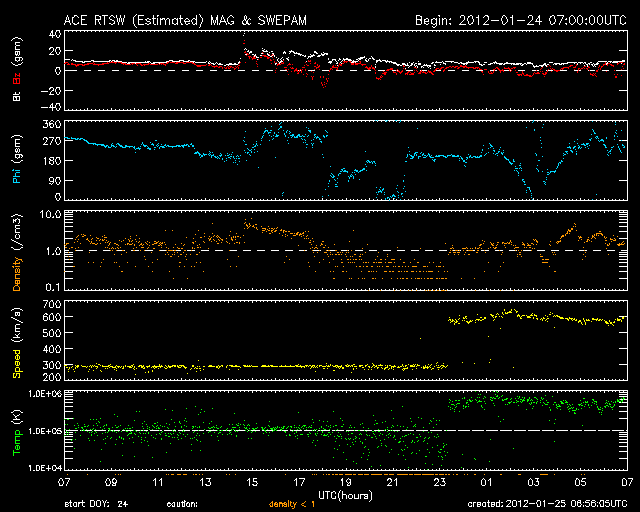 2012/ 1/25 15:56 更新 CMEによる太陽風の擾乱が到来し、磁気圏の活動が活発に起きました。 担当 篠原 今日は多忙のため、昼までの更新ができませんでした。 申し訳ありません、 昨夜のニュースで紹介していましたが(こちらもご覧ください)、 昨夜遅く、太陽風の擾乱が地球に到達し、磁気圏に活発な活動を起こしました。 SOHOの観測によると、太陽風の速度は750km/秒に上昇しています。 そして、ACEの観測によると、磁場強度は初め40nTに強まり、 その後すぐに下がって20nTとなっています。 注目の南北成分は、北向きに振れ、そのため、磁気圏への影響度はだいぶ小さくなりました。 AE指数では、最高で1500nTと、大規模な変動は起きましたが、 特別激しい変化にはなりませんでした。 トロムソの全天カメラの様子を掲載します。 もし、太陽風磁場の変化が南向きだったとすると、かなり活発な磁気圏活動になったでしょう。 太陽放射線の強度が下がり、ACEの太陽風の速度データが戻ってきました。 現在は600km/秒と普通の高速風程度の速さです。 磁場強度は8nTと強まった状態です。 引き続き、通常レベルとしての活発なオーロラ活動は期待できます。 今回の変動に伴って、放射線帯の高エネルギー電子も高まっています。 ぎりぎり10000には達したくらいですが、今後も更に上昇する可能性があります。 SOHO衛星プロトンモニターによる太陽風の速度変化。2日間。 (c) University of Maryland ![]() ノルウェー・トロムソの全天カメラにより撮影されたオーロラ。 (c) 国立極地研究所、(動画加工 : 宇宙天気ニュース) ![]() SDO衛星のAIA193カメラによる太陽コロナの様子 (c) SDO (NASA) ![]() SDO衛星による太陽の可視光写真。マウスの矢印を写真に重ねると、黒点番号付きの写真に切り替わります。 (c) SDO (NASA) ![]() ACEが観測した太陽風の磁場(1番上の枠、白線は全体の強度、赤線は南北成分) および、太陽風の密度(3番目の橙線)、速度(4番目の黄線) (c) NOAA/SWPC ![]() リアルタイムAE指数 下段のAEグラフの値が高くなると、オーロラ活動が活発化しています。 (c) 京都大学, NICT ![]() GOES衛星による、静止衛星軌道における高エネルギー電子の変化 (c) NOAA/SWPC ![]() 27日の太陽周期に合わせたデータプロット 太陽が同じ面を地球に向けていた27日前の変化から、今後を予想することができます。 (c) 作図:宇宙天気ニュース