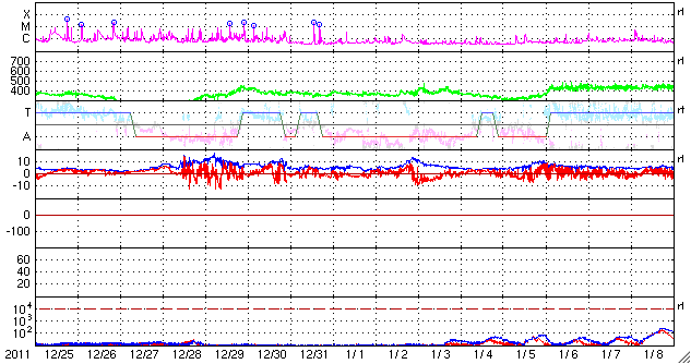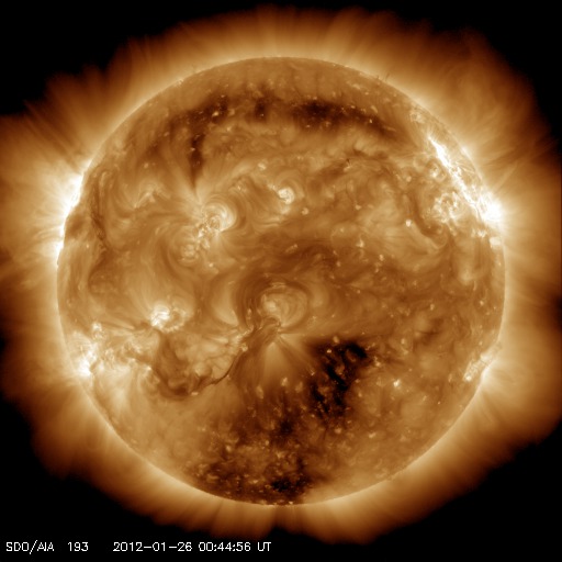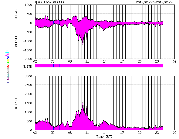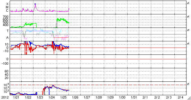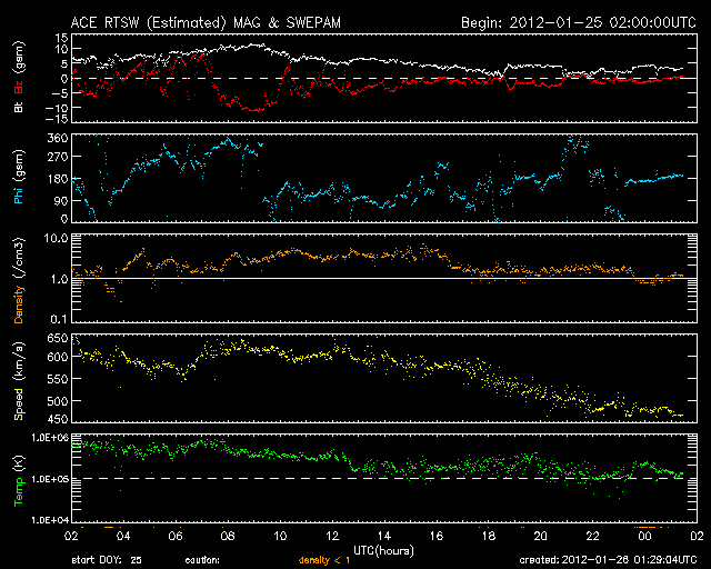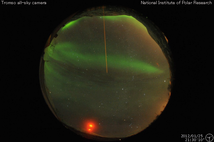 2012/ 1/26 10:29 更新 太陽風の乱れは終わりに近づいています。太陽も黒点が少なくなっています。 担当 篠原 24日の深夜にやって来た太陽風の擾乱は、1日半を経過して終わりに近づいています。 到来時750km/秒に上がった太陽風の速度は、 昨夜までは600km/秒台を保っていましたが、 今朝にかけて低下が始まり、現在は470km/秒とやや高速程度に下がっています。 また、最大40nTに強まった磁場強度も、昨夜からは5nTと通常の強さに戻っています。 7年ぶりに大きく増加した太陽放射線(高速の陽子)も、 太陽風擾乱の通過後は大きく下がって、現在は100くらいです。 まだ警戒レベルを超えていますが、今後もゆっくりと下がって行くでしょう。 磁気圏内部の放射線帯の高エネルギー電子は、 昨日、増加をお知らせしましたが、 その後はむしろ低下して、今日は1000以下に下がっています。 磁気圏内では、600km/秒の高速太陽風の影響で、 活発なオーロラの活動が続いていました。 AE指数のグラフは、500nTの中規模変動から、 世界時25日10時には最高1500nTに達する大きな変動も見られています。 これは、太陽風の磁場が一時的に-10nTと大きく南を向いた影響です。 この時間帯ではありませんが、 トロムソで世界時25日22時頃に見られたオーロラの様子を 全天カメラの動画で紹介します。 嵐が一息ついたところで、今後の様子を見てみましょう。 SDO衛星AIA193の太陽コロナ写真を見ると、 南半球に広がる大きなコロナホールが、西側に次第に移動しています。 そろそろ太陽風に影響が及び始めてもよい頃です。 少し緯度が高めにあるので、地球への影響は弱めになると考えられます。 そのため、前周期もコロナホールは広がっていたのですが、 目立った速度の上昇はやって来ませんでした。 しかし、今回は低緯度側に少し広がっているので注目しています。 現在の太陽風の変化と混じって、 このままやや高めの速度が続くことになるかもしれません。 太陽は、1401、1402黒点群が西に去りつつあり、 寂しく見え始めています。 つい先ほど、26日9時半(世界時26日0時半)に、 去りつつある1402黒点群でC5.8の小規模フレアが発生しました。 この後は、しばらく静かな太陽になるかもしれません。 ノルウェー・トロムソの全天カメラにより撮影された、オーロラの活動。 (c) 国立極地研究所、(動画加工 : 宇宙天気ニュース) ![]() SDO衛星のAIA193カメラによる太陽コロナの様子 (c) SDO (NASA) ![]() SDO衛星による太陽の可視光写真。マウスの矢印を写真に重ねると、黒点番号付きの写真に切り替わります。 (c) SDO (NASA) ![]() ACEが観測した太陽風の磁場(1番上の枠、白線は全体の強度、赤線は南北成分) および、太陽風の密度(3番目の橙線)、速度(4番目の黄線) (c) NOAA/SWPC ![]() GOES衛星の太陽放射線データ (c) NOAA/SWPC ![]() GOES衛星による、静止衛星軌道における高エネルギー電子の変化 (c) NOAA/SWPC ![]() リアルタイムAE指数 下段のAEグラフの値が高くなると、オーロラ活動が活発化しています。 (c) 京都大学, NICT ![]() 27日の太陽周期に合わせたデータプロット 太陽が同じ面を地球に向けていた27日前の変化から、今後を予想することができます。 (c) 作図:宇宙天気ニュース