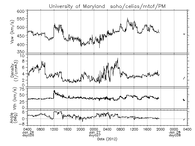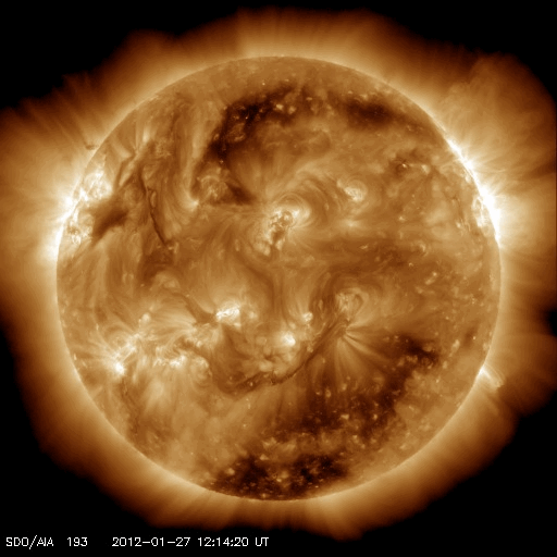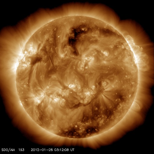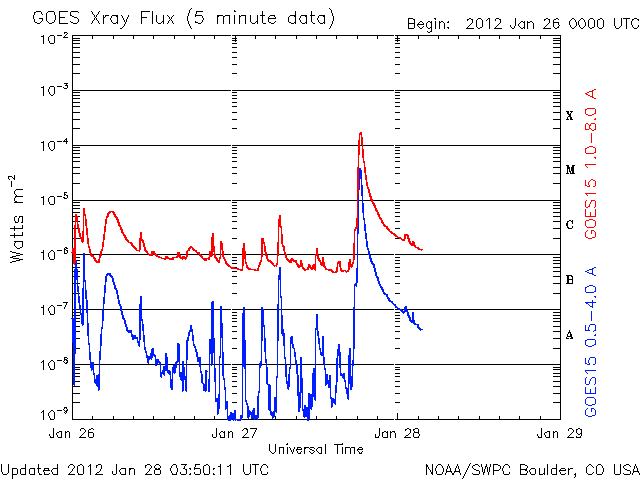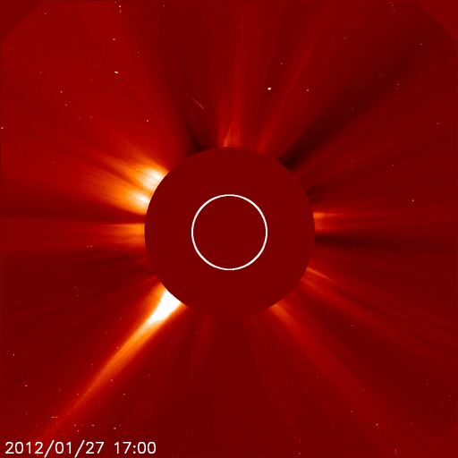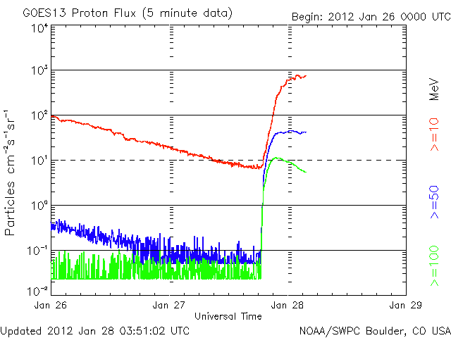 2012/ 1/28 12:52 更新 X1.7の大規模フレアが発生しました。太陽放射線が増加しています。CMEは横向きなので影響は小さいでしょう。 担当 篠原 今日の未明、28日3時(27日18時)に、 太陽の北西端に没しつつあった1402黒点群で、 X1.7の大規模フレアが発生しました。 23日のM8.7に続く、大きな活動です。 半ば太陽の向こう側に隠れていたので、 本当の規模はこれより大きかったのではないでしょうか。 SDO衛星AIA193による動画を掲載します。 爆発とその後のポストフレアループが美しく見えています。 このフレアにより、太陽放射線(非常に高速の陽子)が増加しています。 GOES衛星のグラフでは、700〜800程度に増加しています。 この影響で、ACE衛星の太陽風の速度データが一時的に異常になっています。 (黄色線のグラフが急に300km/秒に下がっている部分) また、CME(太陽ガスの放出現象)も発生しています。 SOHO衛星LASCO C2、C3による動画をご覧下さい。 写真の更新が午前4時までで止まっていて、 CMEの広がりは途中までしか写っていません。 太陽の真横で発生したので、地球への影響は小さいでしょう。 29日午後か30日くらいの太陽風に小規模の変化が到来するかもしれません。 最新の太陽風速度は、ACE衛星のデータが使えないので、 SOHO衛星の観測を参照して下さい。 今日の3枚目の図に掲載しています。 太陽風は、昨日のニュース以降、500km/秒台前半にまで速度が上がりました。 コロナホールの影響が強まったと思われます。 その後、少し下げて、500km/秒をやや下回るくらいの速度になっている様です。 最新のSDO衛星AIA193のコロナ写真によると、 南半球に見えているコロナホールは、 緯度は高くなりますが、まだ太陽の中心線付近まで広がっています。 このため、まだ3〜4日程度は弱まりながらも影響が残る可能性があります。 太陽風の速度が上がった影響で、 小規模ですがオーロラの活動が連続的に発生しています。 AE指数のグラフでは、300nT前後の変化が半日程度起きています。 グラフは、後半から静かになっていますが、 ACEの太陽風データを見ると、 この6時間ほど、磁場が-3nTくらいの南向きになっています。 この影響で再びオーロラ活動がある程度活発になると思います。 この後も、ライブカメラなどに注目して下さい。 放射線帯の高エネルギー電子は、3000くらいに増えています。 まだそれほど高くはありませんが、引き続き増加する可能性もあります。 SDO衛星AIA193による、太陽の西端で発生したXクラスフレア。 (c) SDO (NASA)、(動画加工 : 宇宙天気ニュース ) ![]() SOHO衛星LASCO C3による、CMEの噴出。 (c) SOHO (ESA & NASA)、(動画加工 : 宇宙天気ニュース) ![]() SOHO衛星プロトンモニターによる太陽風の速度変化。2日間。 (c) University of Maryland ![]() SDO衛星のAIA193カメラによる太陽コロナの様子 (c) SDO (NASA) ![]() SDO衛星による太陽の可視光写真。マウスの矢印を写真に重ねると、黒点番号付きの写真に切り替わります。 (c) SDO (NASA) ![]() GOES衛星の太陽X線データ (c) NOAA/SWPC ![]() GOES衛星の太陽放射線データ (c) NOAA/SWPC ![]() | ||||||||||||||||||||||||||||||||||||||||||||||||||||||||||||||||||||||||||||||||||||||||||||||||||||||||||||||||||||||||||||||||||||||||||||||||||||||||||||||||||||||||||||||||||||||||||||||||||||||||||||||||||||||||||||