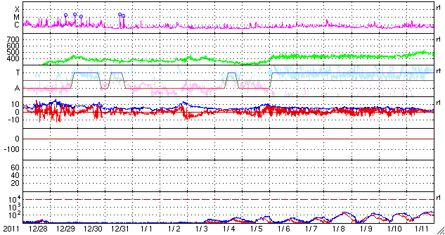SDO衛星のAIA193カメラによる太陽コロナの様子 (c) SDO (NASA) ![]() SDO衛星による太陽の可視光写真。マウスの矢印を写真に重ねると、黒点番号付きの写真に切り替わります。 (c) SDO (NASA) ![]() GOES衛星の太陽X線データ (c) NOAA/SWPC ![]() GOES衛星の太陽放射線データ (c) NOAA/SWPC ![]() ACEが観測した太陽風の磁場(1番上の枠、白線は全体の強度、赤線は南北成分) および、太陽風の密度(3番目の橙線)、速度(4番目の黄線) (c) NOAA/SWPC ![]() リアルタイムAE指数 下段のAEグラフの値が高くなると、オーロラ活動が活発化しています。 (c) 京都大学, NICT ![]() 27日の太陽周期に合わせたデータプロット 太陽が同じ面を地球に向けていた27日前の変化から、今後を予想することができます。 (c) 作図:宇宙天気ニュース