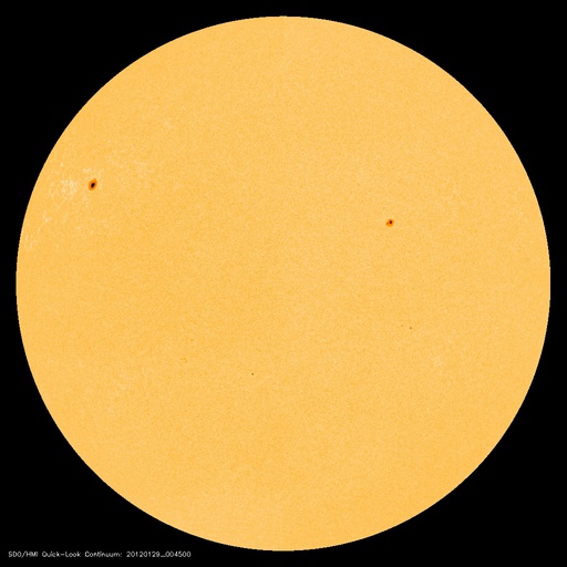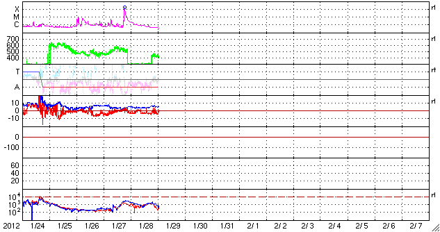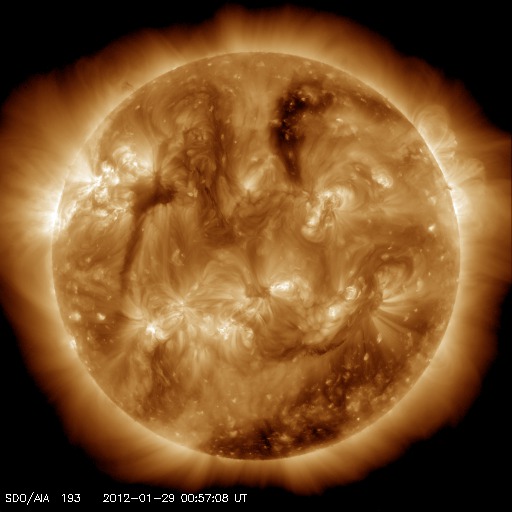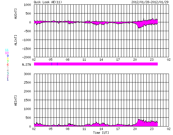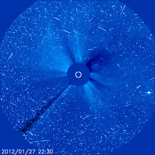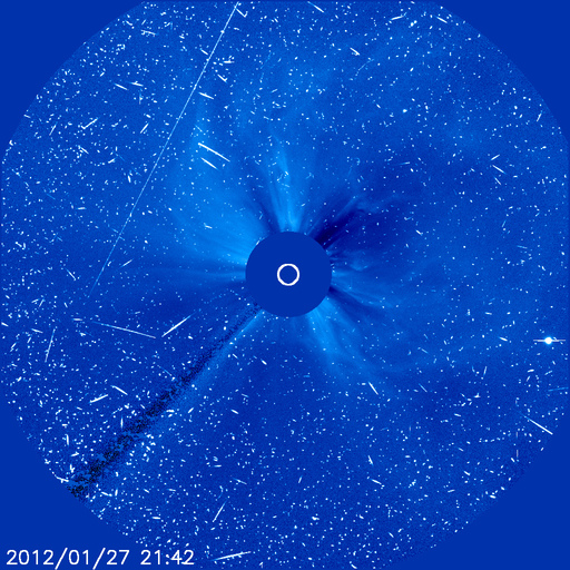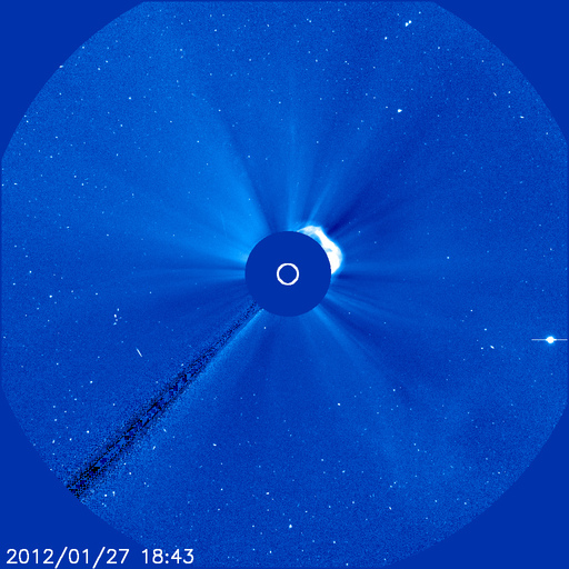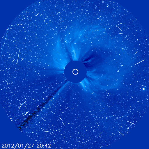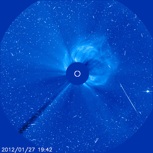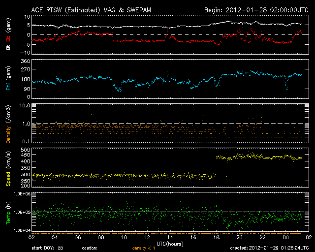 2012/ 1/29 10:27 更新 太陽は穏やかです。太陽風は平均的な状態で、弱いオーロラ活動が続いています。 担当 篠原 昨日のX1.7の大規模フレアを起こした1402黒点群は、 太陽の西に没してしまいました。 その後は、東側の1410黒点群でC1の小さなフレアが発生した程度で、 太陽は穏やかになっています。 太陽放射線もゆっくりと低下が続いています。 そのため、ACE衛星の太陽風データは今日の未明に回復しています。 現在の太陽風は、速度は430km/秒、磁場強度は5nTと、 どちらも平均的な値です。 コロナホールの影響はもう弱ってきた様です。 その中で、磁場は南向きの傾向がずっと続いています。 このため、磁気圏では弱いオーロラの活動が続いています。 AE指数では、200〜400nTくらいの変化です。 SOHO衛星で、X1.7フレアに続いて発生したCMEを見ると、 右上方向が中心ですが、太陽全体を包むように広がっています。 この様子から、地球方向にもガスが ある程度向かってきている可能性があります。 明日か明後日に太陽風の乱れが到来するかもしれません。 速度や磁場の変化によって、 オーロラもある程度活発化するかもしれません。 観望のチャンスと言えそうです。 放射線帯の高エネルギー電子の増加は止まっています。 特に高いレベルにはなりませんでした。 SOHO衛星 LASCO C3カメラの映像 (c) SOHO (ESA & NASA)