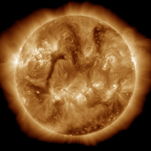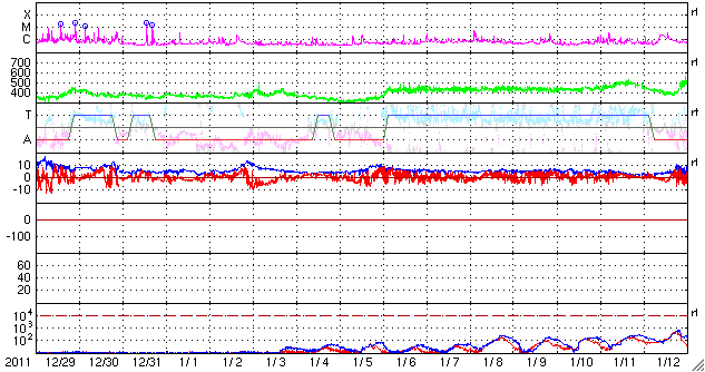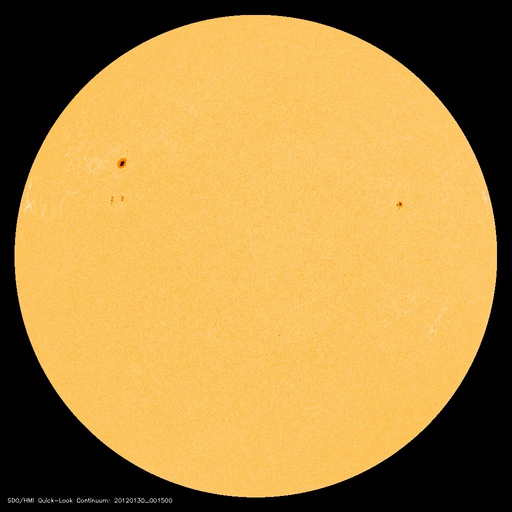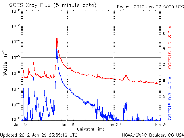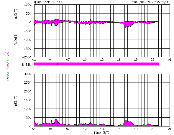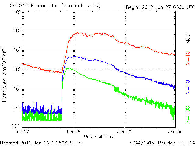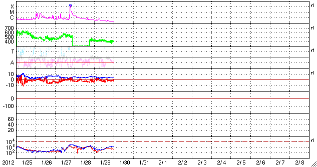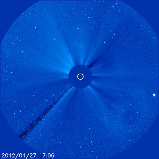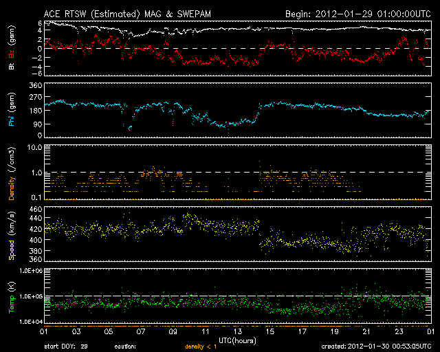 2012/ 1/30 09:53 更新 太陽は穏やかで、太陽風も平均的な状態です。これからCMEの影響が到来するかもしれません。 担当 篠原 昨日はCMEの動画を掲載できなかったので、 改めて、X1.7の大規模フレアに伴って発生したCMEの様子を紹介します。 発生地点が北西の端だったため、CMEのガスも右上方向を中心に広がっています。 この動画を見ていると、ぎりぎりですが、 地球方向(手前方向)にも噴出が広がっているように感じます。 今日か明日くらいに、ある程度の太陽風の乱れがやって来るかもしれません。 磁場の振れ具合によっては、活発なオーロラ活動も期待できます。 ライブカメラなどに注目してください。 SOHO衛星LASCO C3の動画では、 画面中に白い筋がちらちらとたくさん見えています。 これは、太陽放射線(非常に高速の陽子)が増加したために発生したノイズです。 CME発生の前はほとんど見えず、CMEの発生後に急激に増えているのが分かります。 動画の次に、3日間の太陽放射線のグラフを掲載しています。 ノイズの増加は、このグラフの左寄りの立ち上がりに対応しています。 CMEのガスが見えなくなる世界時28日0時以降は、動画の写真を1時間間隔にして、 その後1日半の経過を見ています。 すると、時間とともにノイズも減って行きます。 太陽放射線のグラフの後半は、ゆっくりと減少が続いています。 この図の右寄り、赤線がちょうど100を切る頃までを動画にしています。 現在の太陽は、フレア活動は特になく、穏やかな状態です。 小さいですが、新しい黒点群が発生しています。 また、東の1410、1413黒点群付近では小さな活動が続いていて、 今後発達する様だと、フレアの活動も高まりそうです。 太陽風は、速度は400km/秒、磁場強度4nTと平均的な状態で安定しています。 磁場の南北成分は、振れ幅は小さいですが、南寄りの傾向が続いていて、 AE指数によると、200〜400nT程度の小さなオーロラ活動が続いているようです。 今後の太陽風は、基本的には穏やかに推移しそうですが、 CMEの影響で一時的に強まるかもしれません。 どのタイミングで、どの程度の乱れがやって来るのか注目しています。 SOHO衛星LASCO C3による、北西方向へのCMEの噴出と太陽放射線によるノイズの変化。 (c) SOHO (ESA & NASA)、 (動画加工 : 宇宙天気ニュース) ![]() GOES衛星の太陽放射線データ (c) NOAA/SWPC ![]() SDO衛星のAIA193カメラによる太陽コロナの様子 (c) SDO (NASA) ![]() SDO衛星による太陽の可視光写真。マウスの矢印を写真に重ねると、黒点番号付きの写真に切り替わります。 (c) SDO (NASA) ![]() GOES衛星の太陽X線データ (c) NOAA/SWPC ![]() ACEが観測した太陽風の磁場(1番上の枠、白線は全体の強度、赤線は南北成分) および、太陽風の密度(3番目の橙線)、速度(4番目の黄線) (c) NOAA/SWPC ![]() リアルタイムAE指数 下段のAEグラフの値が高くなると、オーロラ活動が活発化しています。 (c) 京都大学, NICT ![]() 27日の太陽周期に合わせたデータプロット 太陽が同じ面を地球に向けていた27日前の変化から、今後を予想することができます。 (c) 作図:宇宙天気ニュース
