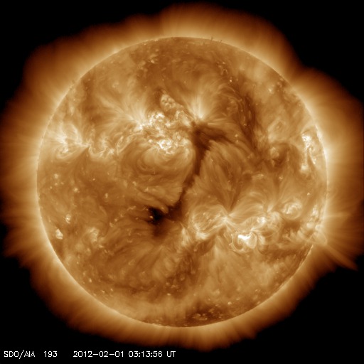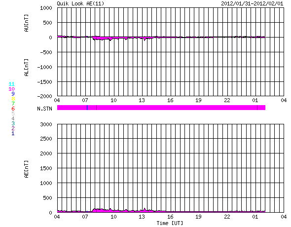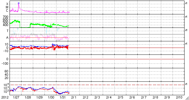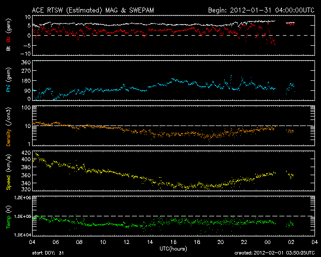 2012/ 2/ 1 12:50 更新 太陽風は低速になり、オーロラ活動は静かです。太陽も静穏です。 担当 篠原 昨日のニュース以降、太陽風の速度はどんどん下がって、 2月1日3時(世界時1月31日18時)には、330km/秒まで下がりました。 そこではね返って、現在は360km/秒です。 太陽風は低速の風になっています。 磁場強度は、5nTから6nT程度と平均的な強度で安定しています。 磁場の南北成分は北寄りに推移しています。 これに低速であることが重なって、磁気圏はたいへん静かです。 AE指数のグラフはほとんど変化していません。 太陽風は、今後も低速の穏やかな状態が続きそうです。 SDO衛星AIA193の太陽コロナ写真を見ると、 太陽の中心から北に向かって薄暗い領域がうねっています。 こちら側は、ダークフィラメントの様に見えます。 反対に南半球側の暗い部分は、コロナホールの様に見えます。 もしそうであれば、3日後の2月4日頃の太陽風に弱い影響があるかもしれません。 太陽も、X線のグラフは目立った変化はなく、 フレアの活動は穏やかです。 太陽の東側にも濃くに黒点群は見られないようで、 太陽も静かな状態が続きそうです。 SDO衛星のAIA193カメラによる太陽コロナの様子 (c) SDO (NASA) ![]() SDO衛星による太陽の可視光写真。マウスの矢印を写真に重ねると、黒点番号付きの写真に切り替わります。 (c) SDO (NASA) ![]() ACEが観測した太陽風の磁場(1番上の枠、白線は全体の強度、赤線は南北成分) および、太陽風の密度(3番目の橙線)、速度(4番目の黄線) (c) NOAA/SWPC ![]() リアルタイムAE指数 下段のAEグラフの値が高くなると、オーロラ活動が活発化しています。 (c) 京都大学, NICT ![]() 27日の太陽周期に合わせたデータプロット 太陽が同じ面を地球に向けていた27日前の変化から、今後を予想することができます。 (c) 作図:宇宙天気ニュース