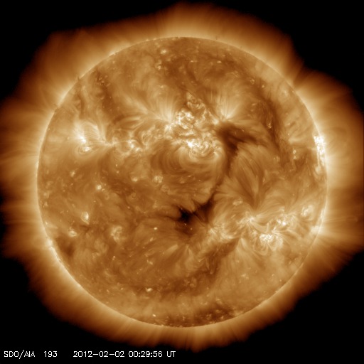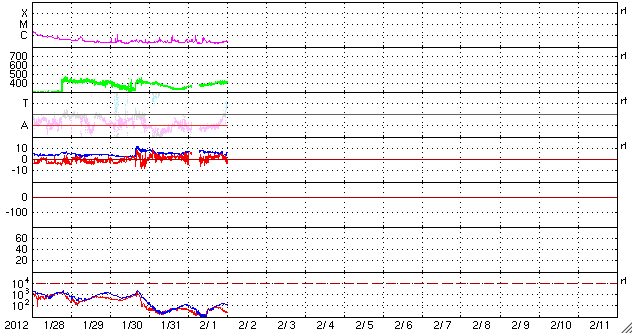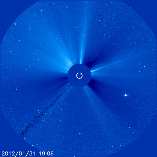 2012/ 2/ 2 09:54 更新 太陽のフレア活動は穏やかです。太陽風は平均的な速度です。 担当 篠原 一昨日の現象ですが、太陽の西端でプロミネンスの美しい変動が見られました。 SDO衛星AIA304による動画をご覧ください。 細いループが幾筋もゆらゆらと揺れて、やがてふわっと浮かび上がっています。 この続きは、SOHO衛星LASCO C3で見ることができます。 太陽の右側からループ状のCME(太陽ガスの放出現象)が、 ゆっくりと噴き上がっています。 地球に対して横方向の噴出なので、影響はありません。 SOHOの写真で右下に光っているのは、水星です。 来週の中頃に太陽に最も近付いて見えます。 太陽は、中央部に1410群、1413群と ふたつの黒点群がありますが、 どちらも活動度は低く、全体的に穏やかな状態です。 STEREO Behindで太陽の東端を見ても、活動的な領域はなく、 新しい黒点群の出現がなければ、太陽はしばらく穏やかになりそうです。 太陽風は、昨日のニュース以降もゆっくりと速度が上がって、 今日の早朝には400km/秒と平均的な速度レベルまで上がっています。 27日周期の図を見ると、 前周期の1月6日以降、400km/秒台中盤のやや高速の太陽風が続きました。 今日以降、この回帰が見られるかどうか注目してください。 現在の太陽風の速度変化も、これに関係しているのかもしれません。 また、SDO衛星AIA193の太陽コロナ写真によると、 太陽の中心付近に小さなコロナホールが見える様です。 4〜5日頃に弱い影響が来るかもしれません。 磁気圏も概ね静穏です。 オーロラの活動度を示すAE指数のグラフは、中程に300〜700nTの変化があります。 この時間帯に、太陽風の磁場が南寄りになった影響でしょう。 SDO衛星のAIA304カメラによる、太陽西端のプロミネンス。 (c) SDO (NASA)、 (写真加工 : 宇宙天気ニュース) ![]() SOHO LASCO C3カメラによる、太陽の西側へ噴出したCME。 (c) SOHO (ESA & NASA)、 (動画加工 : 宇宙天気ニュース) ![]() SDO衛星のAIA193カメラによる太陽コロナの様子 (c) SDO (NASA) ![]() SDO衛星による太陽の可視光写真。マウスの矢印を写真に重ねると、黒点番号付きの写真に切り替わります。 (c) SDO (NASA) ![]() GOES衛星の太陽X線データ (c) NOAA/SWPC ![]() ACEが観測した太陽風の磁場(1番上の枠、白線は全体の強度、赤線は南北成分) および、太陽風の密度(3番目の橙線)、速度(4番目の黄線) (c) NOAA/SWPC ![]() リアルタイムAE指数 下段のAEグラフの値が高くなると、オーロラ活動が活発化しています。 (c) 京都大学, NICT ![]() 27日の太陽周期に合わせたデータプロット 太陽が同じ面を地球に向けていた27日前の変化から、今後を予想することができます。 (c) 作図:宇宙天気ニュース