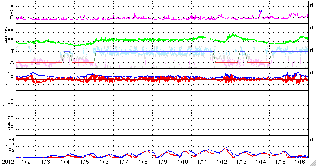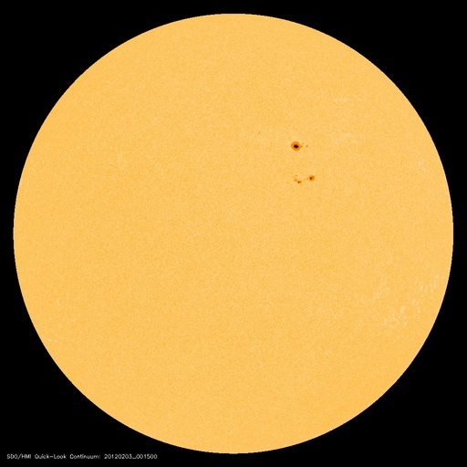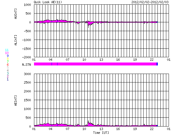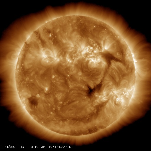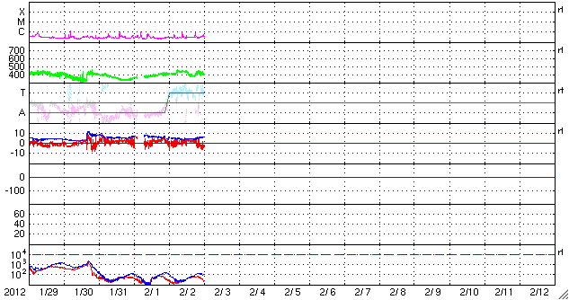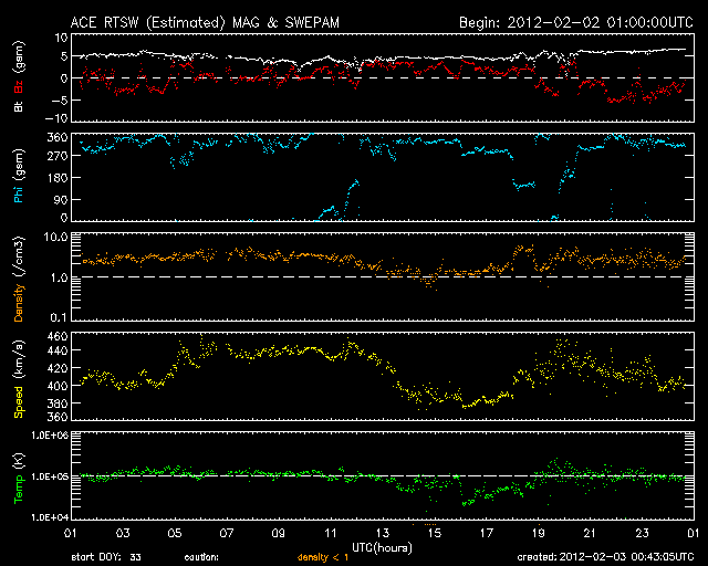2012/ 2/ 3 09:43 更新 太陽風は平均的な速度で、磁気圏は概ね静穏です。太陽も静かです。 担当 篠原 太陽風は、400km/秒台前半と平均的な速度で安定しています(ACEの黄色線)。 27日周期の図で、前周期の1月6日以降に見られた変化が回帰してきたようです。 そう考えて、27日周期の図の速度の下のセクターのグラフを見比べると、 どちらも、このタイミングで「A(太陽風磁場の大まかな方向が太陽から地球向き)」から 「T(地球から太陽向き)」に切り替わっています。 この切り替わりの変化で何かが発生するということではありませんが、 太陽風の磁場の大きな構造も、27日前と同じような状態にある様です。 その太陽風の磁場の強度(ACEの白線)は、5nTと平均的な強さで安定しています。 南北成分(赤線)は小幅で北に振れたり(プラス)、南に振れたり(マイナス)しています。 AE指数のグラフは、小さな変化が時々見られる程度で、 磁気圏は概ね静かな状態にあります。 27日周期の図で前周期を見ると、400km/秒台前半の太陽風速度は、 1月11日頃まで続いています。 現在の周期に合わせると、 2月7日頃まで現在の太陽風の状態が続く可能性があります。 一方、SDO衛星AIA197では、小さなコロナホールが、 太陽の西半球側に見えています。 明日、明後日にこの影響が少しやって来て、 太陽風の速度がやや上がったり、磁場が強まったりするかもしれません。 太陽のフレア活動は低調です。 Bクラスの変化が見られた程度です。 黒点の見え方も、だいぶ寂しくなっています。 SDO衛星のAIA193カメラによる太陽コロナの様子 (c) SDO (NASA) ![]() SDO衛星による太陽の可視光写真。マウスの矢印を写真に重ねると、黒点番号付きの写真に切り替わります。 (c) SDO (NASA) ![]() ACEが観測した太陽風の磁場(1番上の枠、白線は全体の強度、赤線は南北成分) および、太陽風の密度(3番目の橙線)、速度(4番目の黄線) (c) NOAA/SWPC ![]() リアルタイムAE指数 下段のAEグラフの値が高くなると、オーロラ活動が活発化しています。 (c) 京都大学, NICT ![]() 27日の太陽周期に合わせたデータプロット 太陽が同じ面を地球に向けていた27日前の変化から、今後を予想することができます。 (c) 作図:宇宙天気ニュース