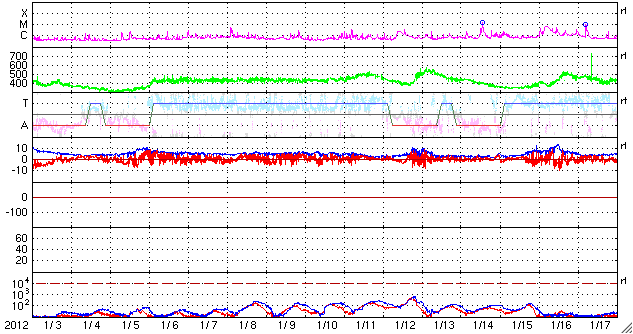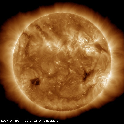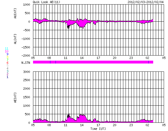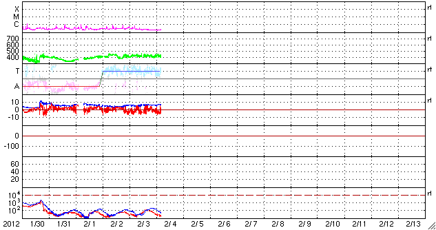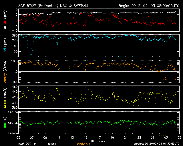 2012/ 2/ 4 13:30 更新 400km/秒台前半の太陽風が続いています。太陽は黒点も減り、フレア活動は静かです。 担当 篠原 太陽風は、400〜440km/秒と平均的な速度で安定しています。 27日周期の図の前周期の変化とよく似た状態が続いています。 磁場強度は5nTとこちらも平均的な状態です。 南北成分は、南に北にと変化していて、 磁気圏のオーロラ活動をもたらしています。 AE指数のグラフでは、200〜500nTの小中規模の変化があちこちで起きています。 派手ではありませんが、 ある程度のオーロラが極域では見られているのではないでしょうか。 27日周期の周期性がこのまま続くとすると、 太陽風はもう3〜4日程度現在の様な速度が続きそうです。 その後は、SDO衛星AIA193の南東(左下)にある 小さなコロナホールの影響が考えられます。 前周期の1月13日の速度上昇の回帰です。 そのまま今期に持ってくると、2月9日になります。 一方、太陽はとても静かです。 黒点群は、1410群と1413群の2つになってしまいました。 STEREO Behindで東側に先回りしても、目立った活動領域はなく、 新しい黒点群の発生を待つことになるのかもしれません。 X線のグラフも、静穏レベルがどんどん低くなって、 B1の強さまで下がっています。 比べ方が難しいですが、ざっと見た印象で、 これだけしっかり下がっているのは、昨年の8月以来だと思います。 太陽活動がこれで終わりという意味ではありませんので、 今後の高まりに注目してください。 SDO衛星のAIA193カメラによる太陽コロナの様子 (c) SDO (NASA) ![]() SDO衛星による太陽の可視光写真。マウスの矢印を写真に重ねると、黒点番号付きの写真に切り替わります。 (c) SDO (NASA) ![]() ACEが観測した太陽風の磁場(1番上の枠、白線は全体の強度、赤線は南北成分) および、太陽風の密度(3番目の橙線)、速度(4番目の黄線) (c) NOAA/SWPC ![]() リアルタイムAE指数 下段のAEグラフの値が高くなると、オーロラ活動が活発化しています。 (c) 京都大学, NICT ![]() 27日の太陽周期に合わせたデータプロット 太陽が同じ面を地球に向けていた27日前の変化から、今後を予想することができます。 (c) 作図:宇宙天気ニュース