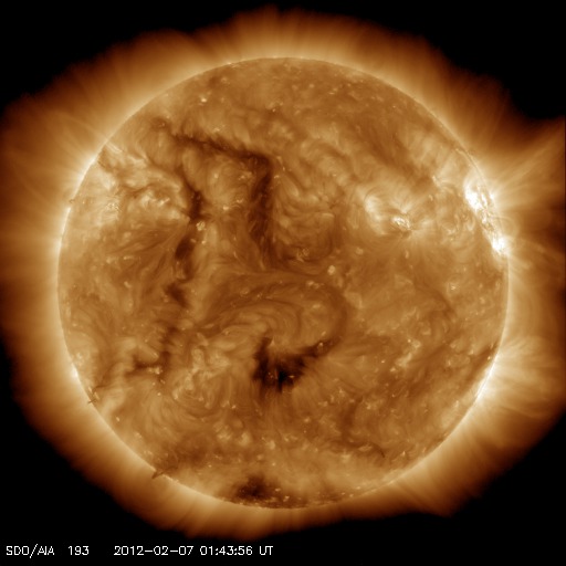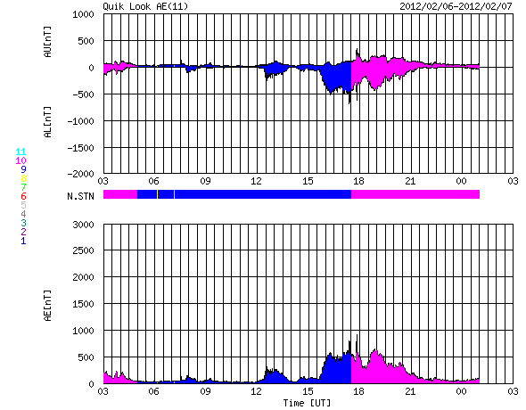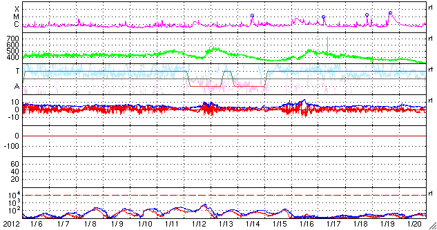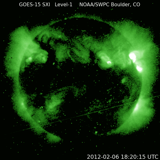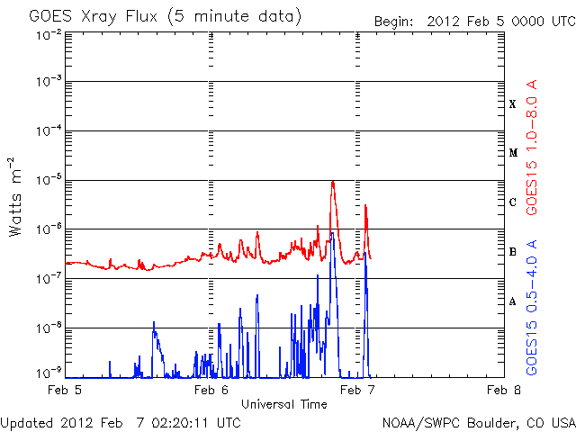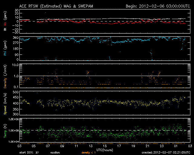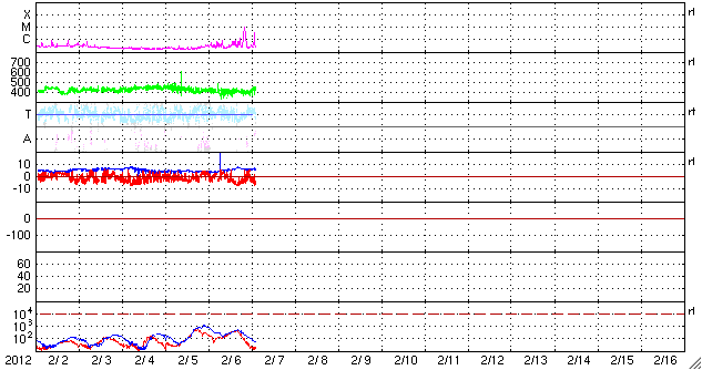2012/ 2/ 7 11:21 更新 M1.0の中規模フレアが発生しました。太陽風は400km/秒台前半の速度が続いています。 担当 篠原 昨日のニュースの直後から、 太陽の西の端に沈みかけた1410黒点群の活動度が高まり、 X線のグラフにBクラスの変化が増えました。 そして、今朝、7日4時半(世界時6日19時半)にM1.0の中規模フレアが発生しました。 その様子を、GOES衛星のX線カメラの動画で紹介します。 1410黒点群は、その後、7日10時(世界時7日1時)にも、 C3.5の小規模フレアを起こしています。 1410黒点群は太陽の西に沈みかけているので、 今後更に活動が強まったとしても地球への影響は小さいでしょう。 太陽風は、400〜430km/秒の速度が安定して続いています。 磁場強度も、ACEのグラフの幅が広くなっていて読み取りにくいですが、 5nTから少し強まっているくらいで安定しています。 磁場の南北成分も、南寄りの傾向が続いていて、 特にACEのグラフの中頃では、-5nTくらいの南向きが4〜5時間続き、 そこで、磁気圏の活動が強まっています。 AE指数のグラフでは、この時間帯に500nT程度の変動が観測されています。 27日周期の図の前周期の変化によると、 今日いっぱいくらいで現在の太陽風の状態は終わって、 一旦速度が下がる可能性があります。 その後、10日頃にコロナホールの影響がやって来るかもしれません。 ここしばらく高まっていたオーロラの活動度は、 一旦下がってしまうことになりそうです。 GOES-15のX線カメラによる、太陽の西の端で発生したM1.0のフレア。 (c) NOAA/SWPC 、(動画加工 : 宇宙天気ニュース) ![]() SDO衛星のAIA193カメラによる太陽コロナの様子 (c) SDO (NASA) ![]() SDO衛星による太陽の可視光写真。マウスの矢印を写真に重ねると、黒点番号付きの写真に切り替わります。 (c) SDO (NASA) ![]() GOES衛星の太陽X線データ (c) NOAA/SWPC ![]() ACEが観測した太陽風の磁場(1番上の枠、白線は全体の強度、赤線は南北成分) および、太陽風の密度(3番目の橙線)、速度(4番目の黄線) (c) NOAA/SWPC ![]() リアルタイムAE指数 下段のAEグラフの値が高くなると、オーロラ活動が活発化しています。 (c) 京都大学, NICT ![]() 27日の太陽周期に合わせたデータプロット 太陽が同じ面を地球に向けていた27日前の変化から、今後を予想することができます。 (c) 作図:宇宙天気ニュース
